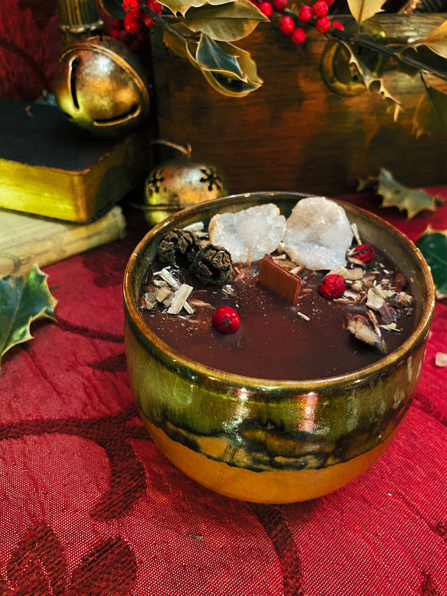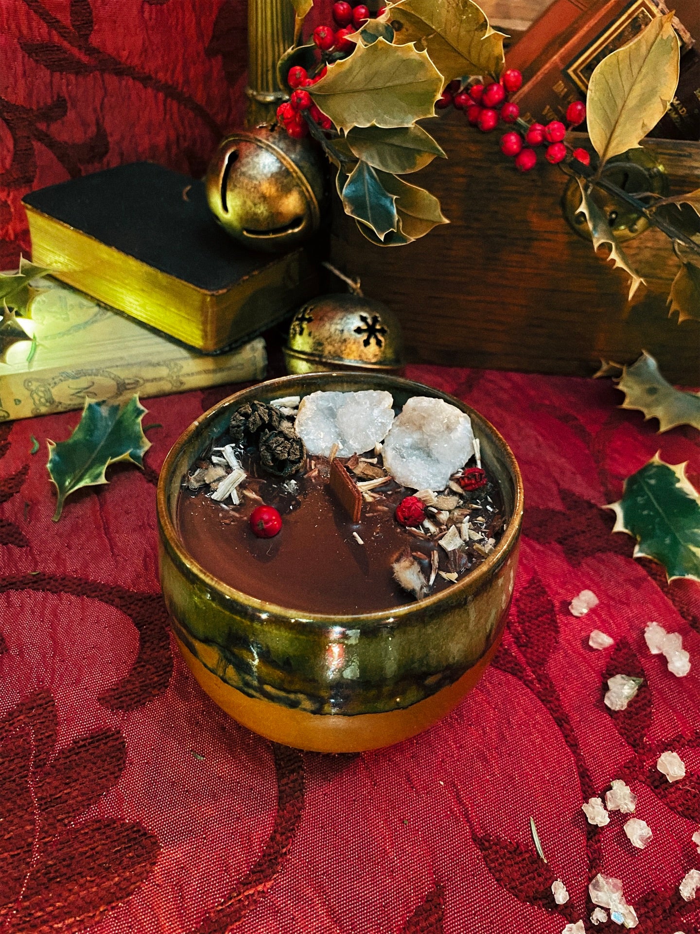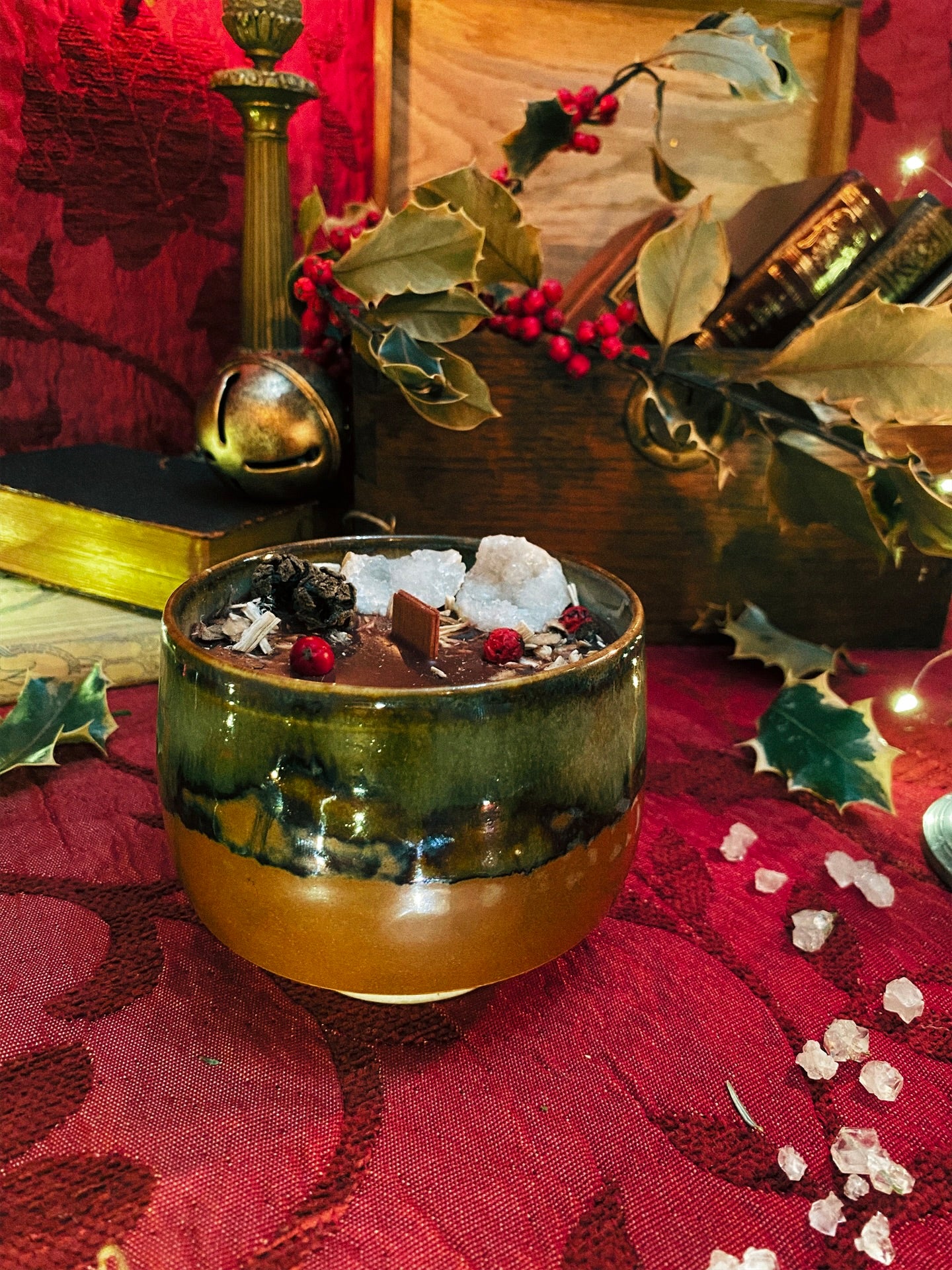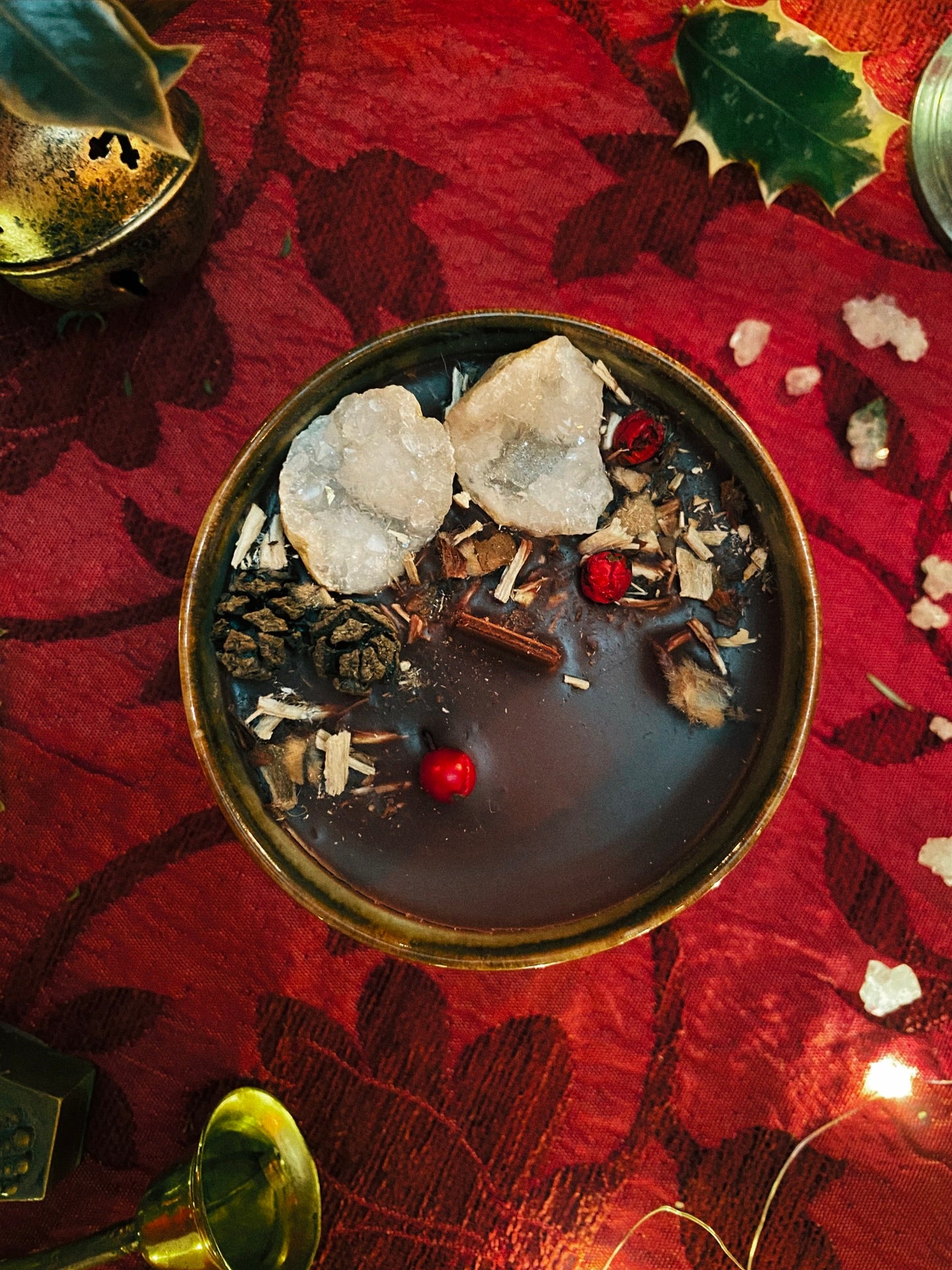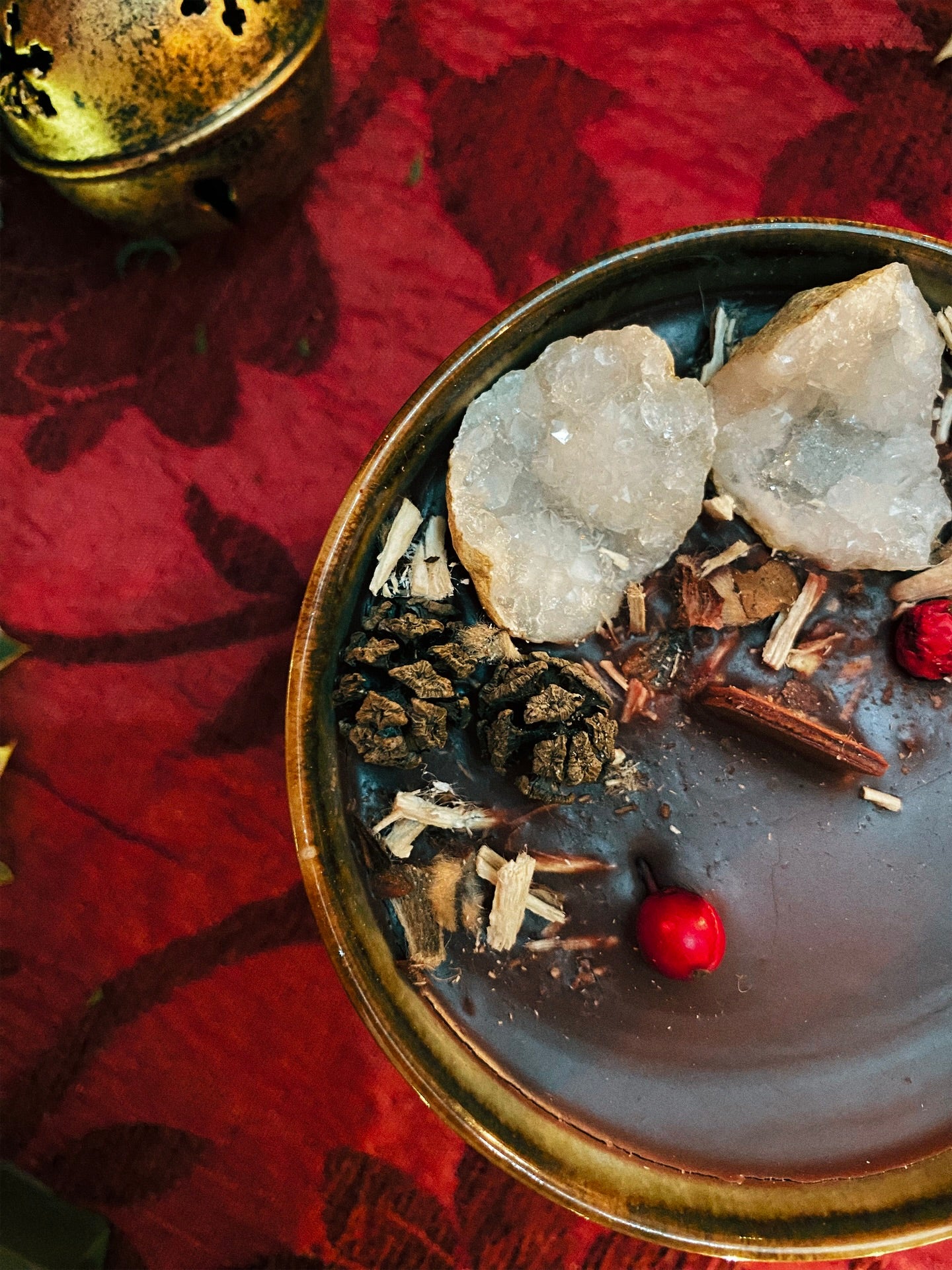 Cette flamme est ornée de plantes consacrées aux vertus spirituelles puissantes. Pierres issues de mines éthiques, plantes cueillies avec soin ou bio. 340gr de cire de coco 100 % naturelle, végane, sans OGM. Mèche en coton bio ou bois d’érable. 55h de combustion. ⌀9,5cm/8,5cm.