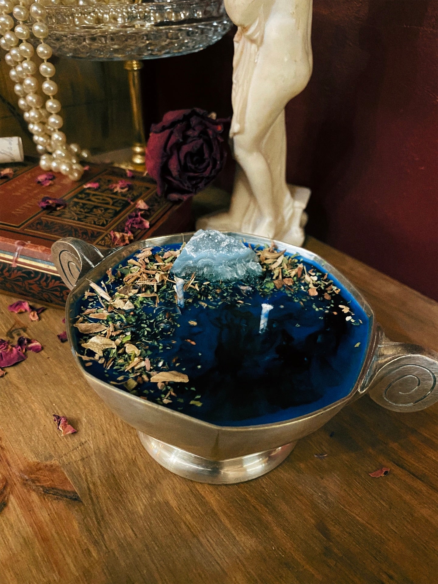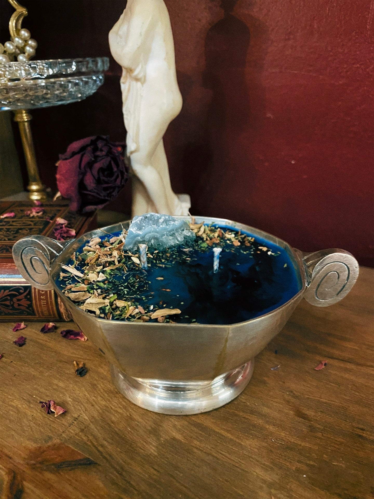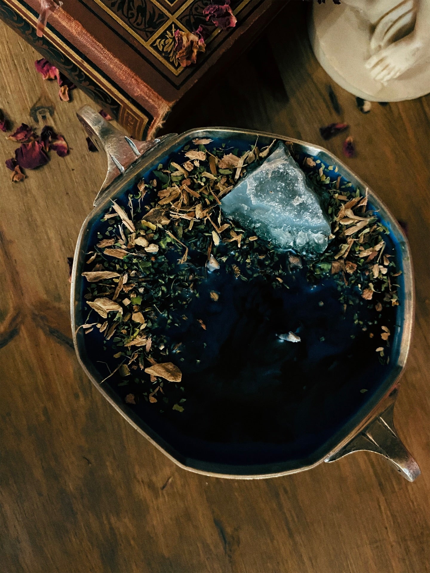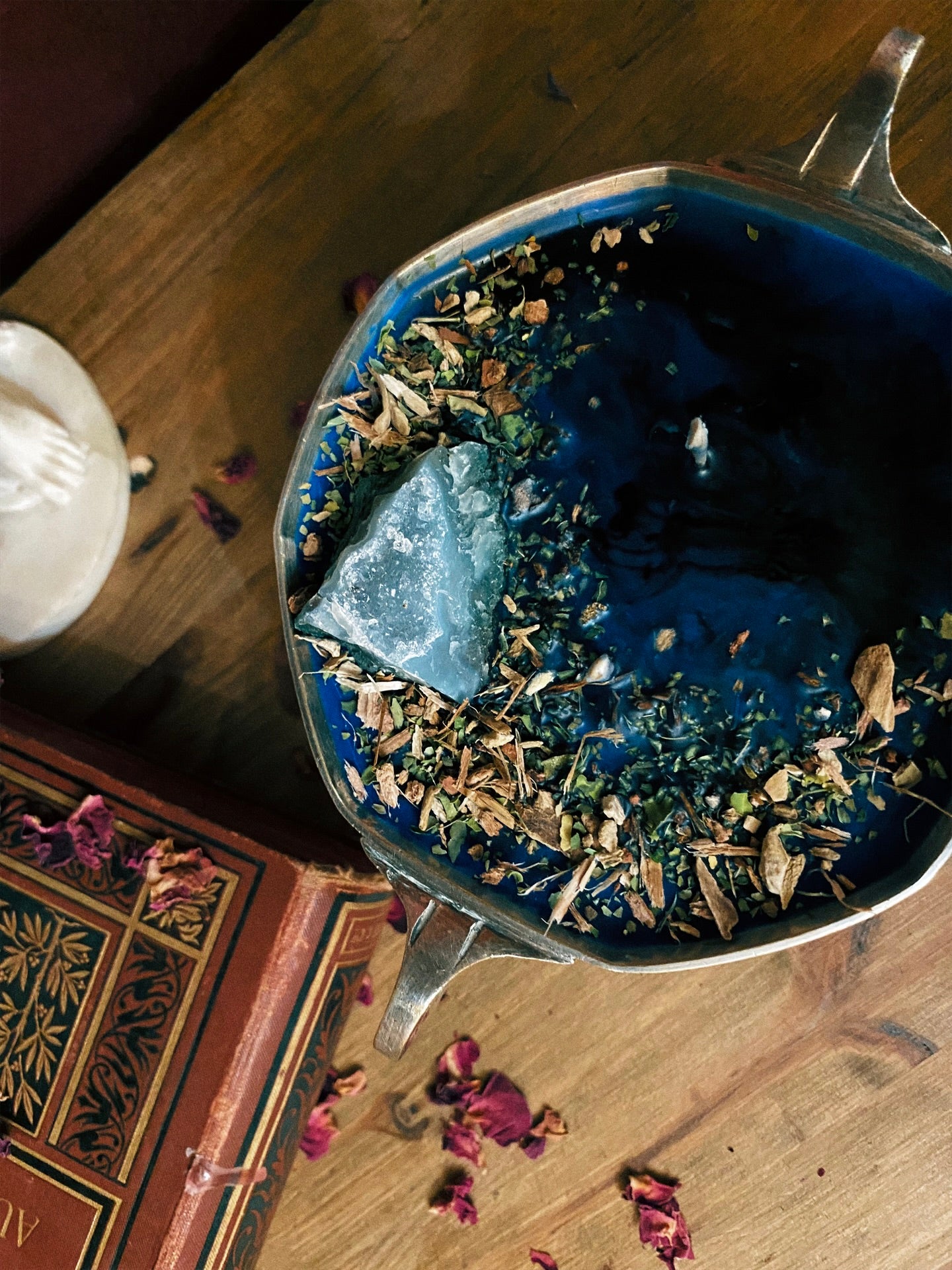 Cette flamme est ornée d’une améthyste et de plantes consacrées aux vertus spirituelles puissantes. Pierres issues de mines éthiques, plantes cueillies avec soin ou bio. 210gr de cire de coco 100 % naturelle, végane, sans OGM. Mèche en coton bio ou bois d’érable. 30h de combustion. ⌀14cm/8cm.