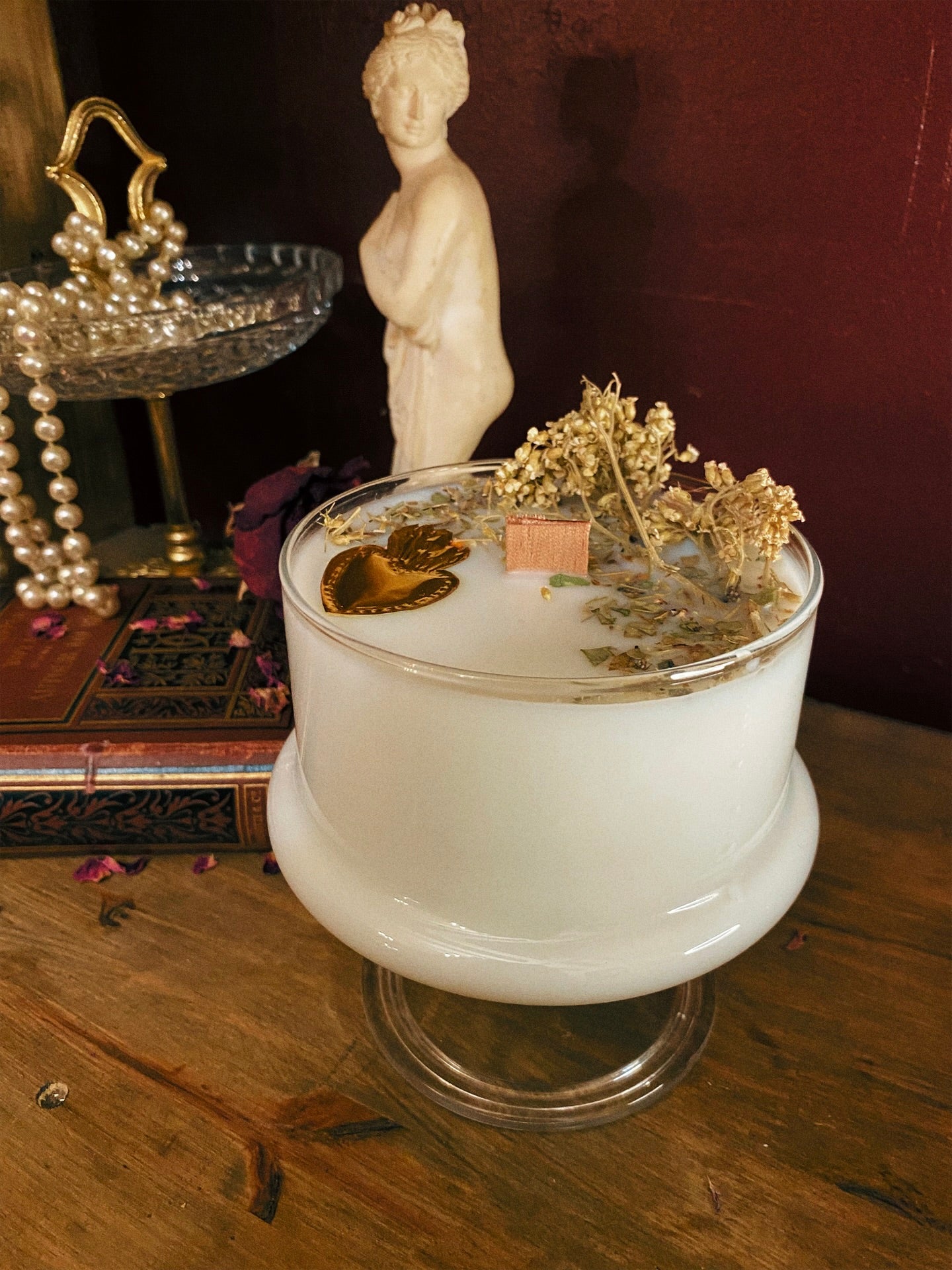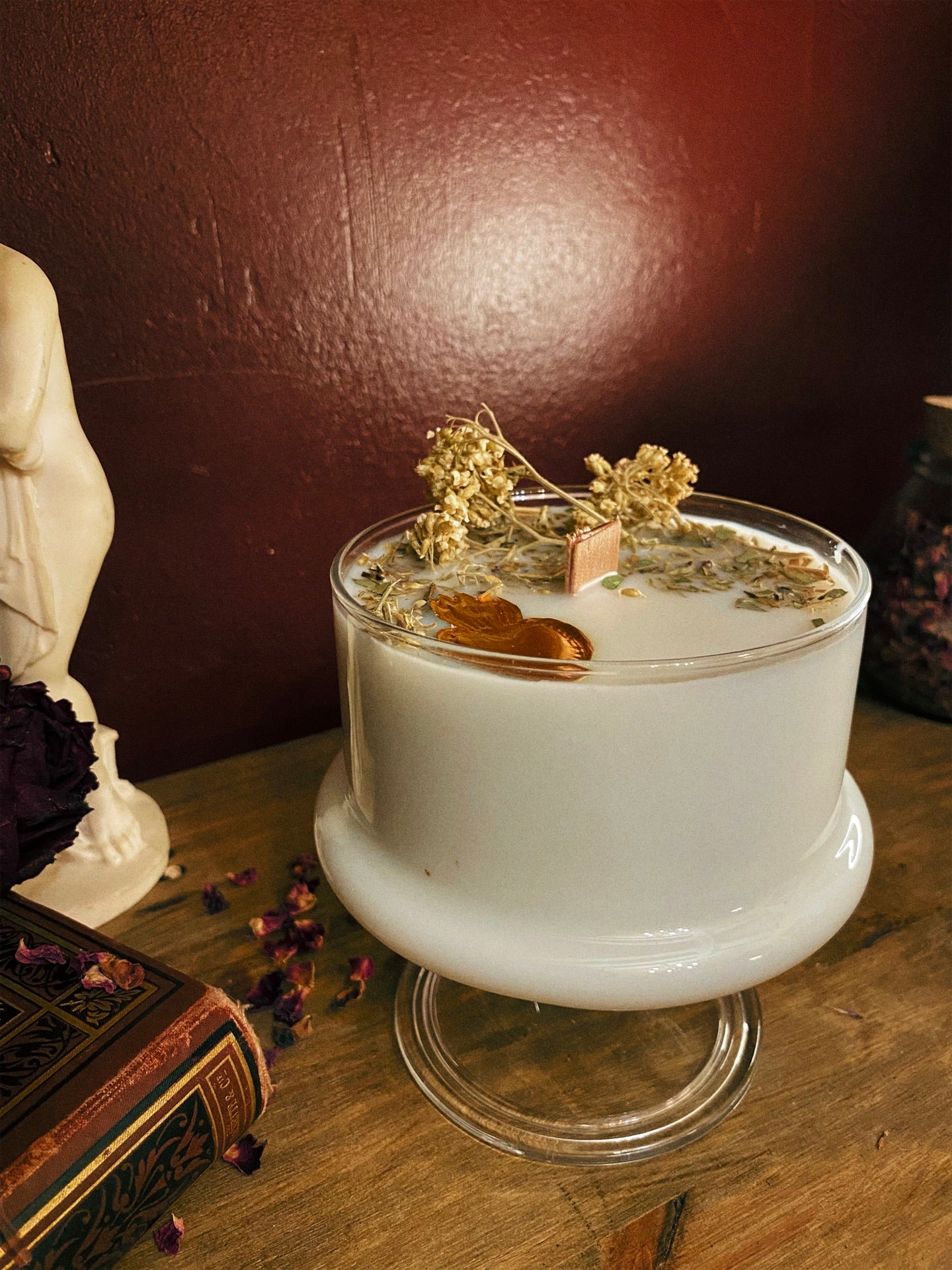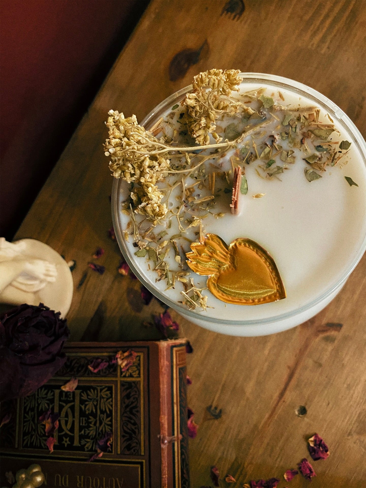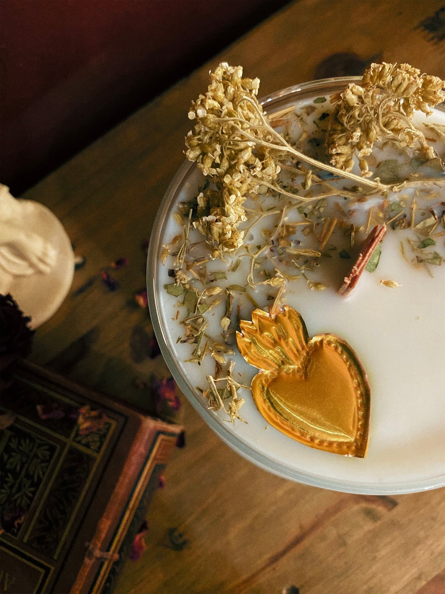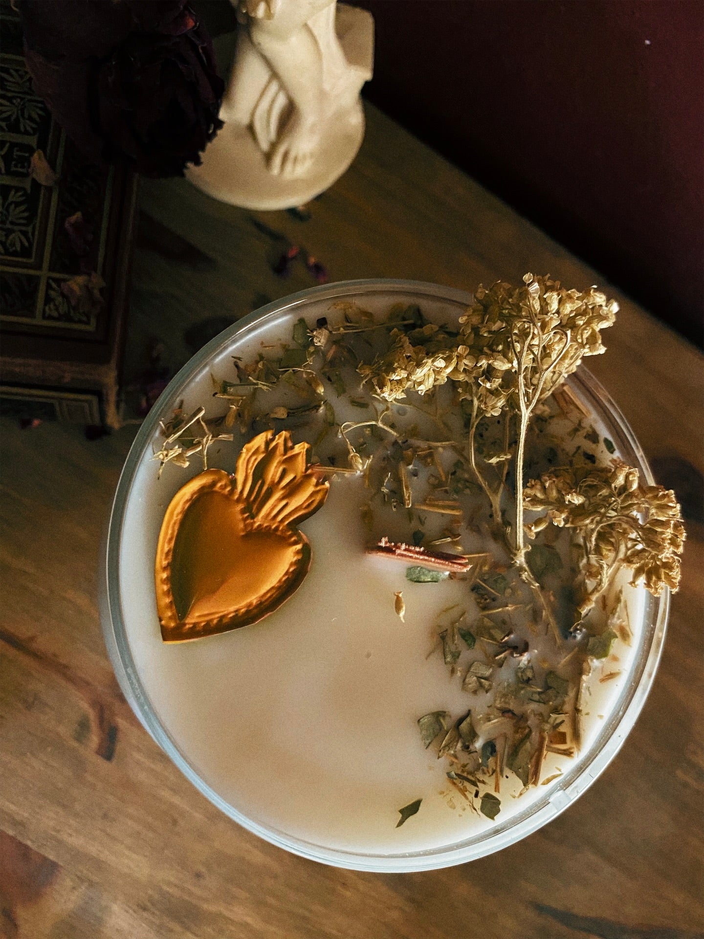 Cette flamme est ornée d‘un mini ex-voto fait main et de plantes consacrées aux vertus spirituelles puissantes. Pierres issues de mines éthiques, plantes cueillies avec soin ou bio. 418gr de cire de coco 100 % naturelle, végane, sans OGM. Mèche en coton bio ou bois d’érable. 70h de combustion. ⌀10cm/14cm.