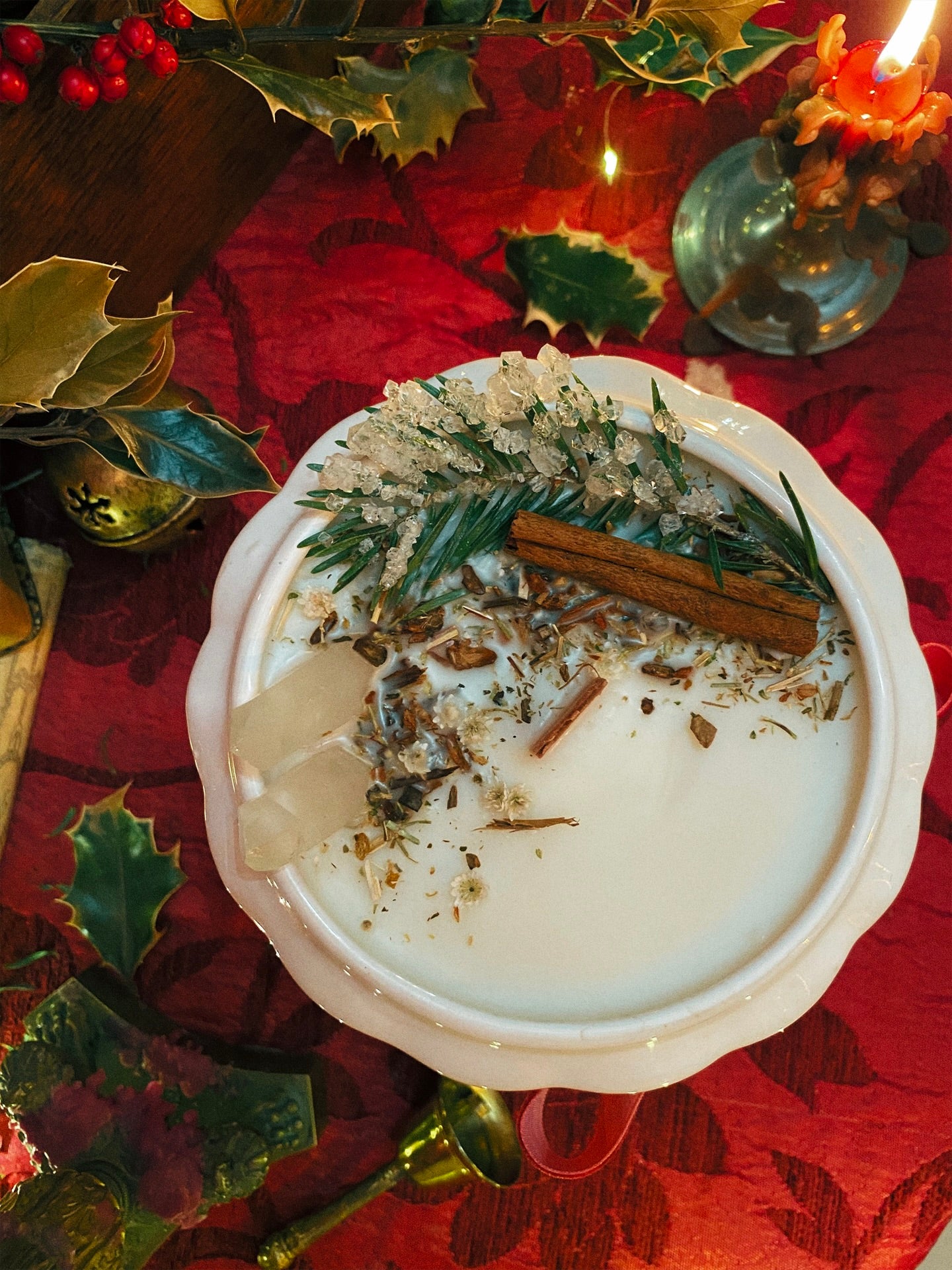 Cette flamme est ornée de plantes consacrées aux vertus spirituelles puissantes. Pierres issues de mines éthiques, plantes cueillies avec soin ou bio. 624gr de cire de coco 100 % naturelle, végane, sans OGM. Mèche en coton bio ou bois d’érable. 80h de combustion. ⌀12cm/16cm.