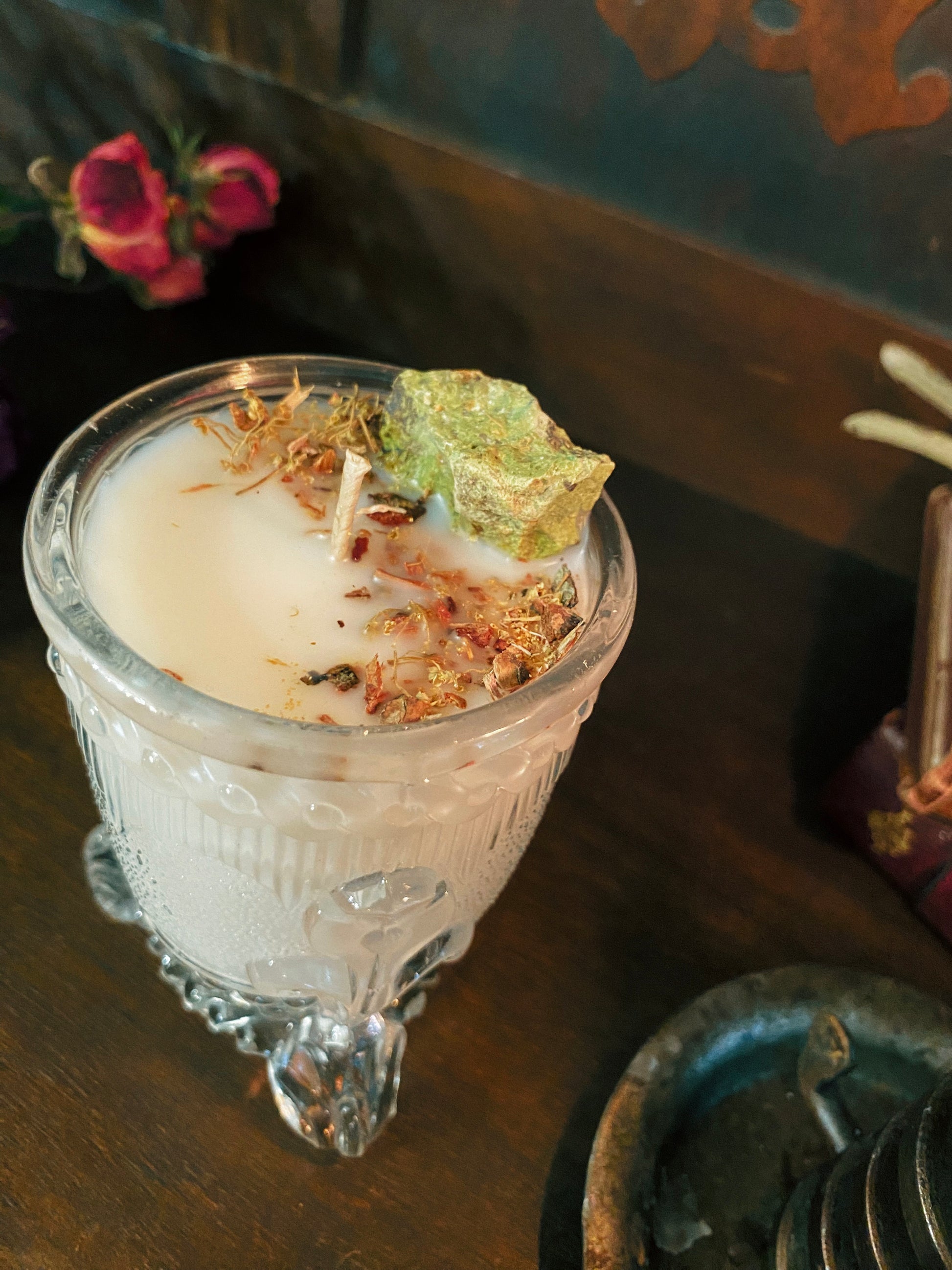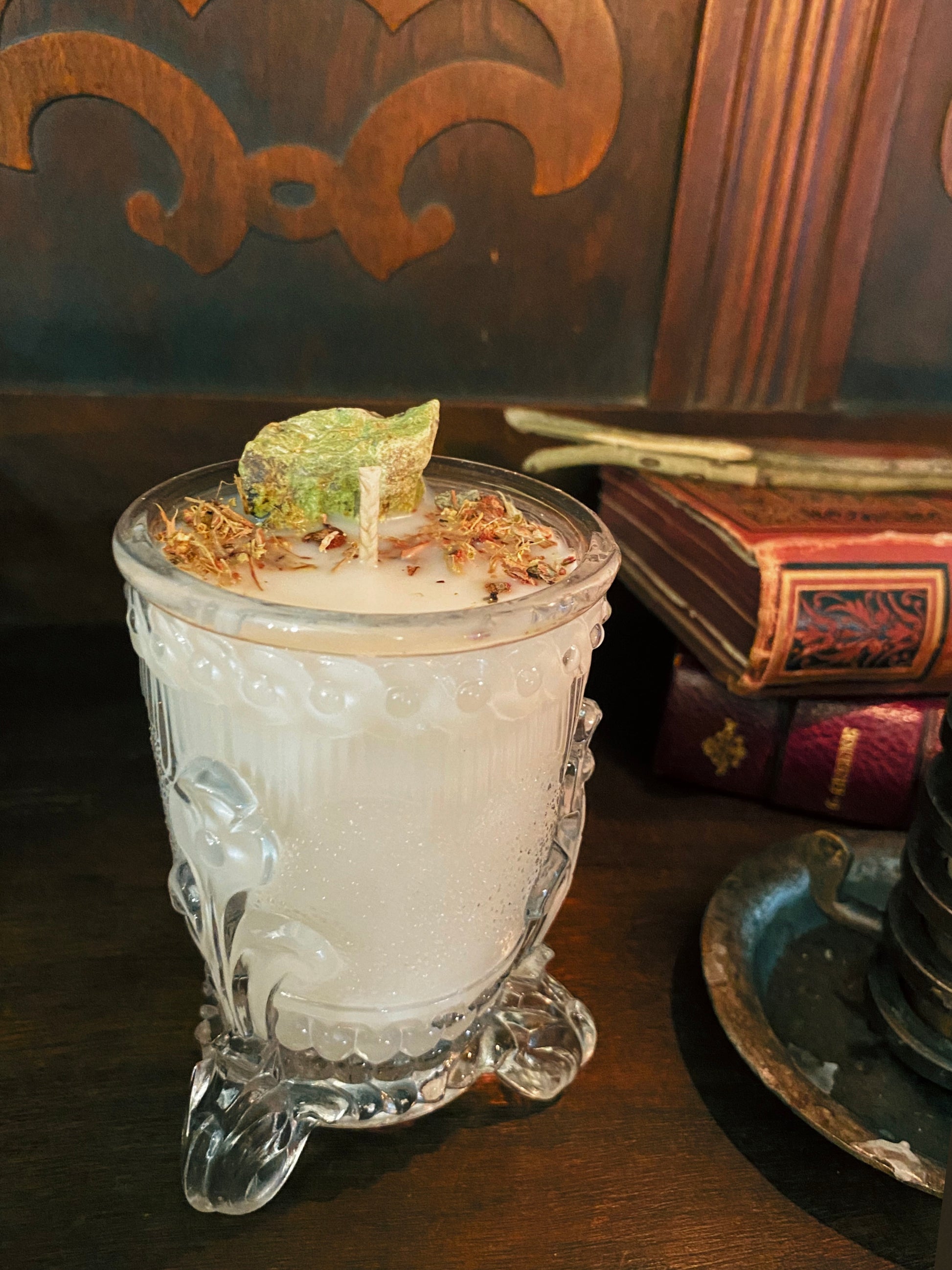 Ornée d’une opale verte et de plantes consacrées aux vertus spirituelles, cette flamme est accompagnée d’un livret détaillant son histoire, ses symboles et ses secrets. Pierres issues de mines éthiques, plantes cueillies avec soin ou bio. 138g de cire de coco 100 % naturelle, végane, sans OGM. Mèche en coton bio ou bois d’érable. 17h de combustion. ⌀7cm/11cm.