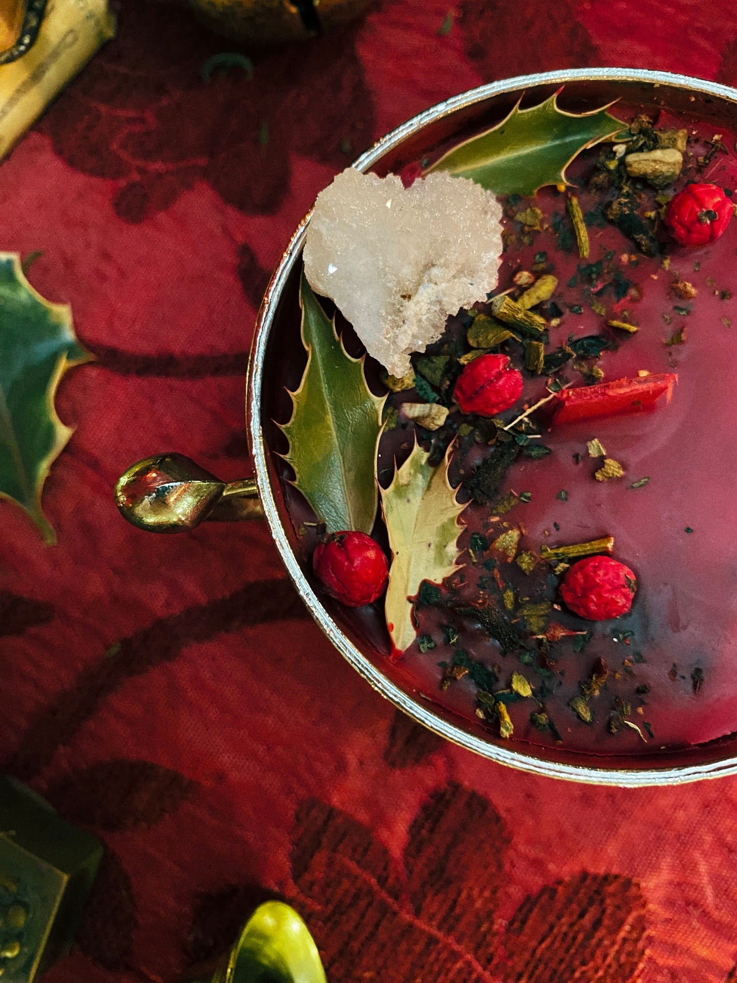 Cette flamme est ornée d‘un morceau de géode et de plantes consacrées aux vertus spirituelles puissantes. Pierres issues de mines éthiques, plantes cueillies avec soin ou bio. 160gr de cire de coco 100 % naturelle, végane, sans OGM. Mèche en coton bio ou bois d’érable. 25h de combustion. ⌀8,5cm/7,5cm.