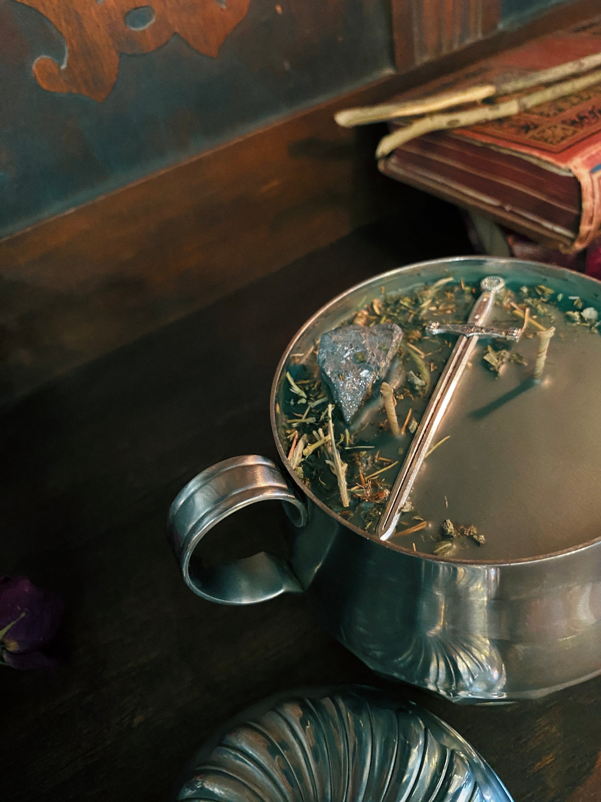 Ornée d‘une hématite et de plantes consacrées aux vertus spirituelles, cette flamme est accompagnée d’un livret détaillant son histoire, ses symboles et ses secrets. Pierres issues de mines éthiques, plantes cueillies avec soin ou bio. 413g de cire de coco 100 % naturelle, végane, sans OGM. Mèche en coton bio ou bois d’érable. 70h de combustion. ⌀14cm/10cm.