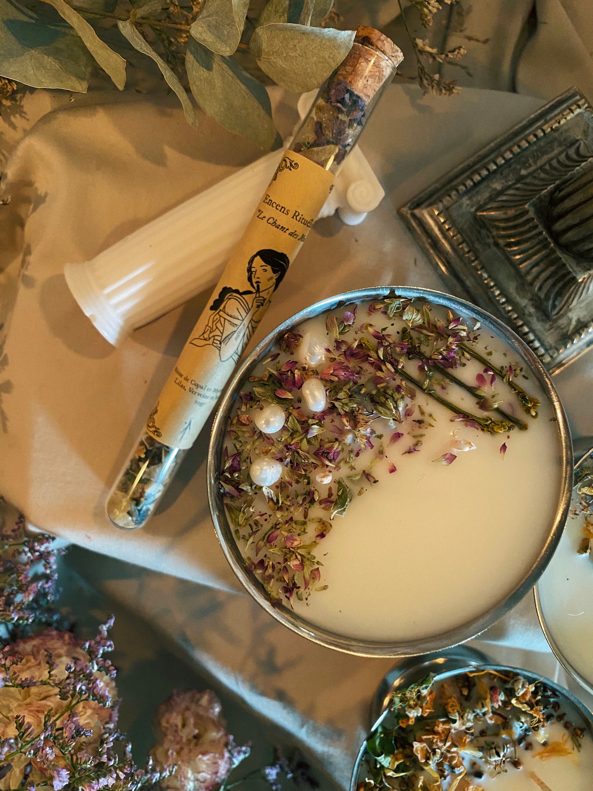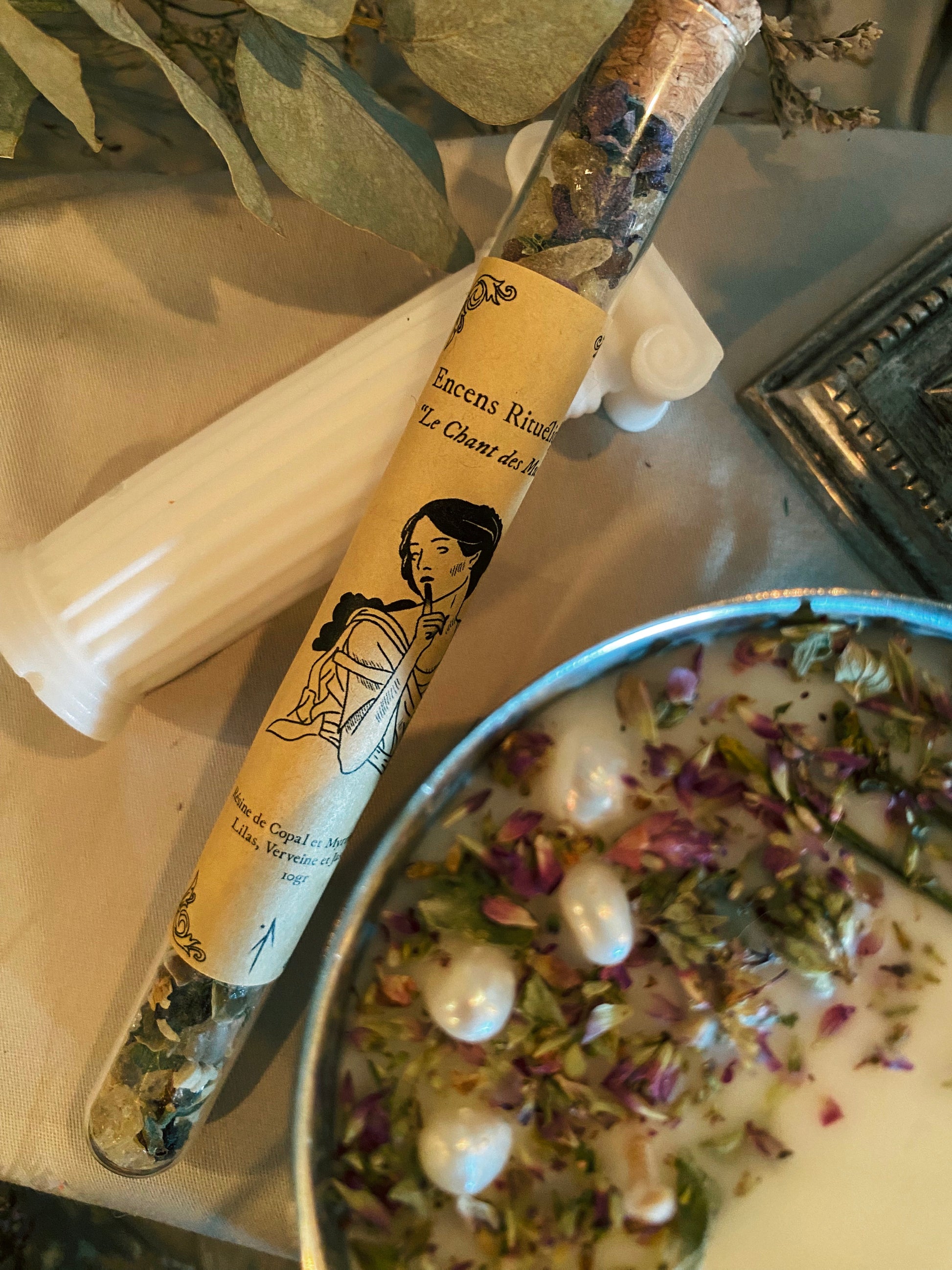 Mélange de copal, myrrhe rouge, lilas, verveine et jasmin. Il accompagne les rituels d’inspiration, de création et de connexion aux muses. À brûler sur un charbon avant d’écrire, de composer, ou de méditer : il clarifie l’esprit, calme le mental, et crée un pont entre intuition et expression.