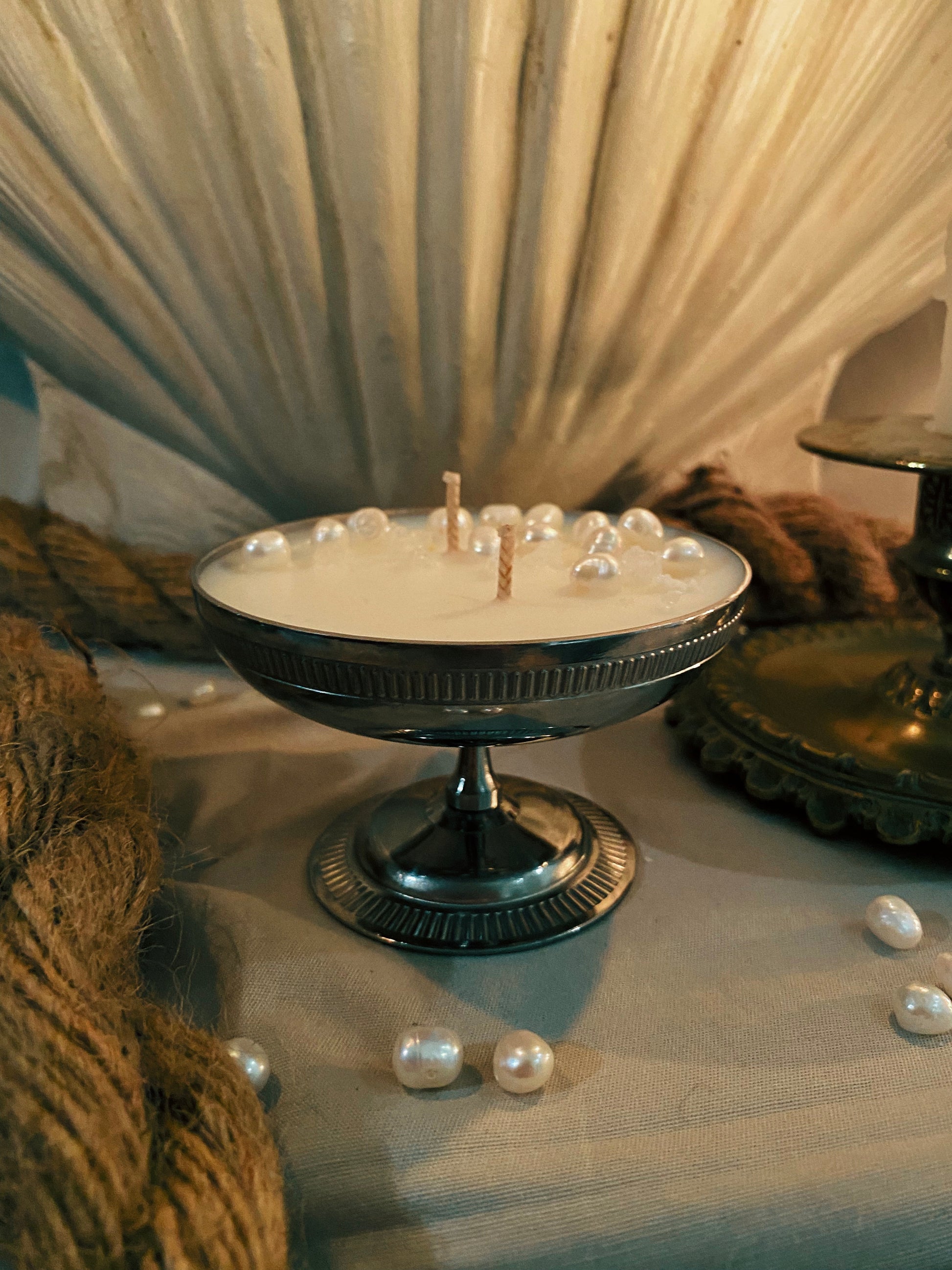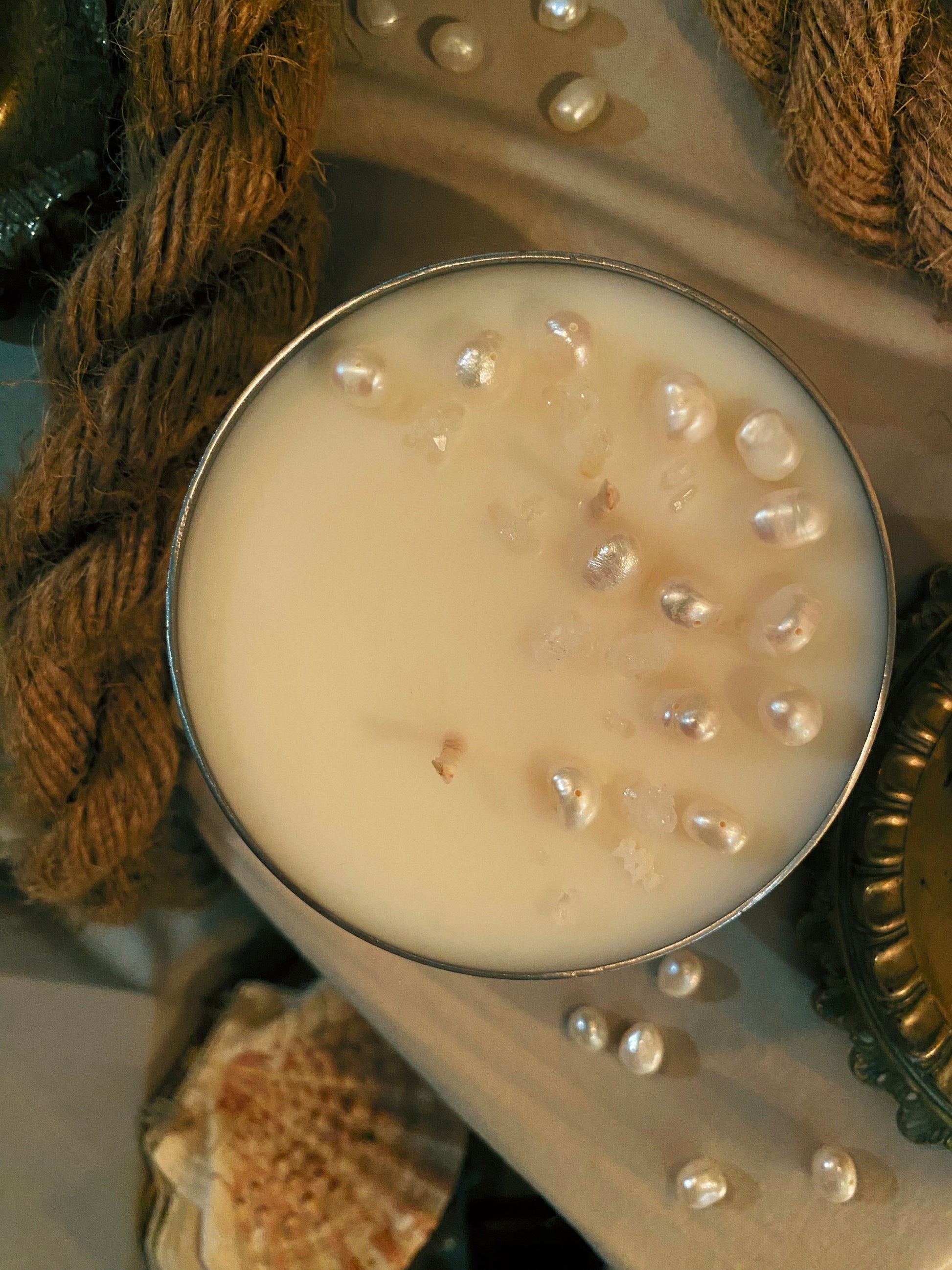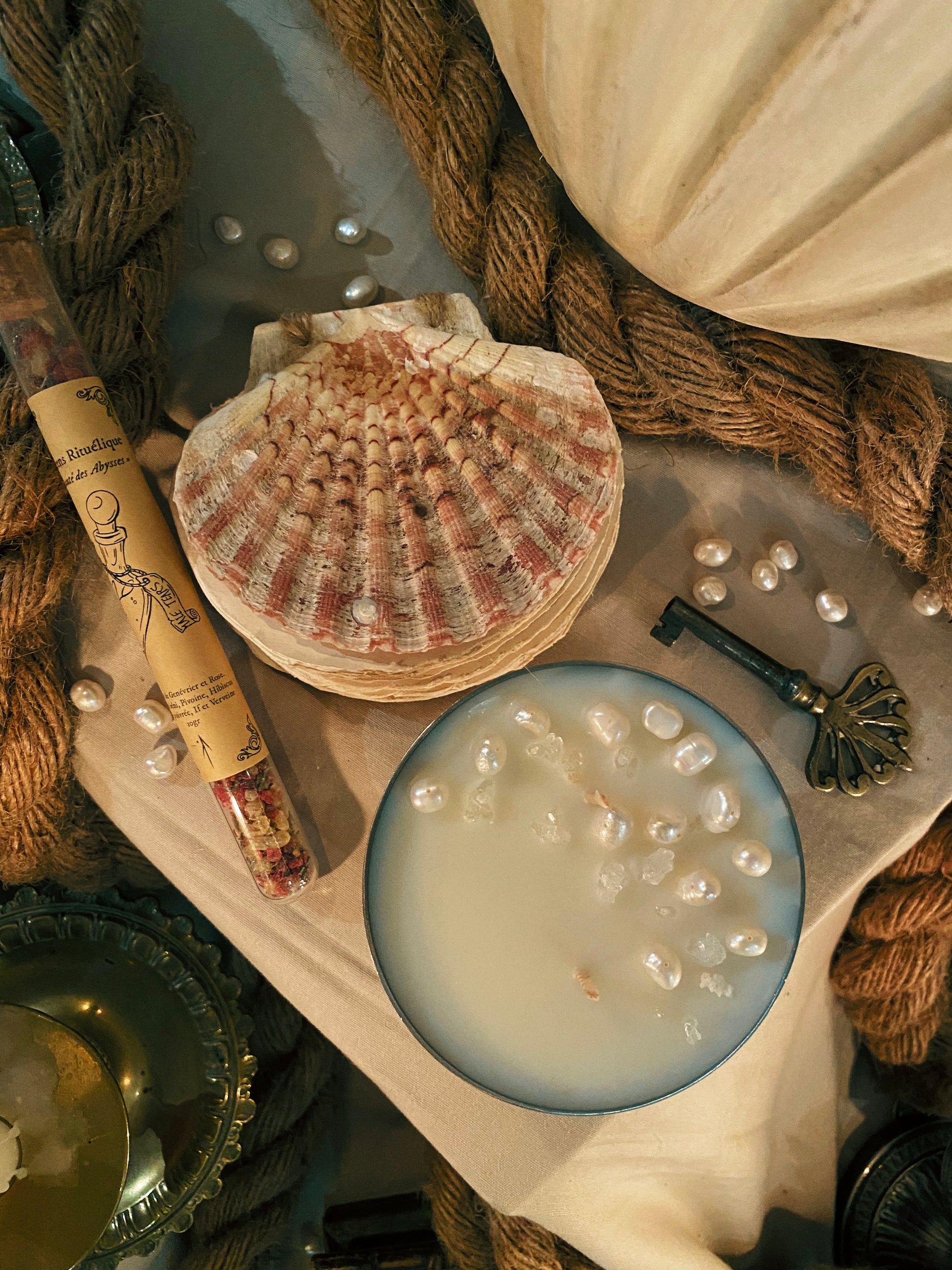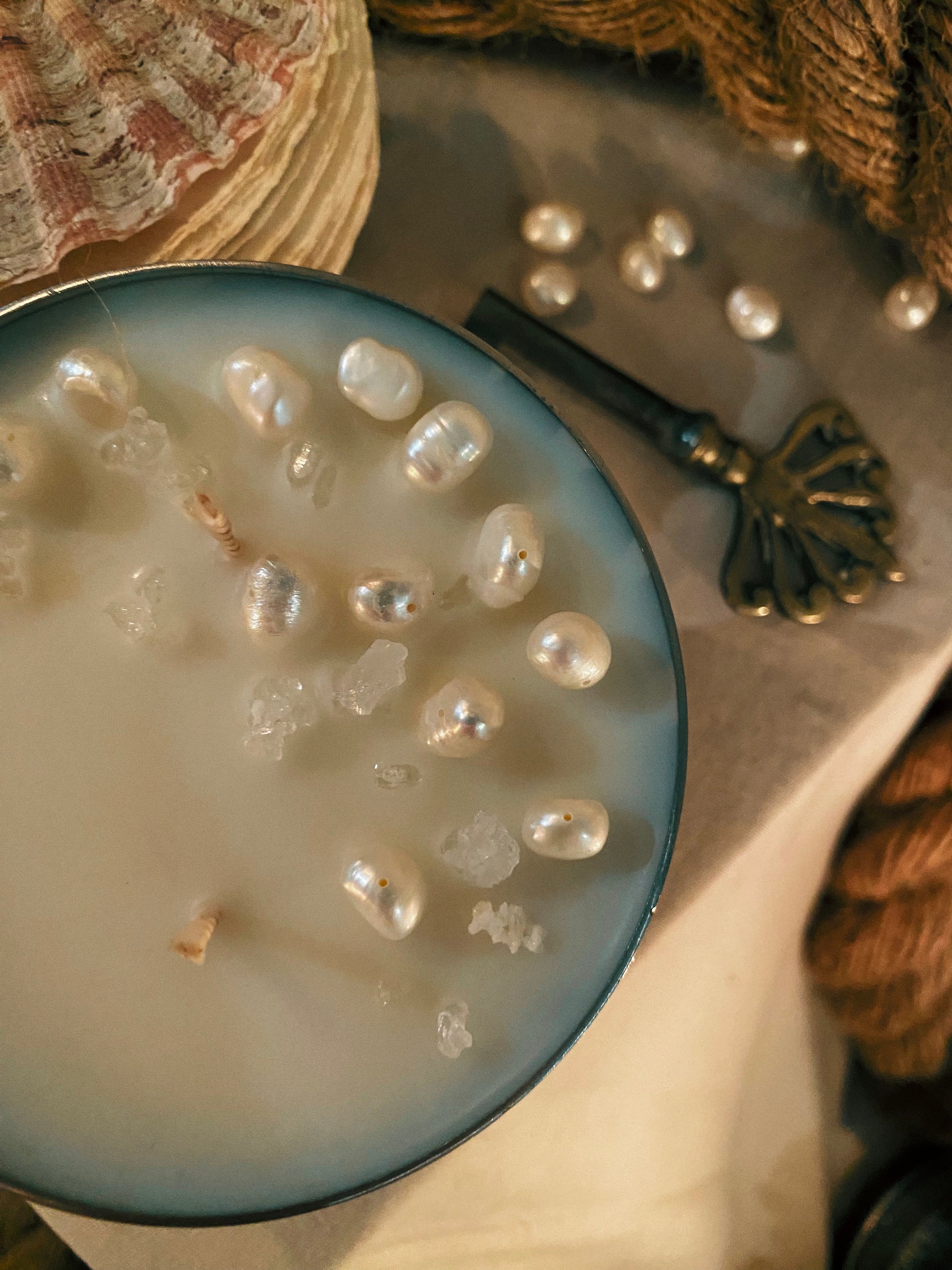 Une bougie ornée de perles d’eau douce, pour honorer ta voix retrouvée, ta vulnérabilité précieuse, ta lumière inextinguible.
