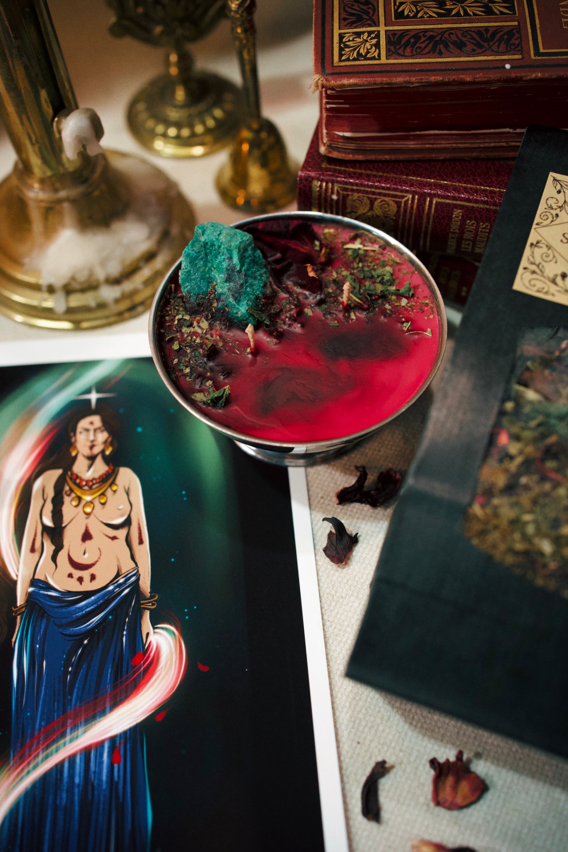 Cette bougie incarne cette esprit de cyclicité à travers un doux parfum de myrrhe, armoise et musc. Ornée d’une malachite du Pérou brute, de framboisier, d'ortie, de roses rouges et infusée de racines de guimauve, elle rassemble des éléments sacrés symbolisant l’équilibre, l'acceptation et la connexion aux cycles de nos Lunes. Avec une combustion enveloppante d’environ 12 heures, elle accompagnera vos rituels en honorant votre puissance intérieure. Une note explicative, incluant ses symboliques, son histoire et son sigil personnalisé, l’accompagne pour prolonger sa magie.