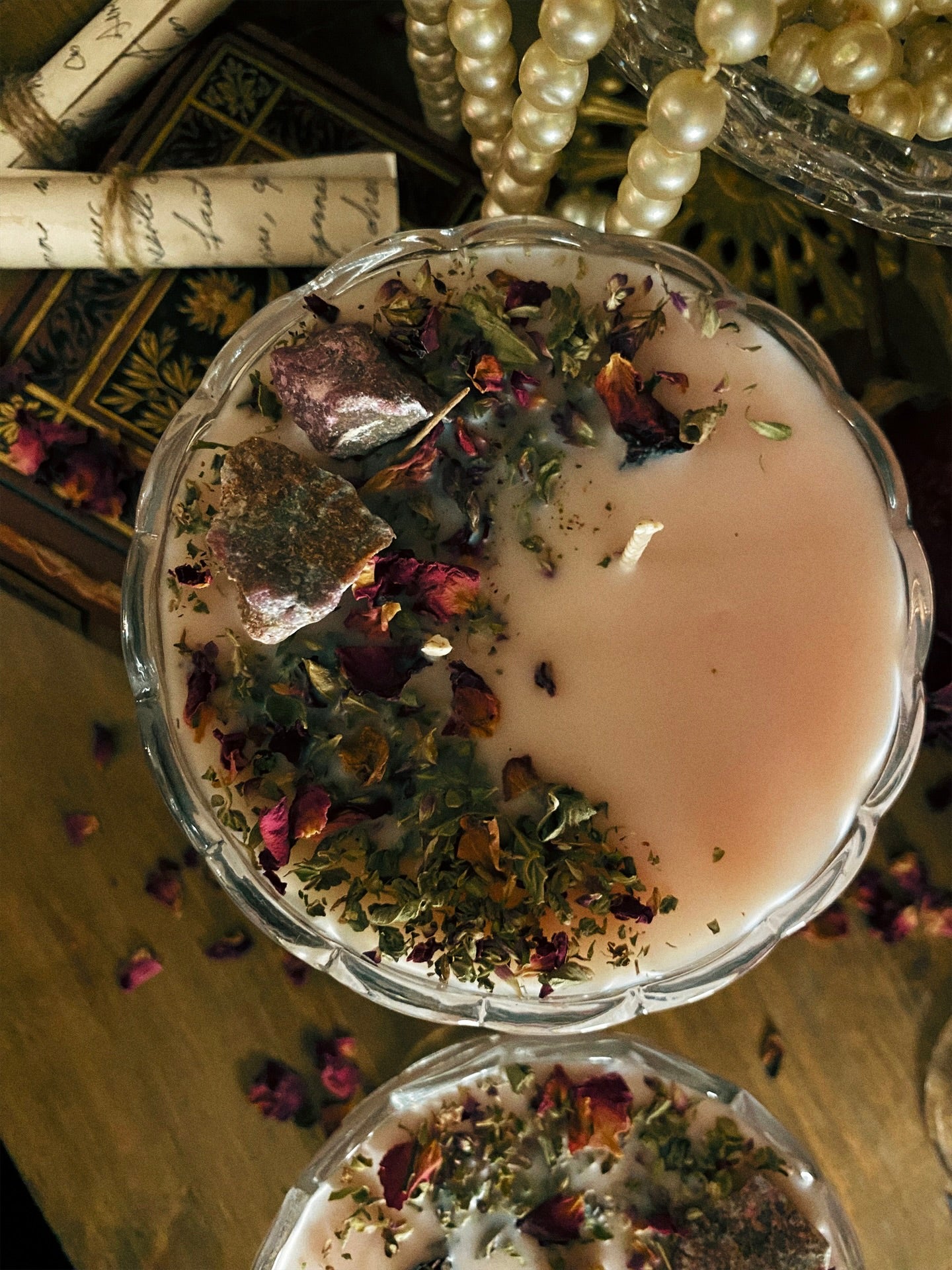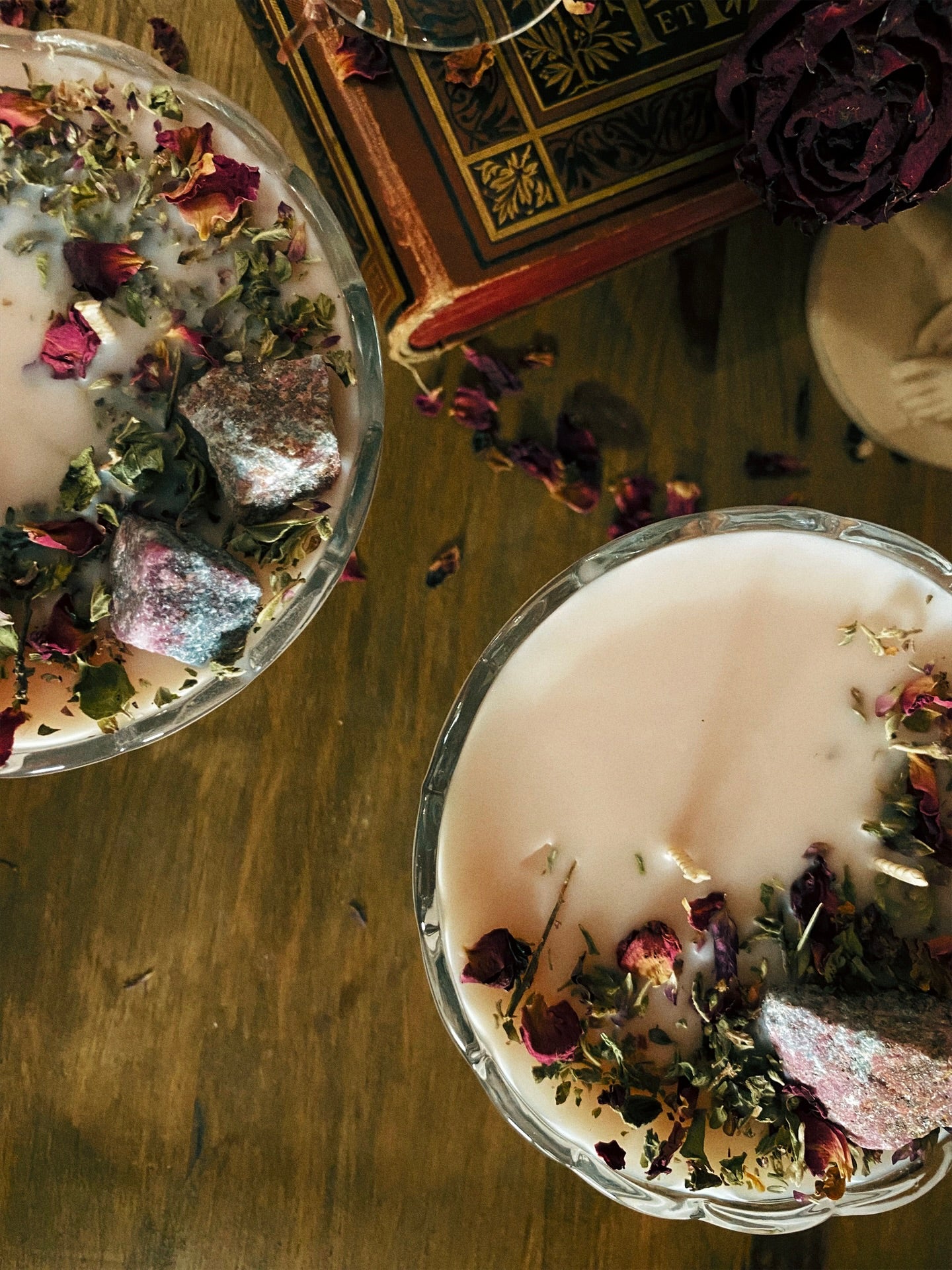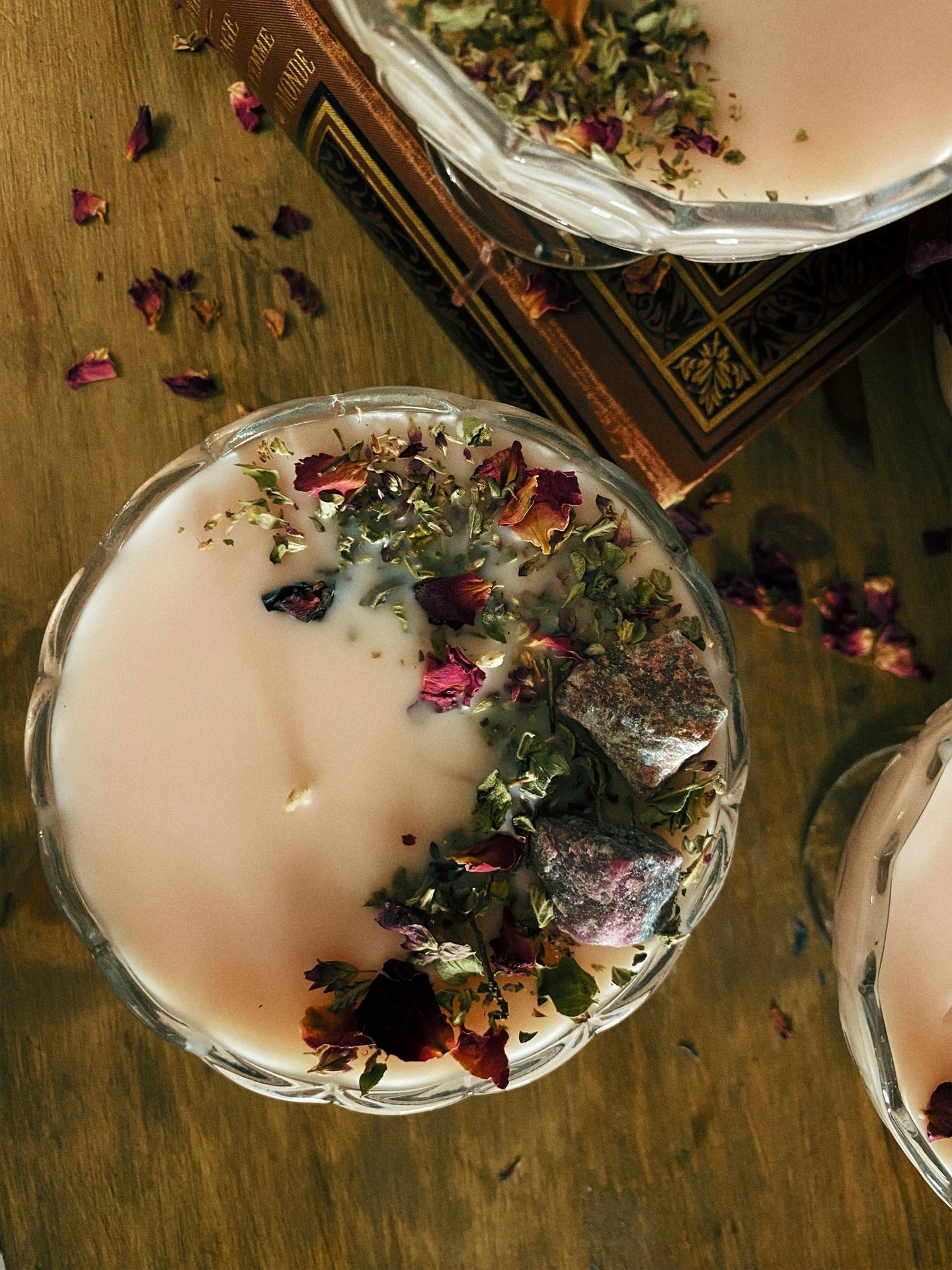 Cette flamme est ornée de rubis brutes et de plantes consacrées aux vertus spirituelles puissantes. Pierres issues de mines éthiques, plantes cueillies avec soin ou bio. 140gr de cire de coco 100 % naturelle, végane, sans OGM. Mèche en coton bio ou bois d’érable. 23h de combustion. ⌀10cm/8cm.