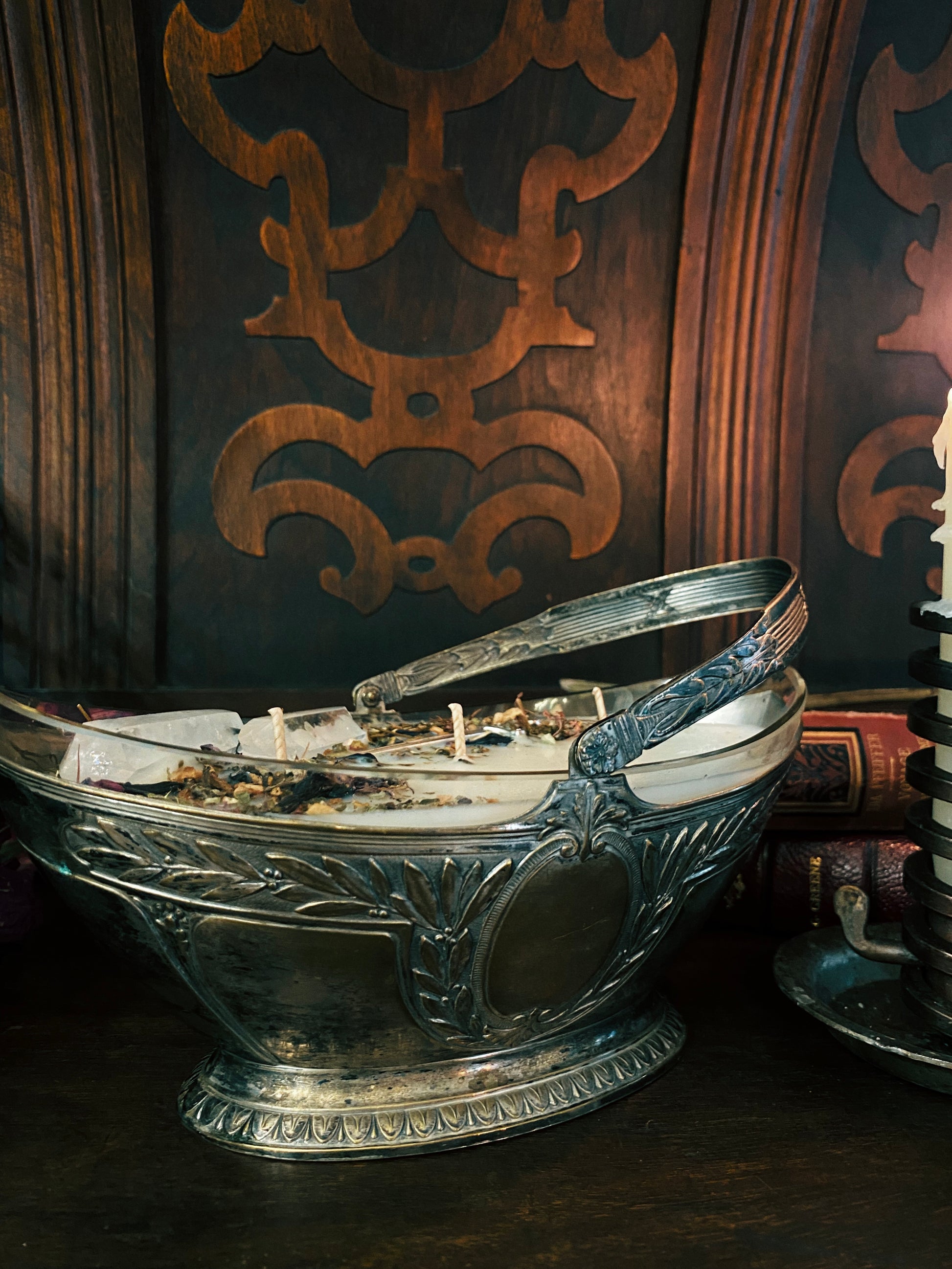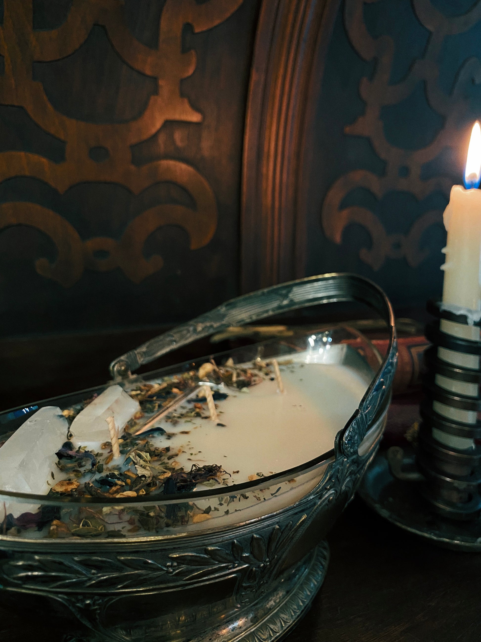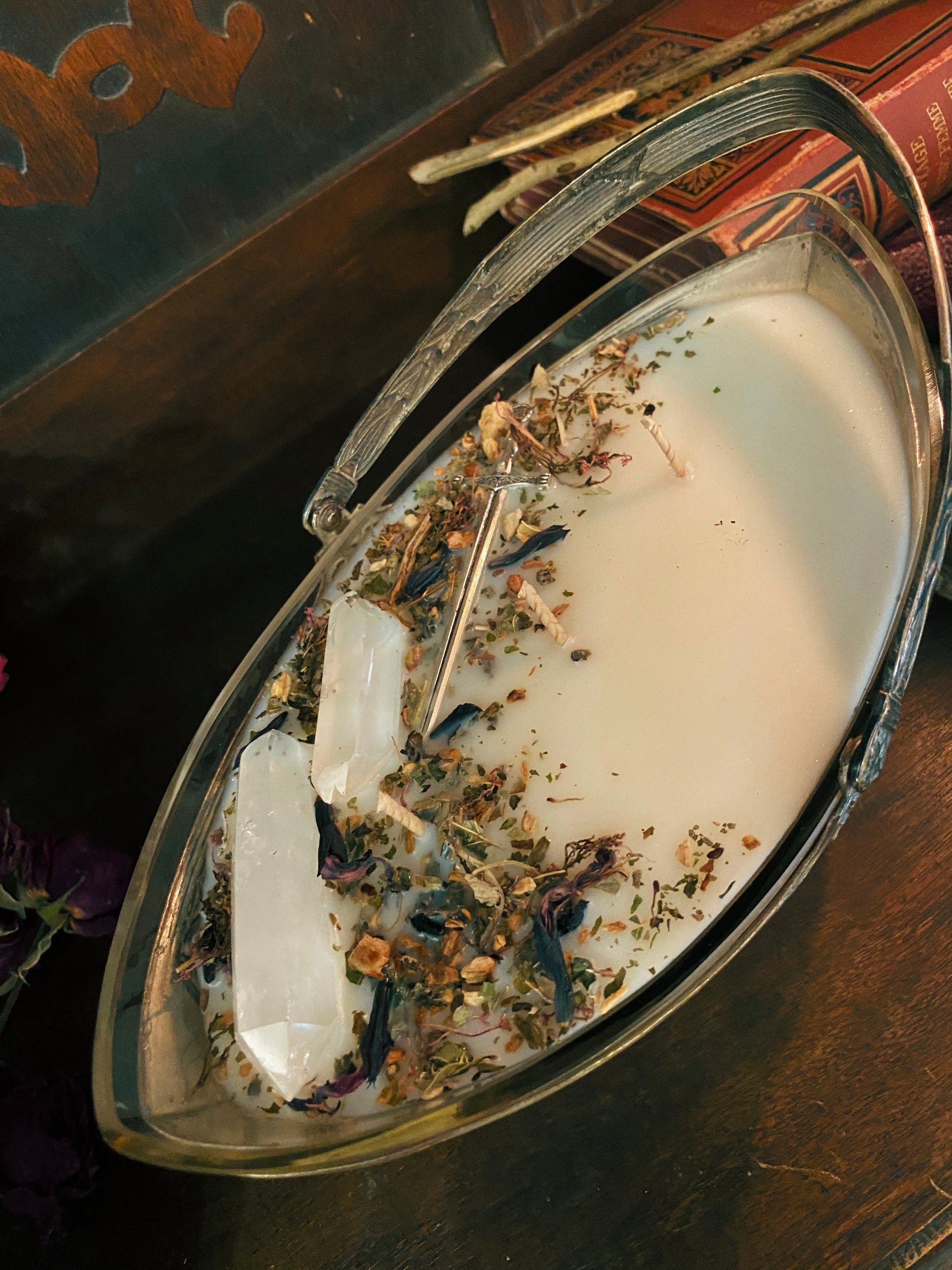 Ornée de quartz Corinto et de plantes consacrées aux vertus spirituelles, cette flamme est accompagnée d’un livret détaillant son histoire, ses symboles et ses secrets. Pierres issues de mines éthiques, plantes cueillies avec soin ou bio. 481g de cire de coco 100 % naturelle, végane, sans OGM. Mèche en coton bio ou bois d’érable. 85h de combustion. ⌀21cm/8cm.