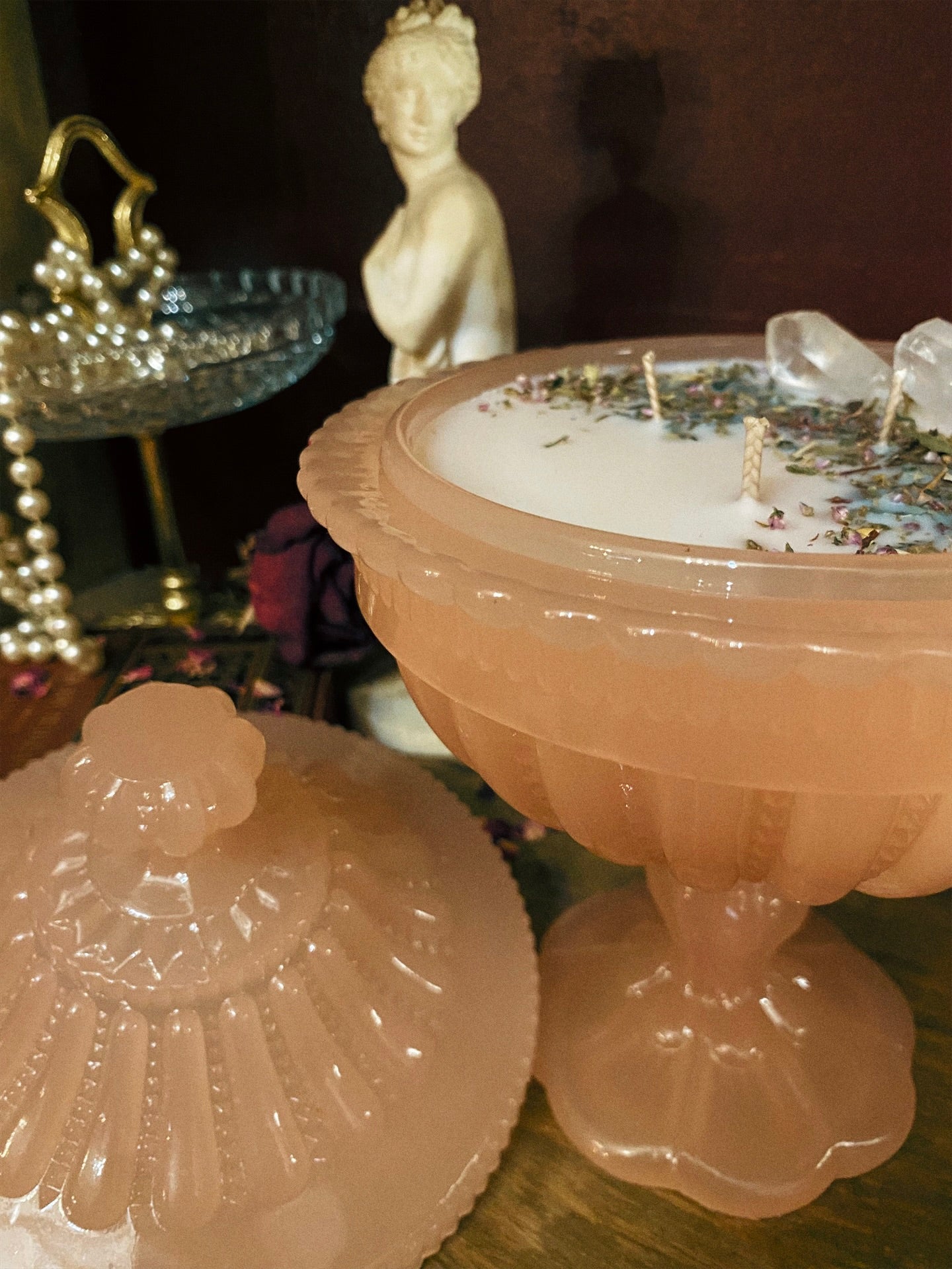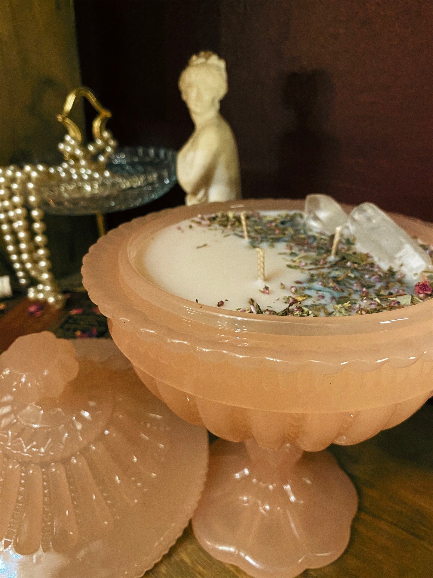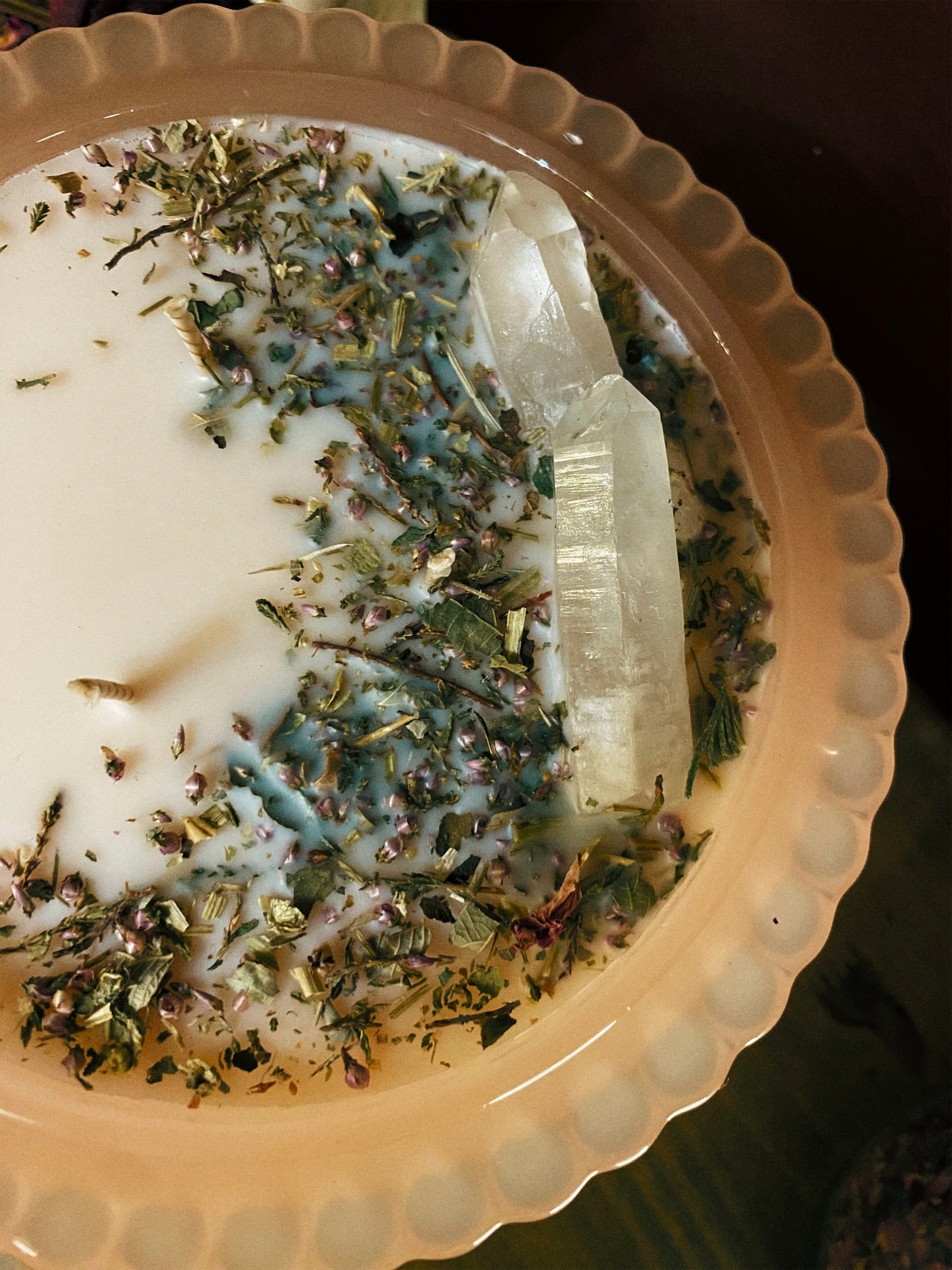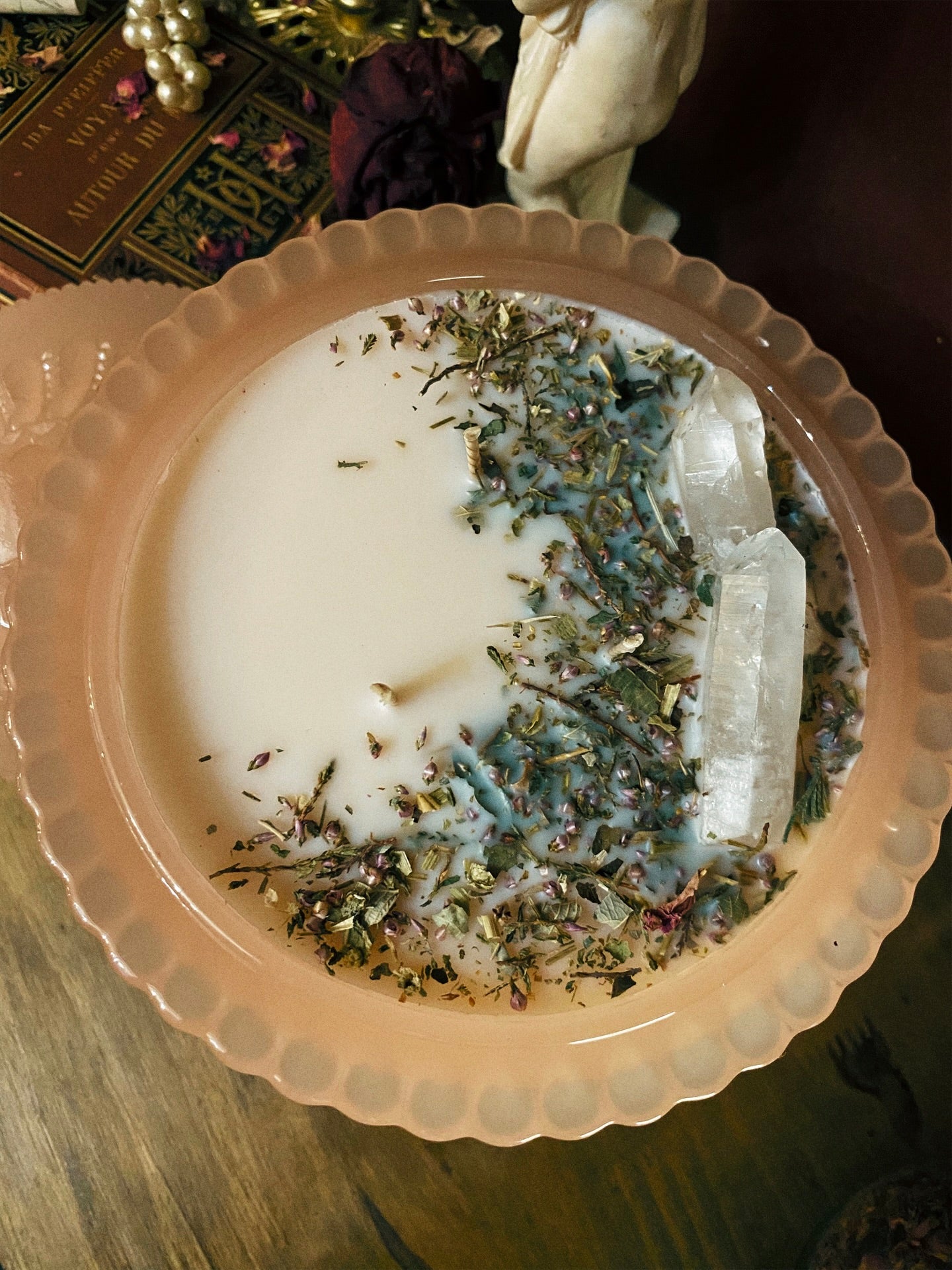 Cette flamme est ornée de quartz Corinto et de plantes consacrées aux vertus spirituelles puissantes. Pierres issues de mines éthiques, plantes cueillies avec soin ou bio. 463gr de cire de coco 100 % naturelle, végane, sans OGM. Mèche en coton bio ou bois d’érable. 70h de combustion. ⌀17cm/22cm.