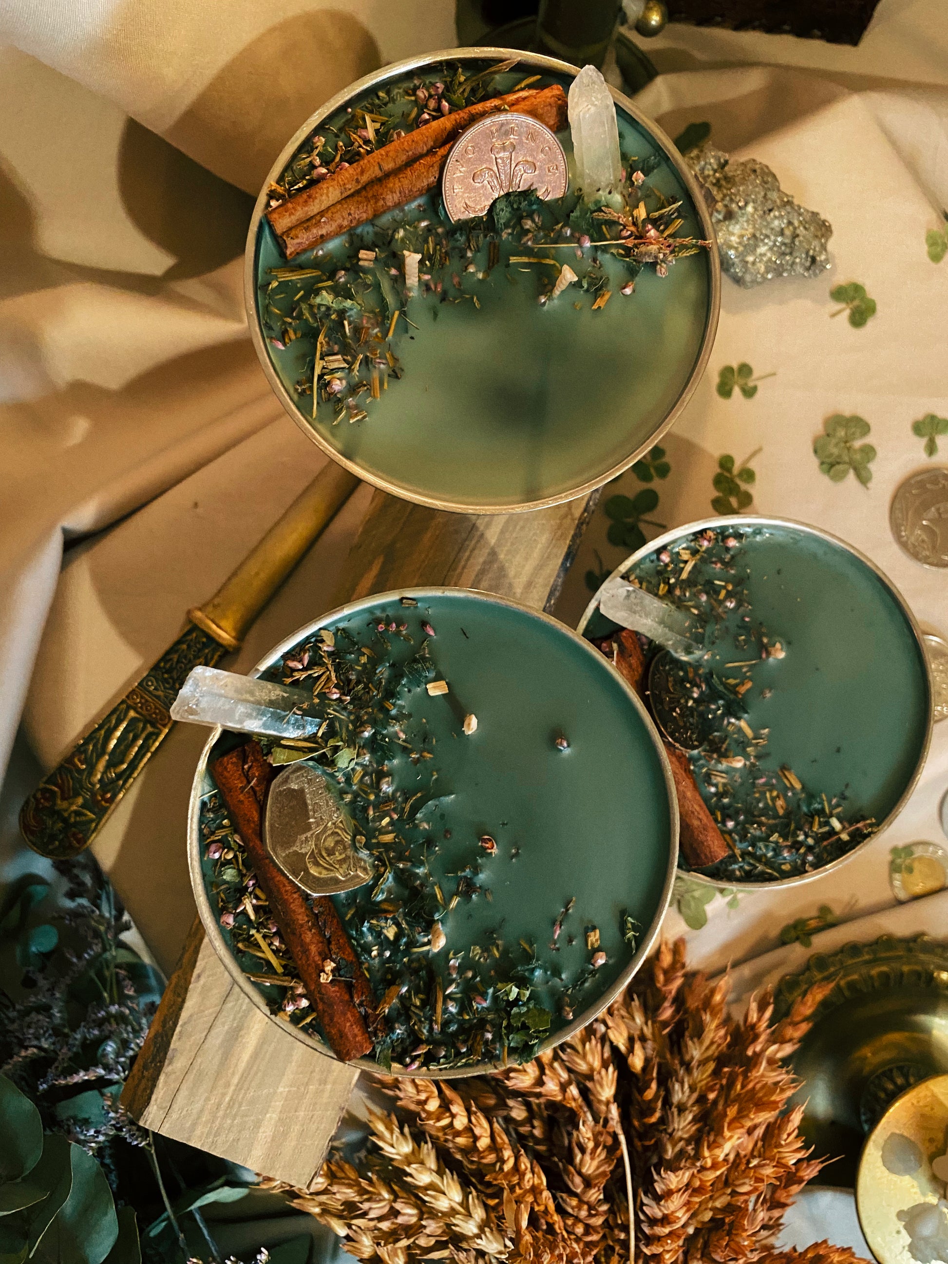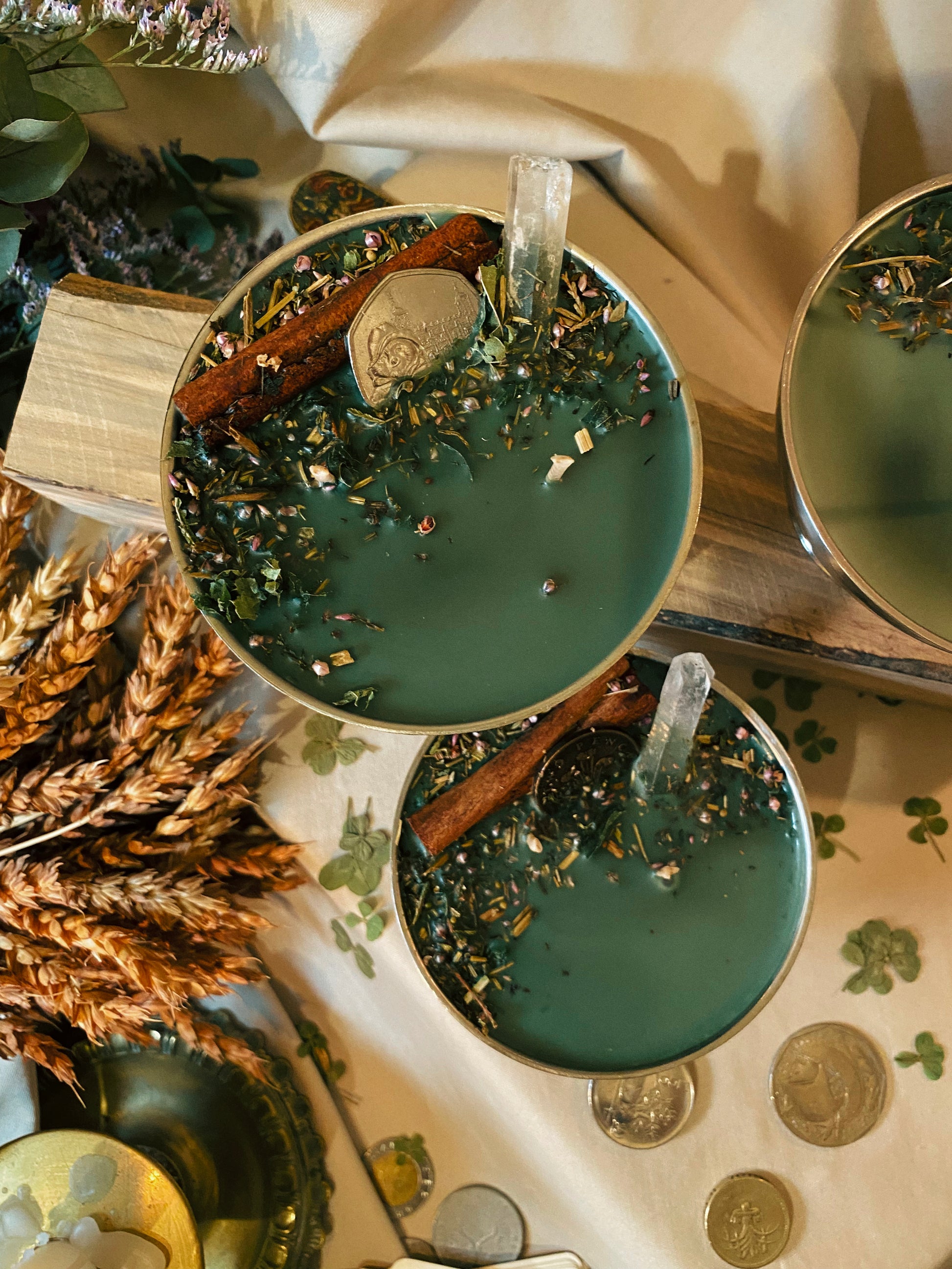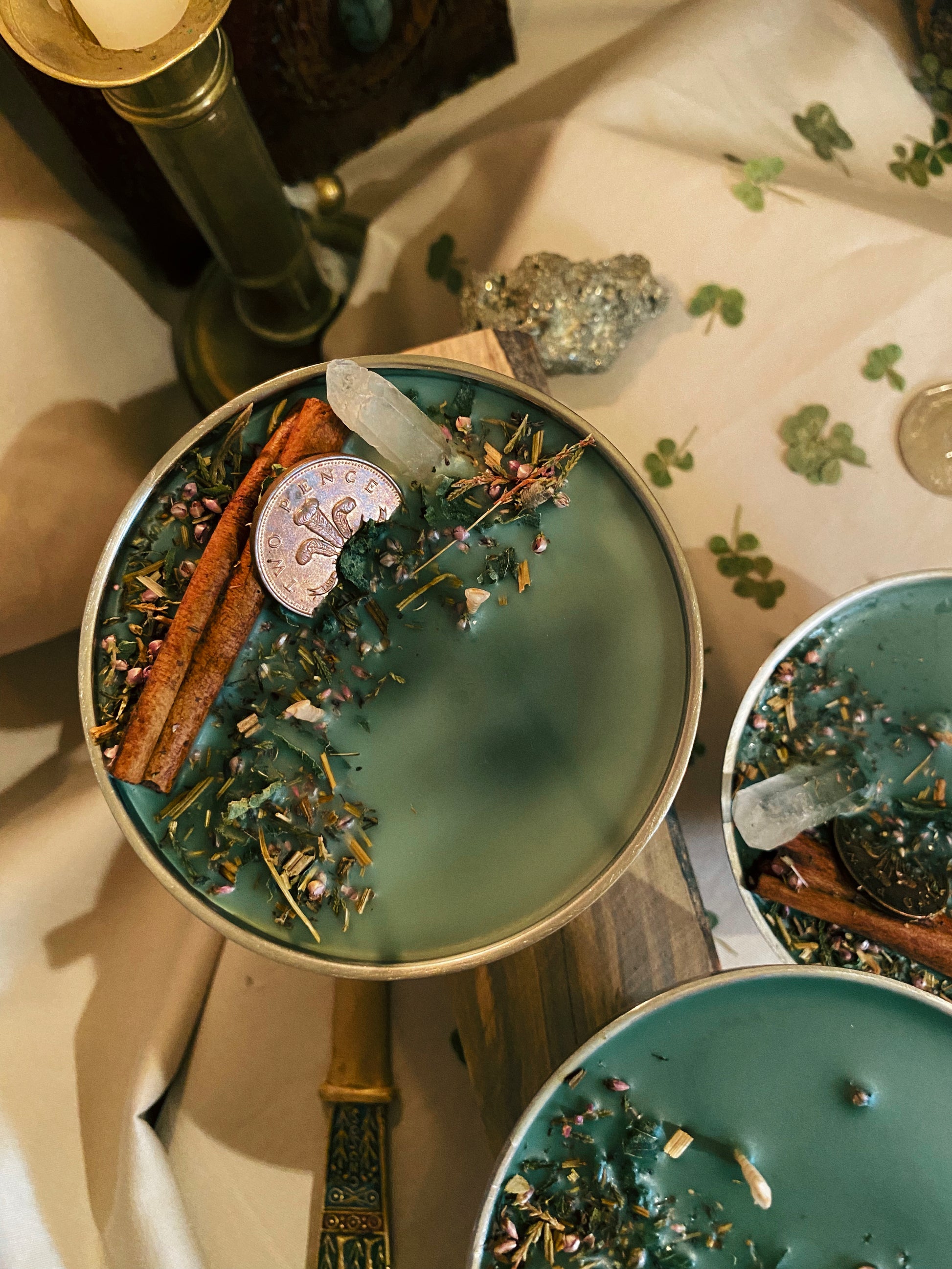 Ornée d'une pointe de quartz, d'une ancienne pièce porte-bonheur, de verveine et d'autres merveilles aux vertus spirituelles.