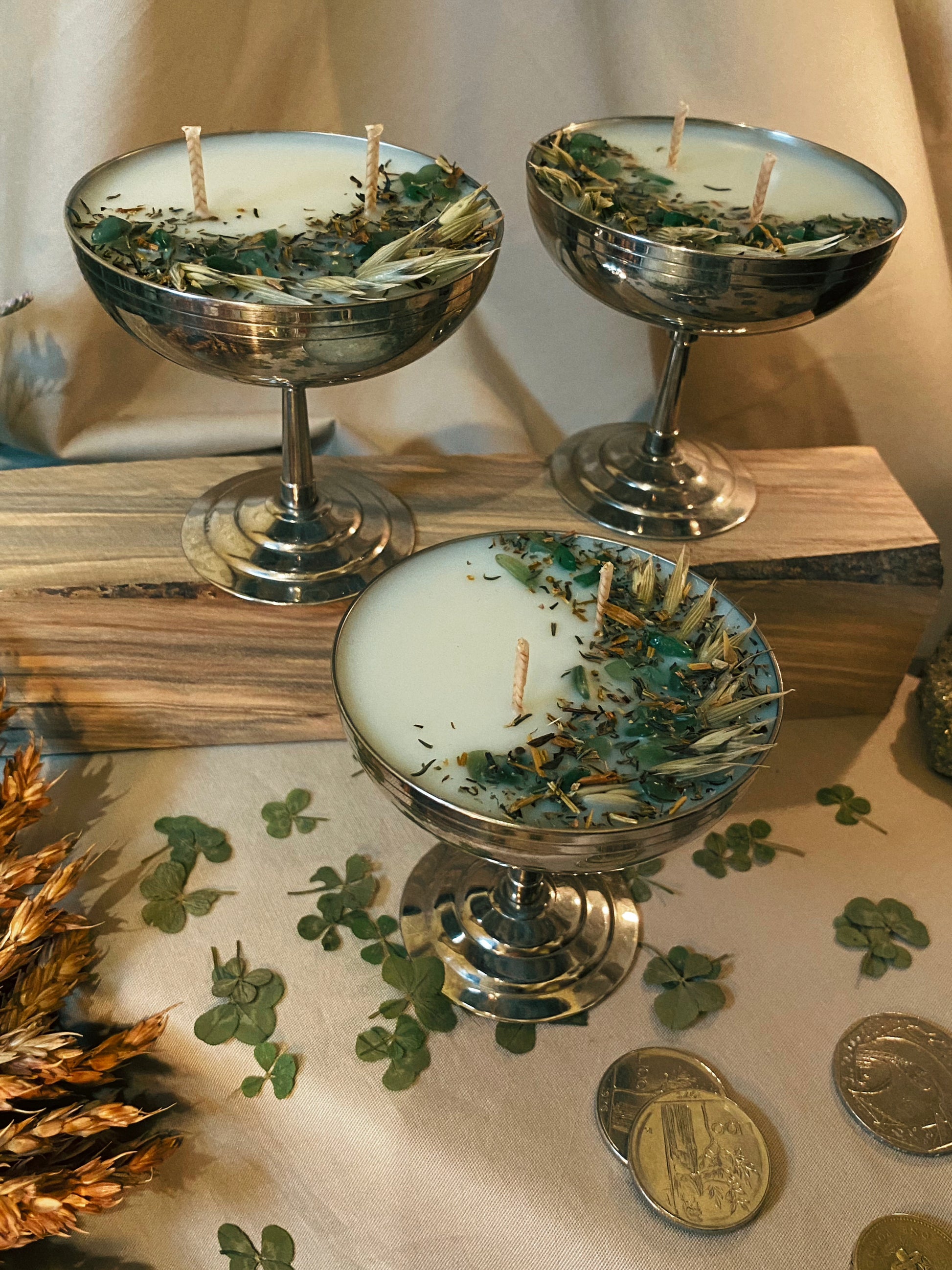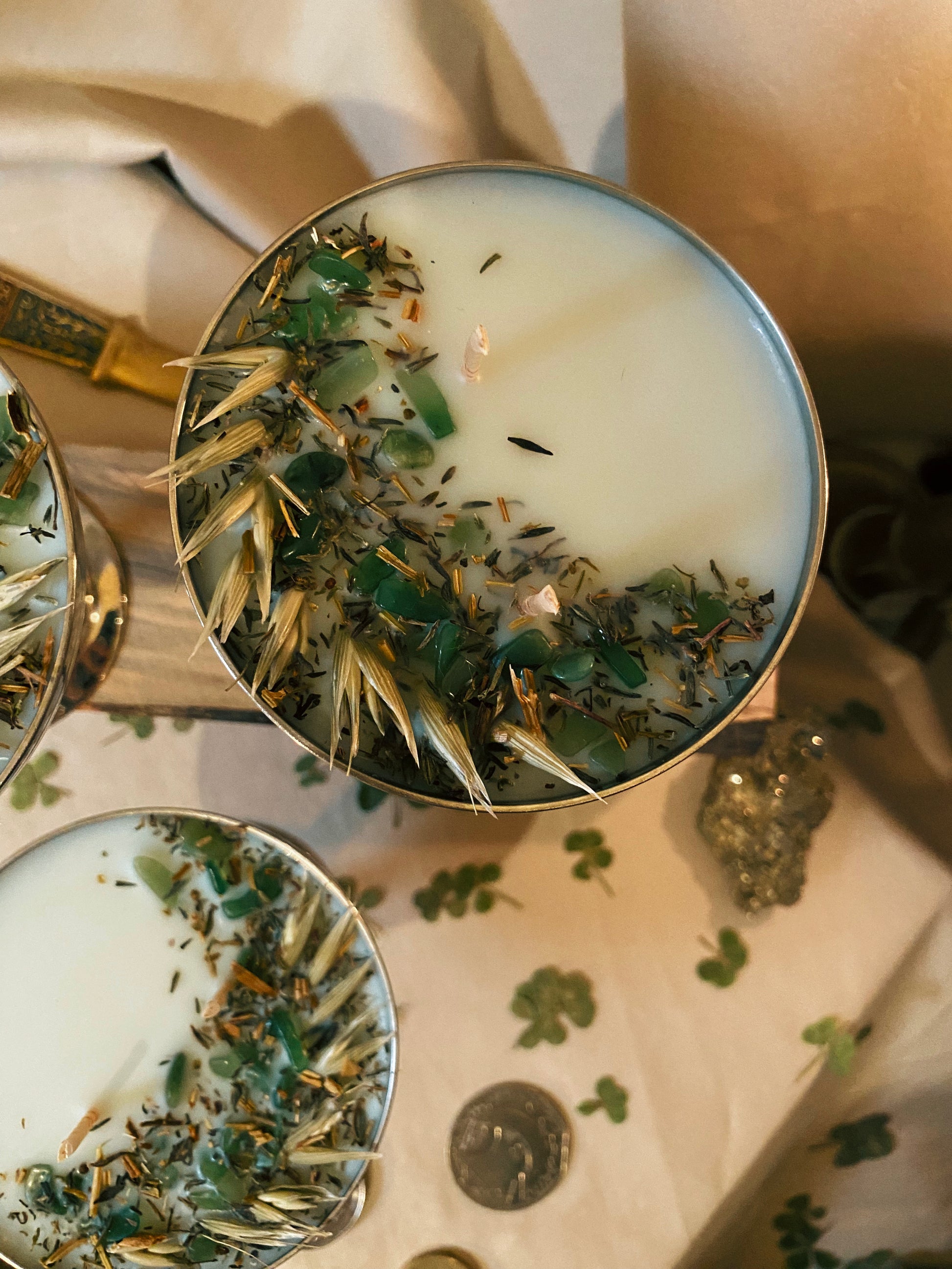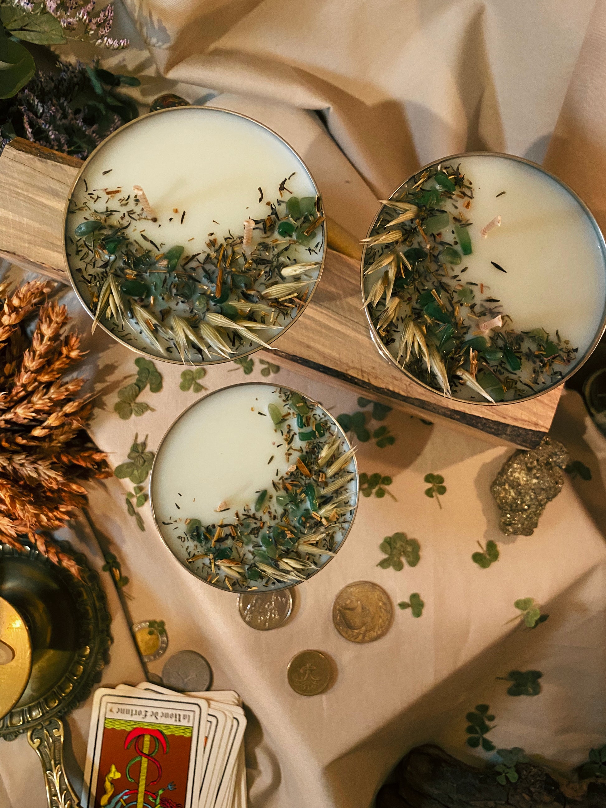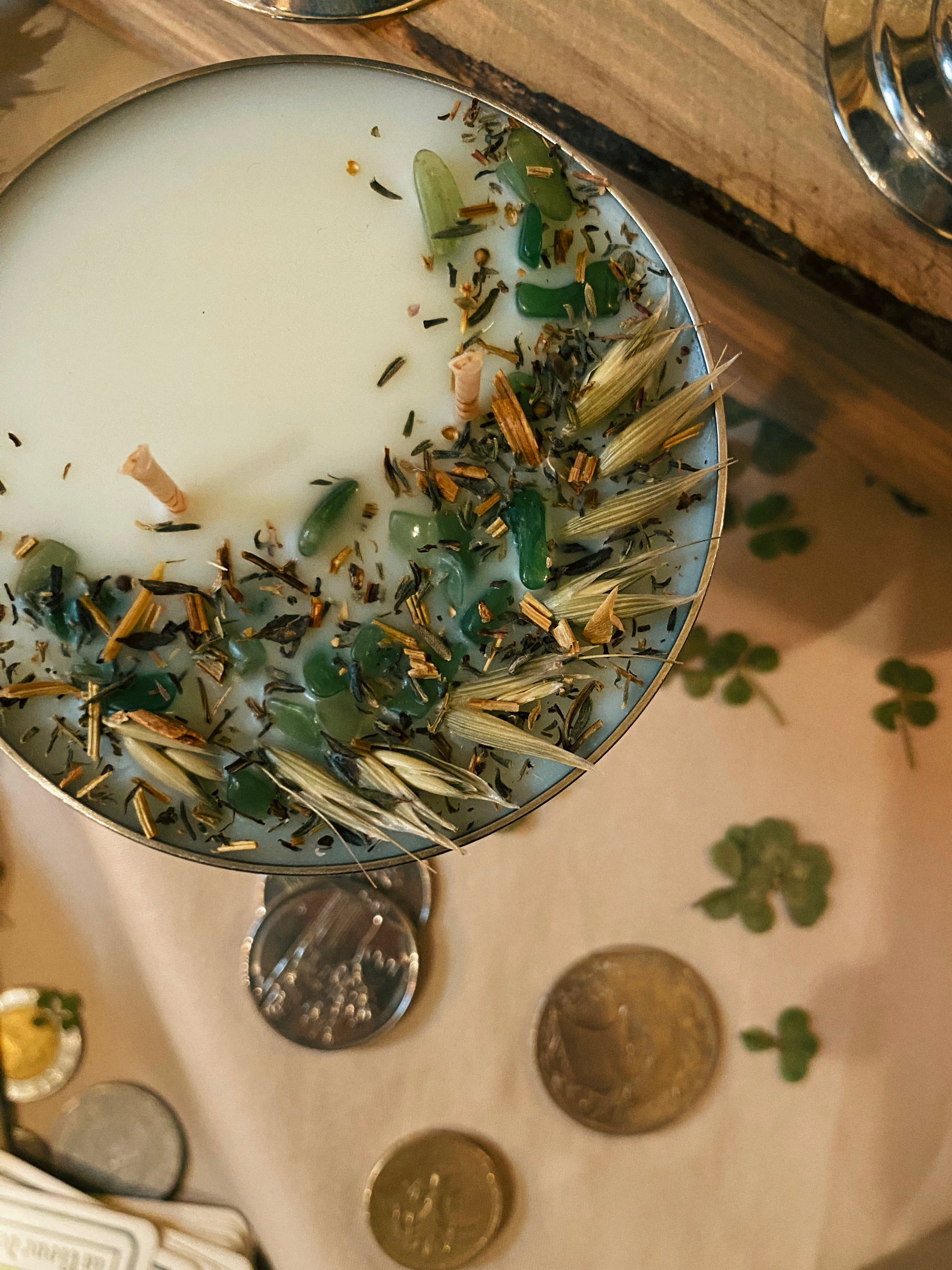 Ornée d'une jade brute, de racine de high john, d'écorce de cannelle, de pivoine et d'autres merveilles aux vertus spirituelles.
