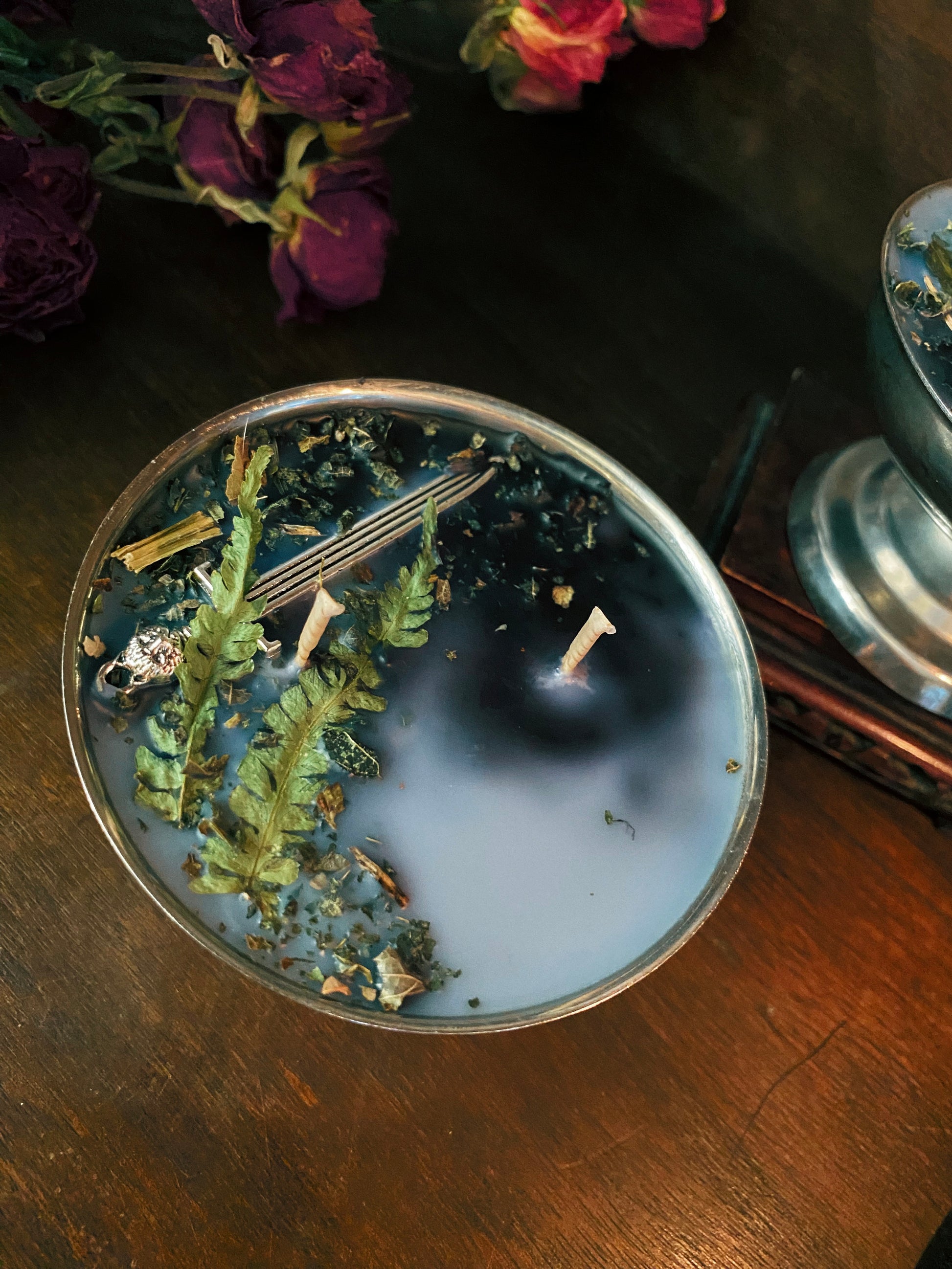 Ornée de plantes consacrées aux vertus spirituelles, cette étincelle est accompagnée d’un livret détaillant son histoire, ses symboles et ses secrets. Pierres issues de mines éthiques, plantes cueillies avec soin ou bio. 77g de cire de coco 100 % naturelle, végane, sans OGM. Mèche en coton bio ou bois d’érable. 10h de combustion.