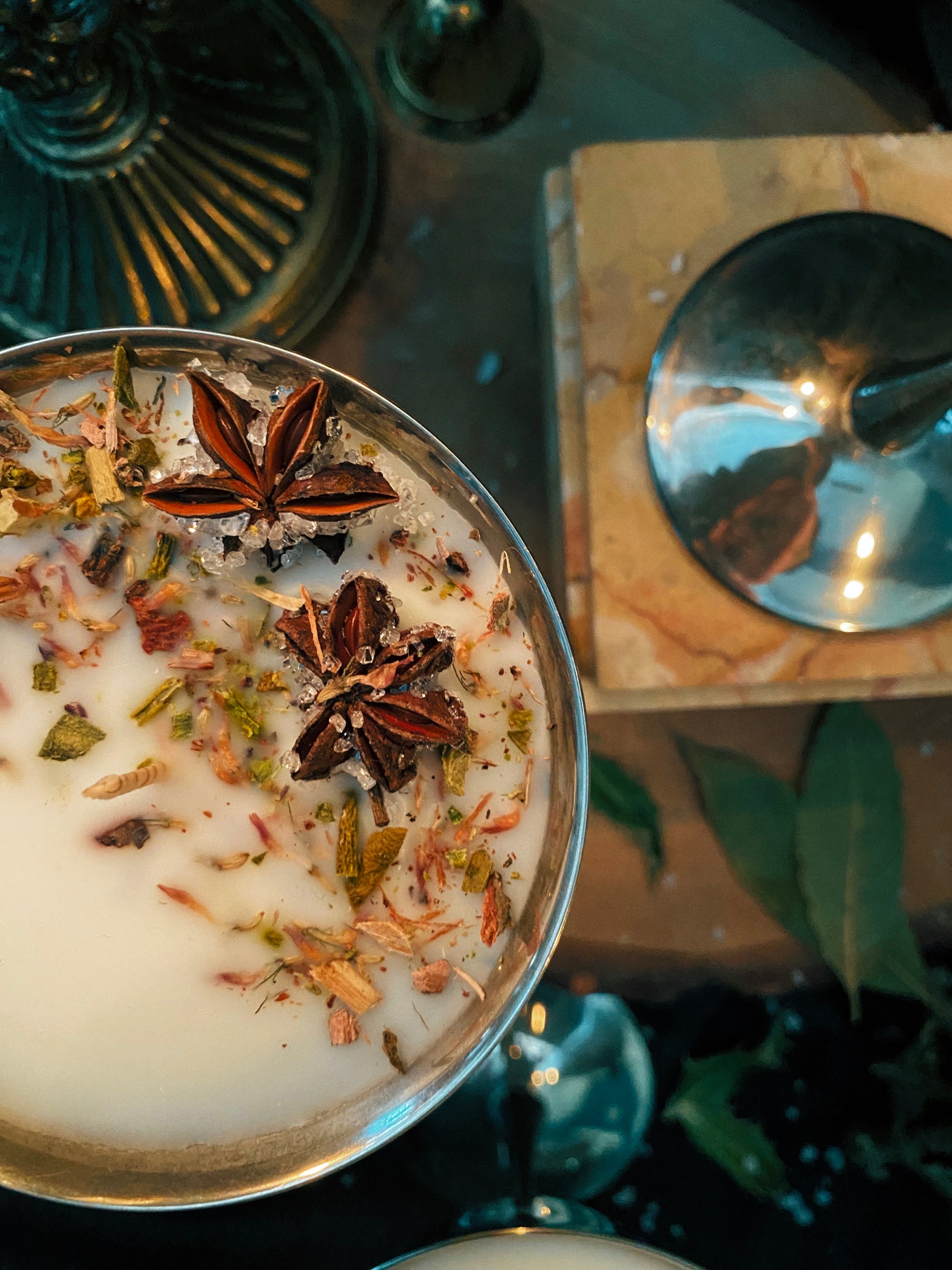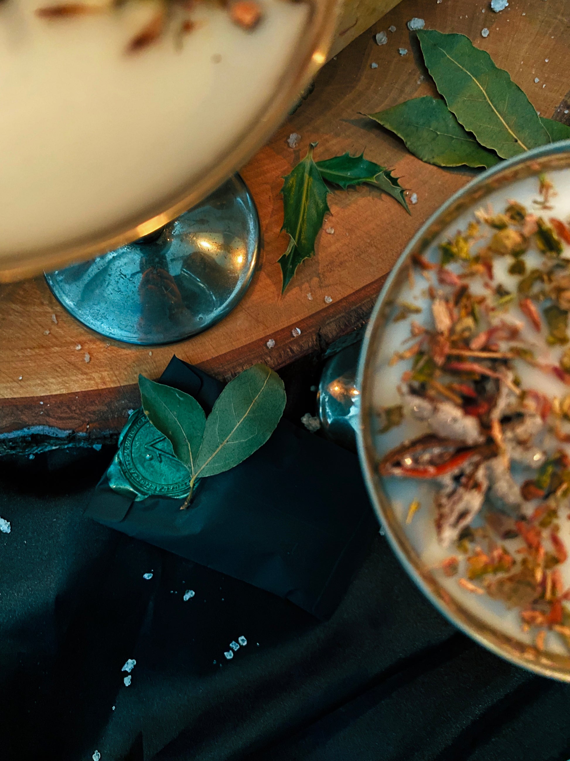 Ornée d'anis étoilé givré, d'écorces de chêne, de trèfle rouge et d'autres merveilles aux vertus spirituelles. Un petit sachet de 12 feuilles de laurier accompagnera la création.