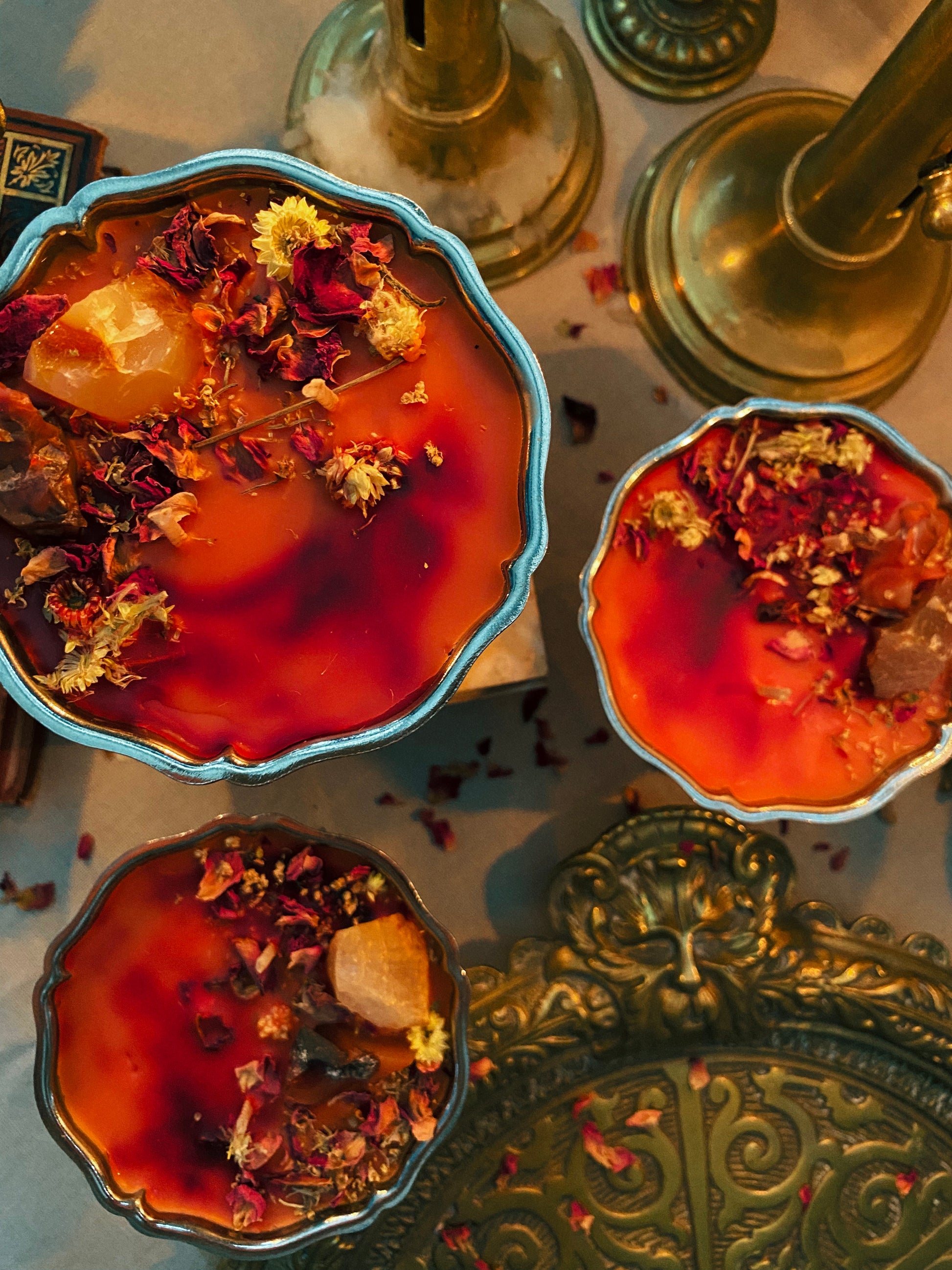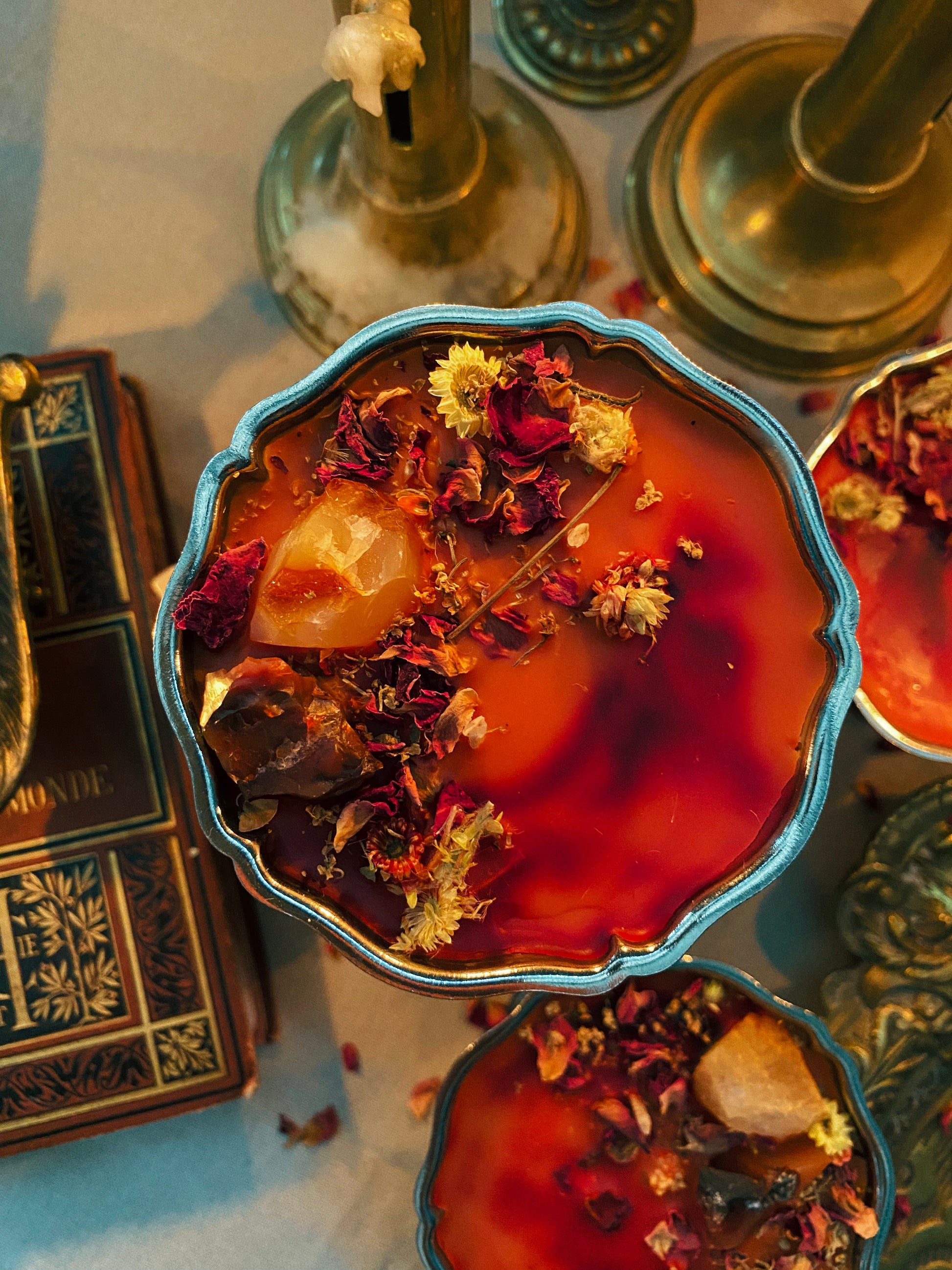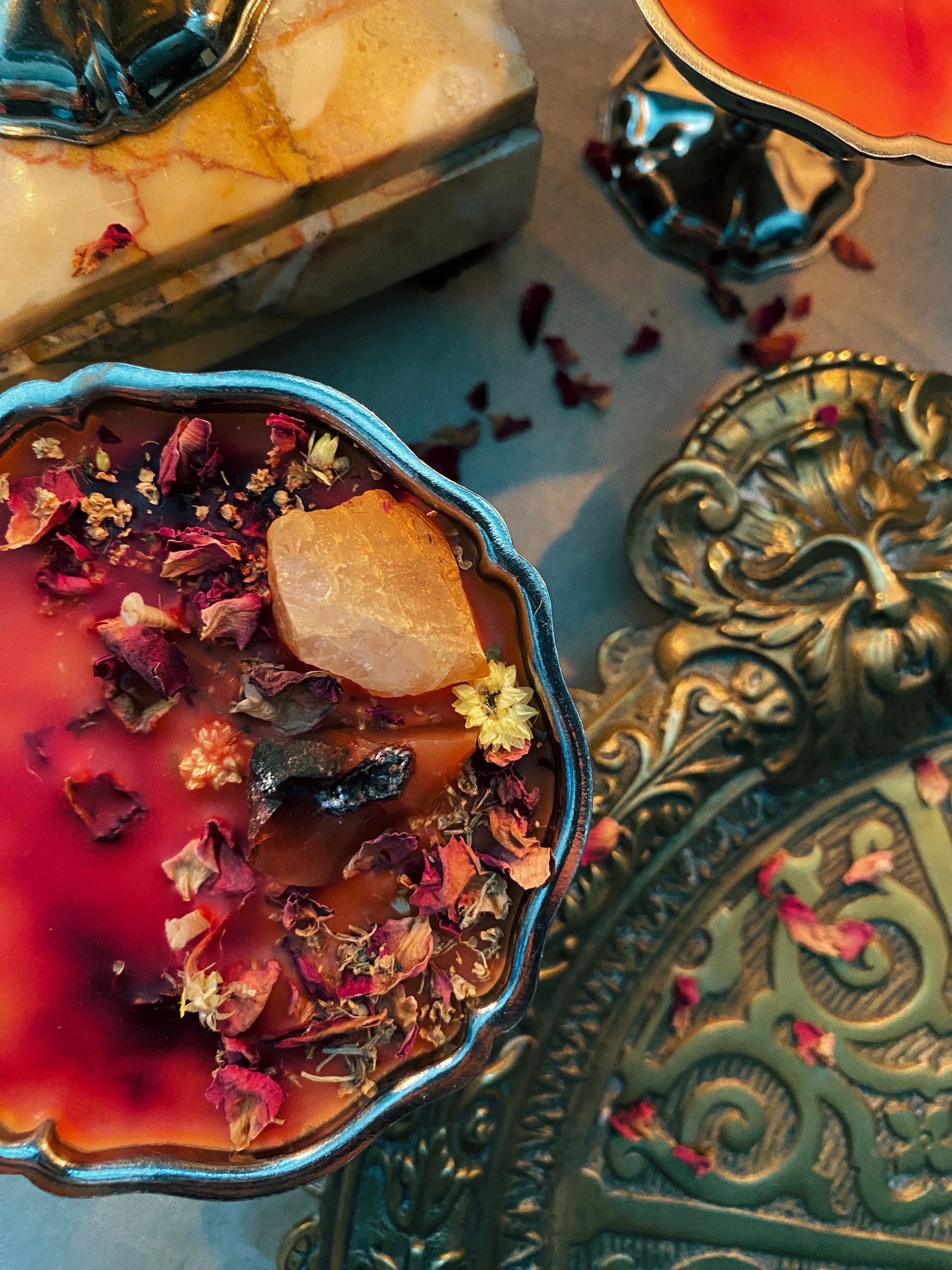 Ornée de cornalines, de pétales de rose, de sureau, d'immortelle et d'autres merveilles aux vertus spirituelles.