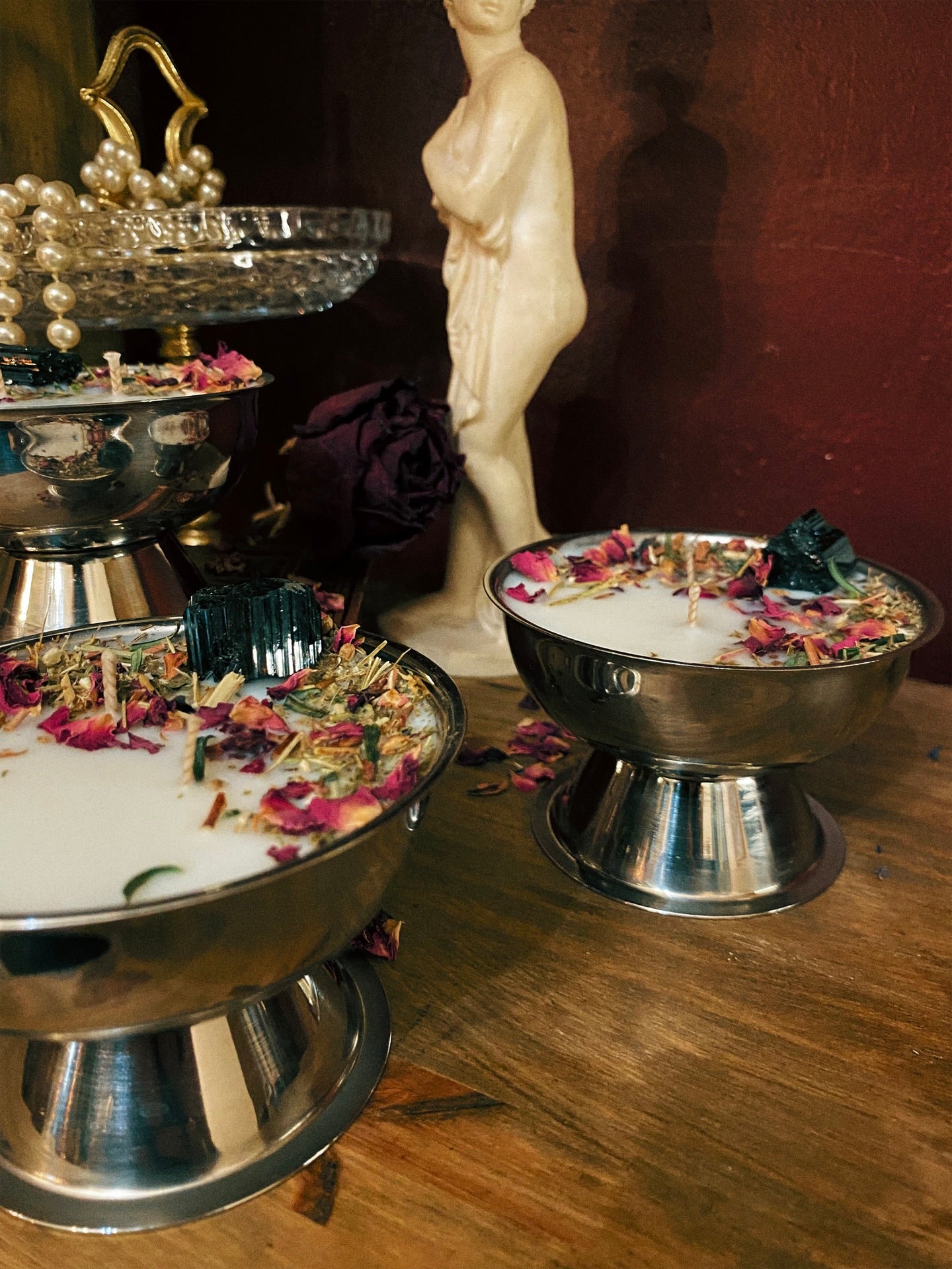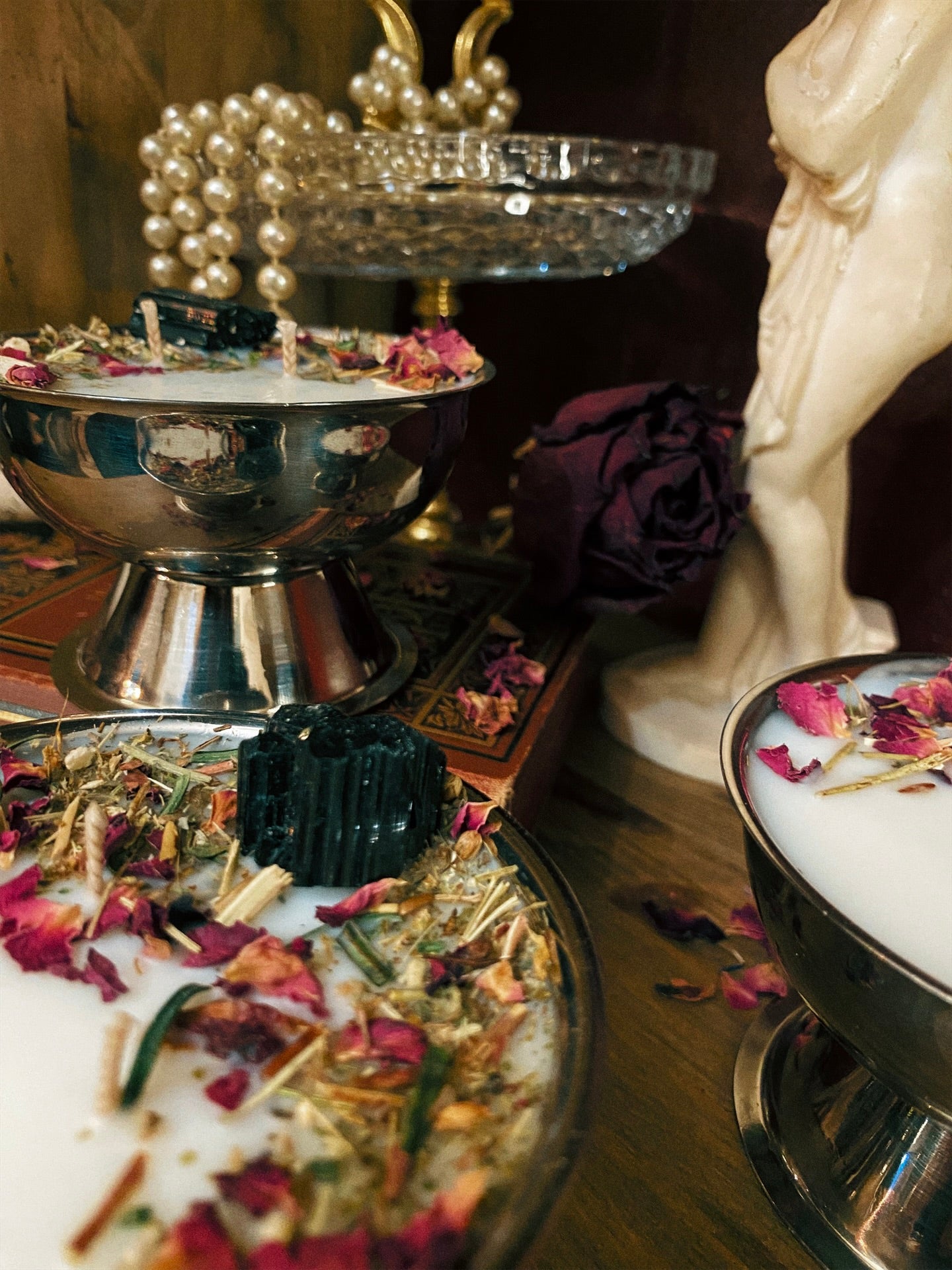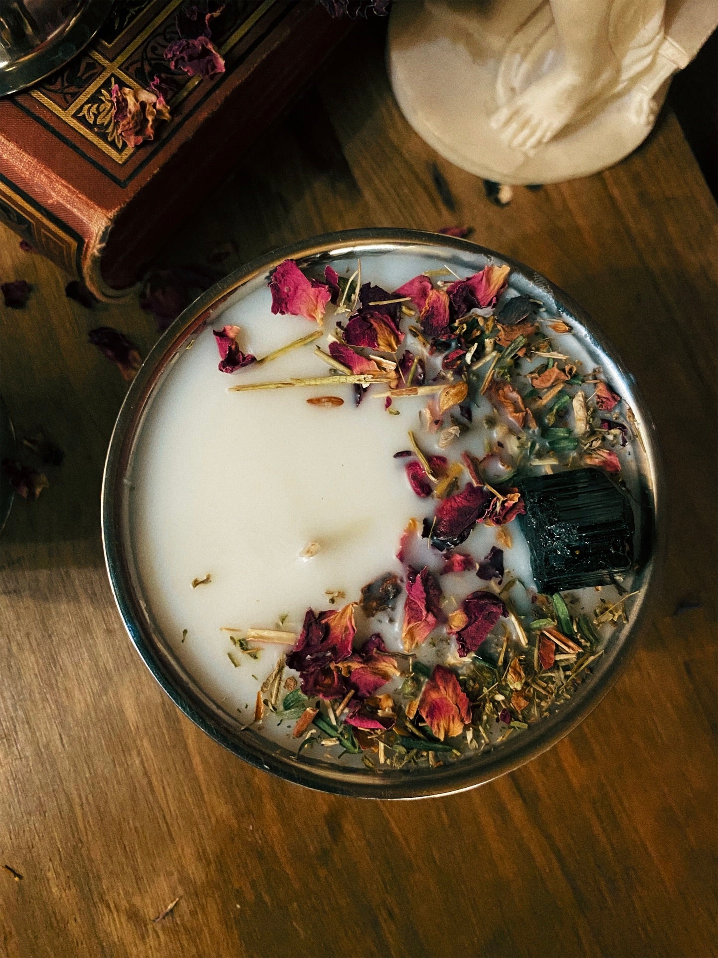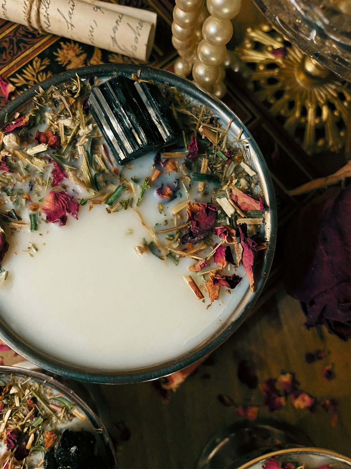 Ornée de trois tourmalines brutes, de millepertuis, d'absinthe, d'if et d'autres merveilles aux vertus spirituelles.