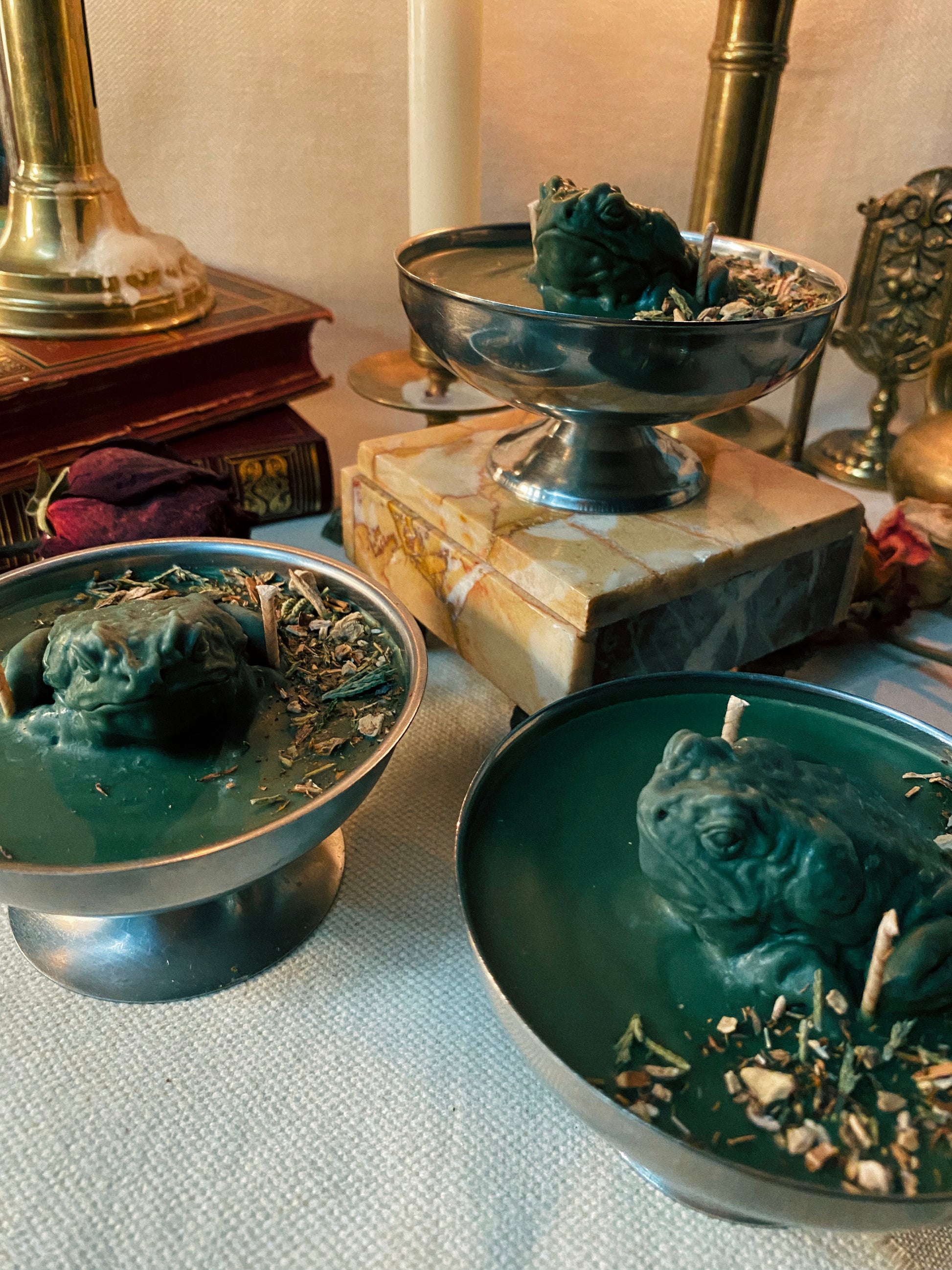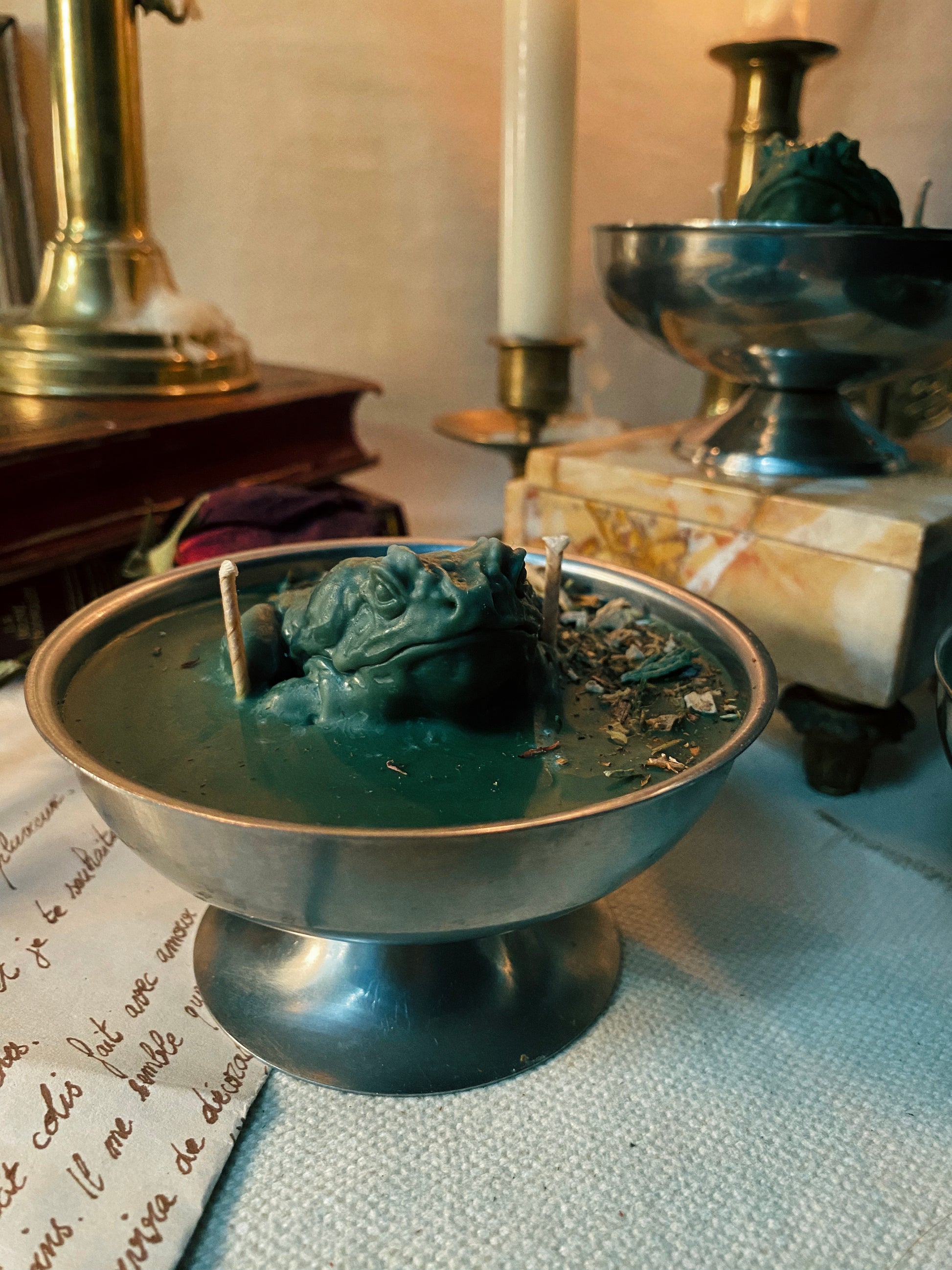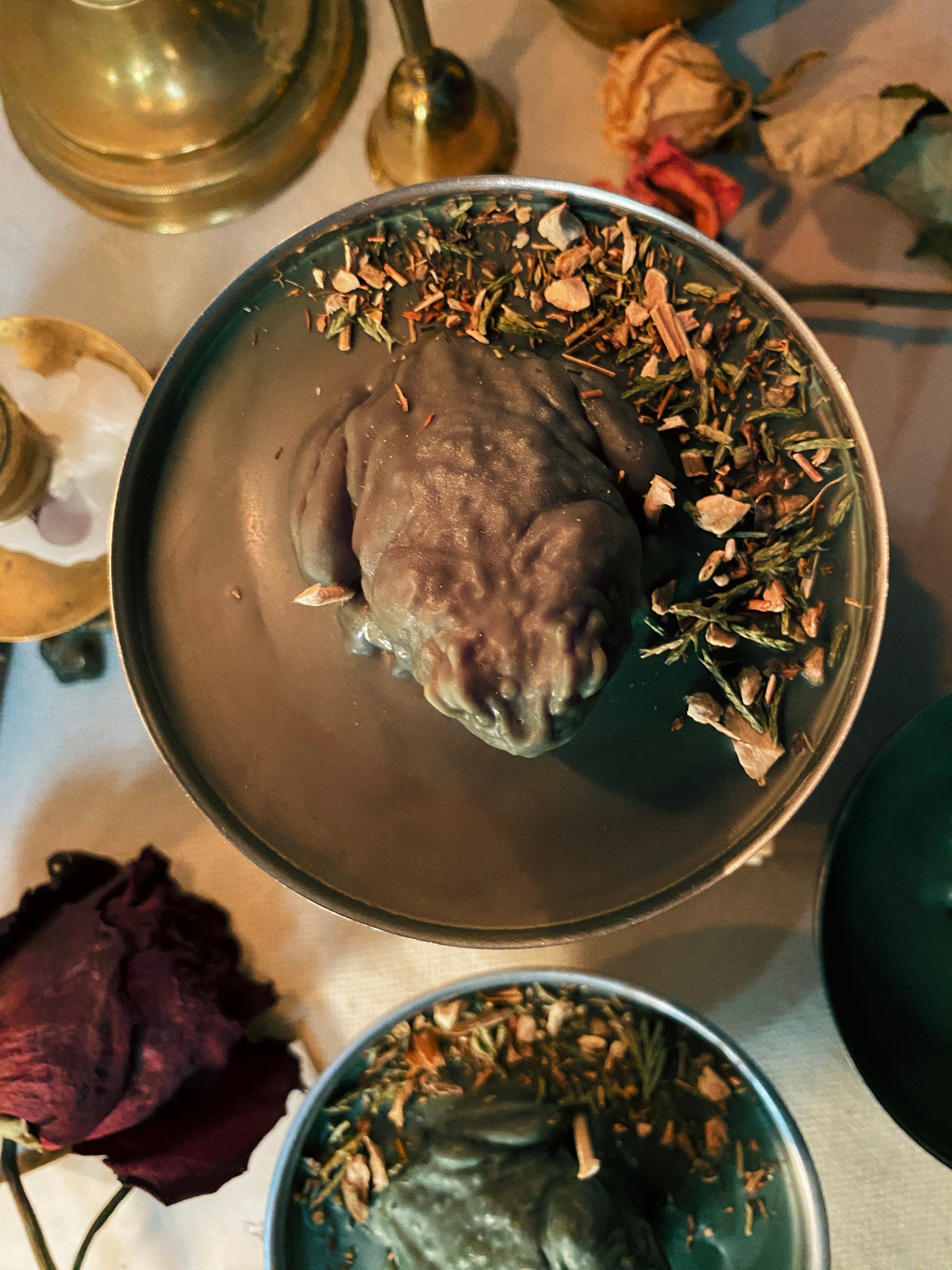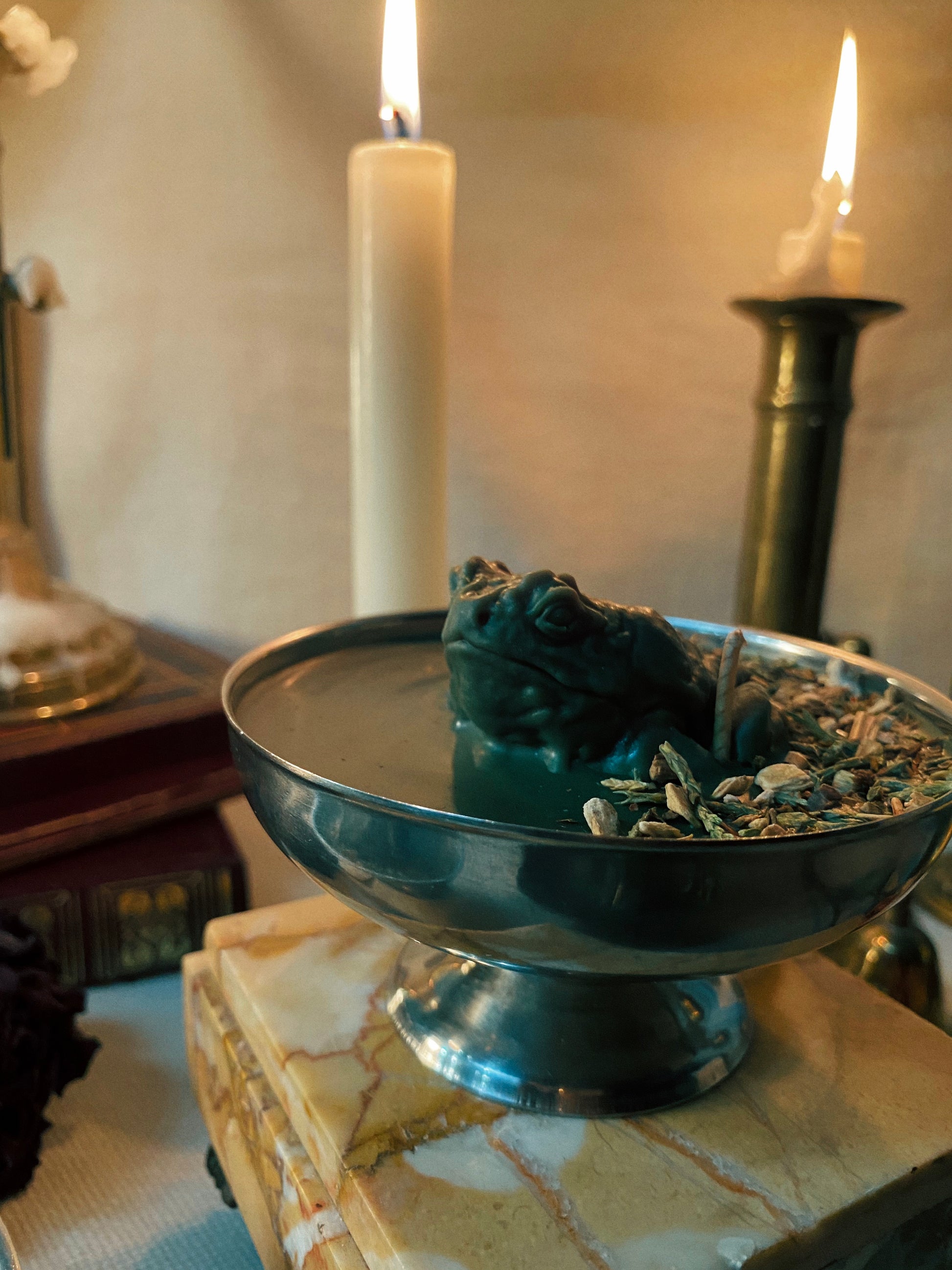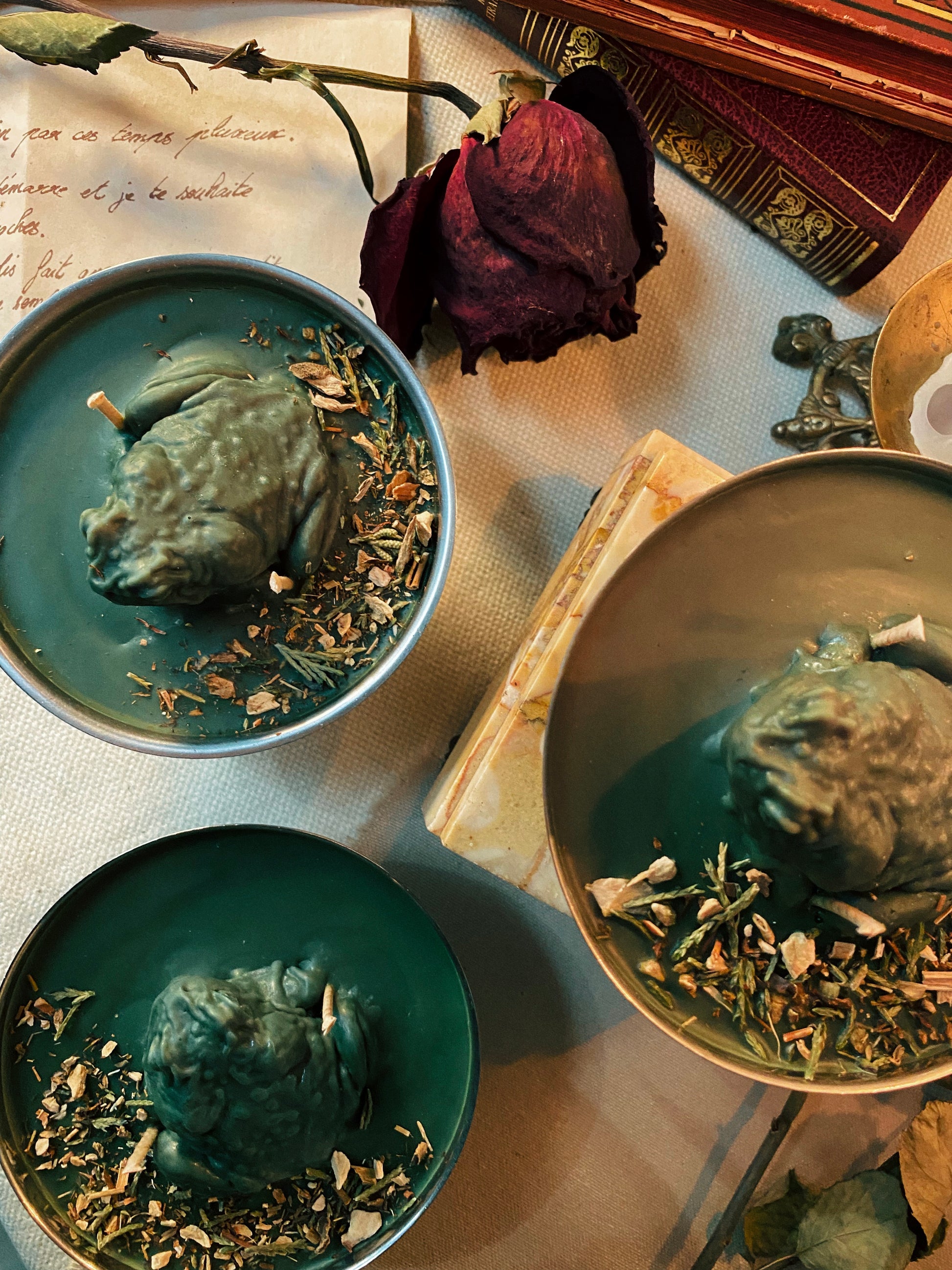 Ornée d'un crapaud vert en cire, de racines de nénuphar, de cyprès et d'autres merveilles aux vertus spirituelles.