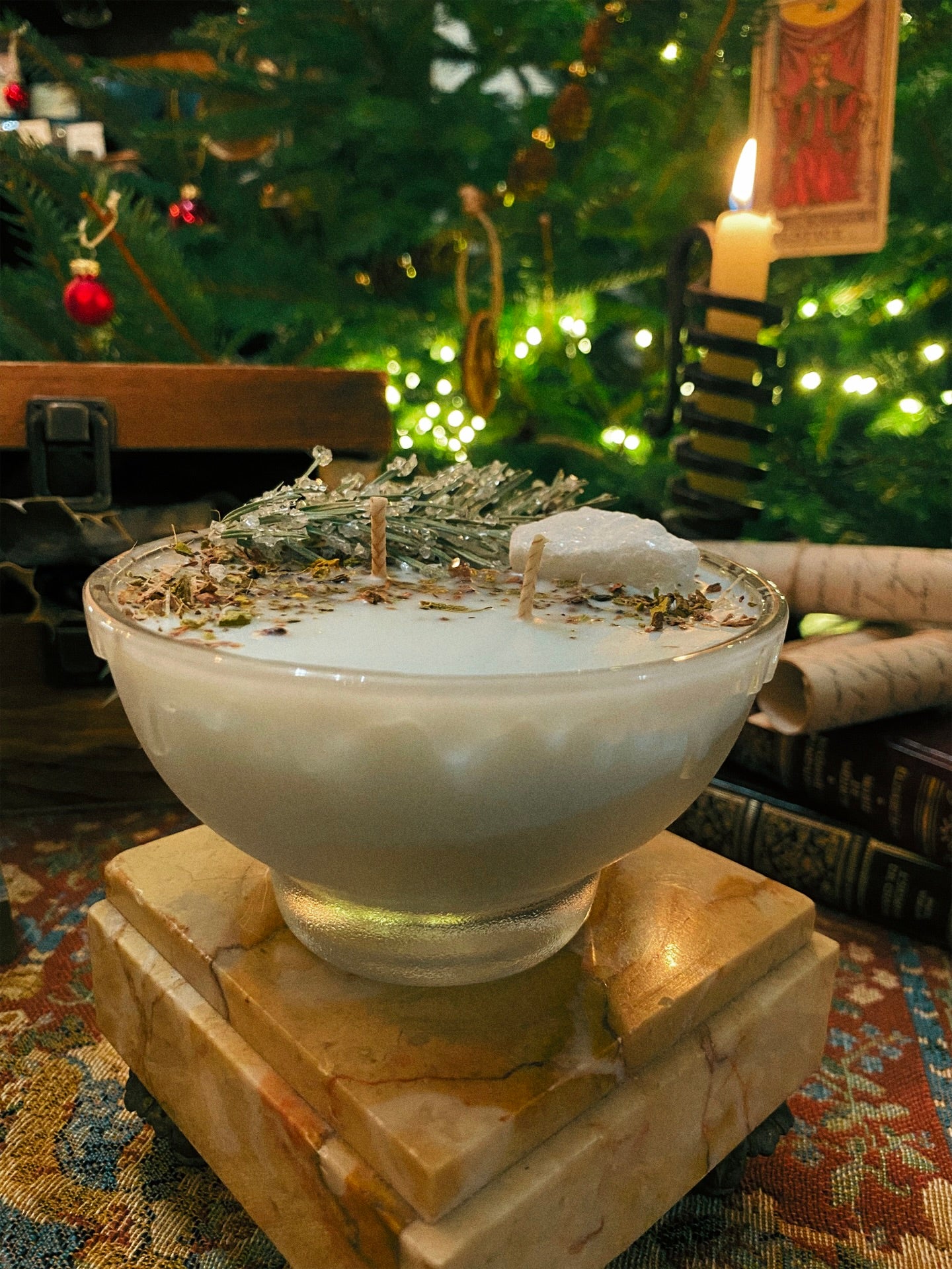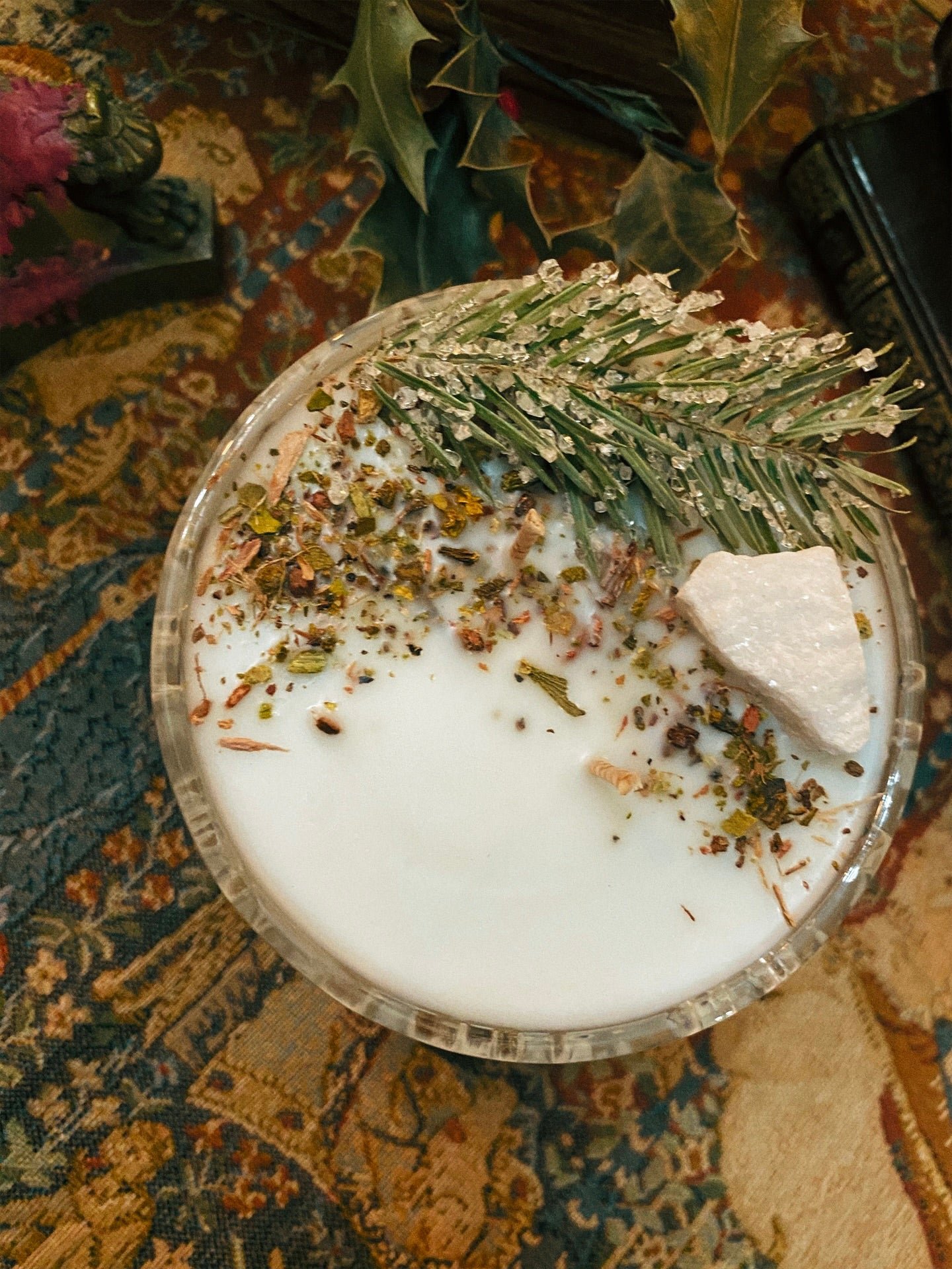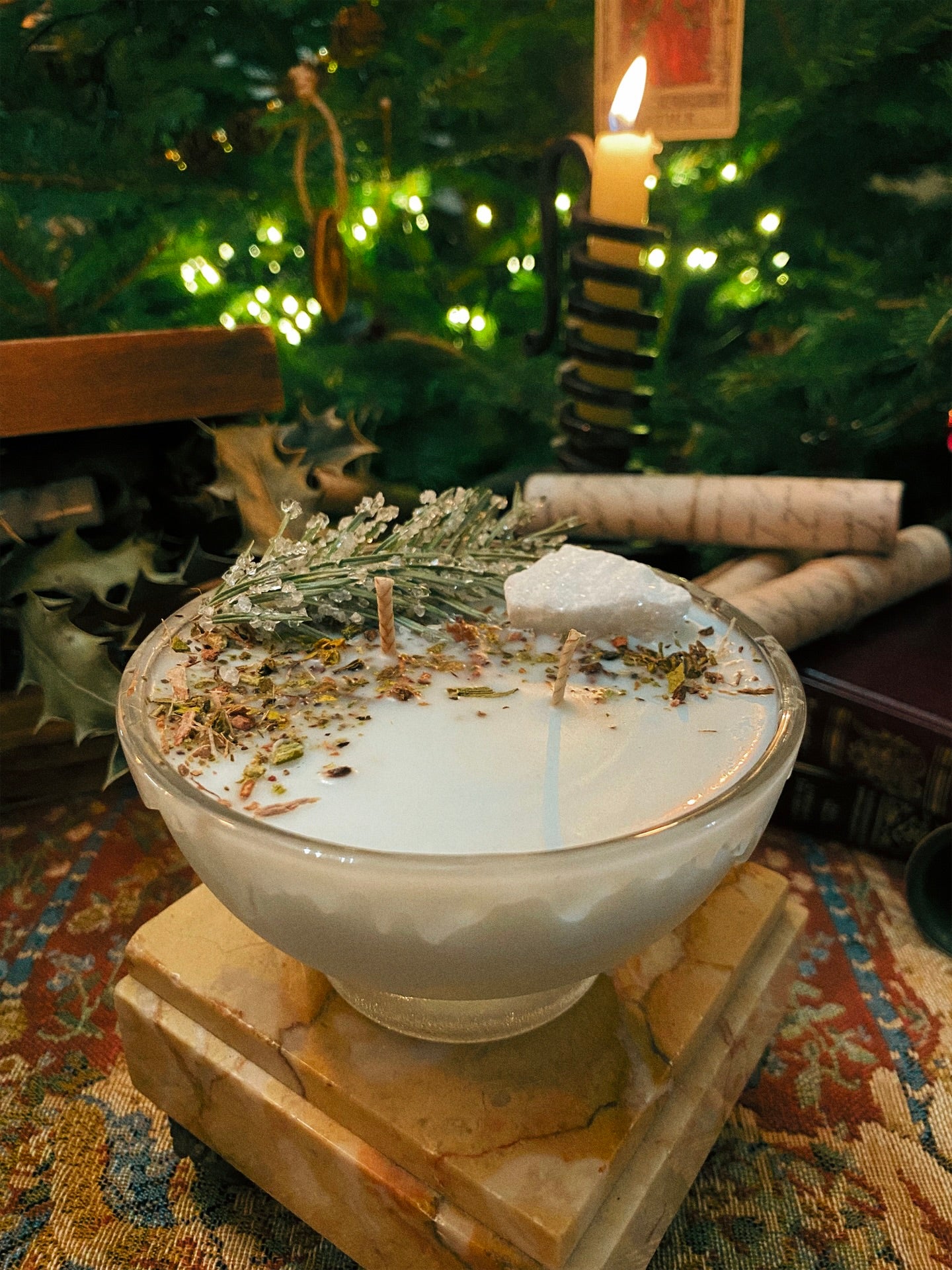 Cette flamme est ornée d’une calcite blanche, de sapin givré et de plantes consacrées aux vertus spirituelles puissantes. Pierres issues de mines éthiques, plantes cueillies avec soin ou bio. 186gr de cire de coco 100 % naturelle, végane, sans OGM. Mèche en coton bio ou bois d’érable. 25h de combustion. ⌀9cm/6cm.