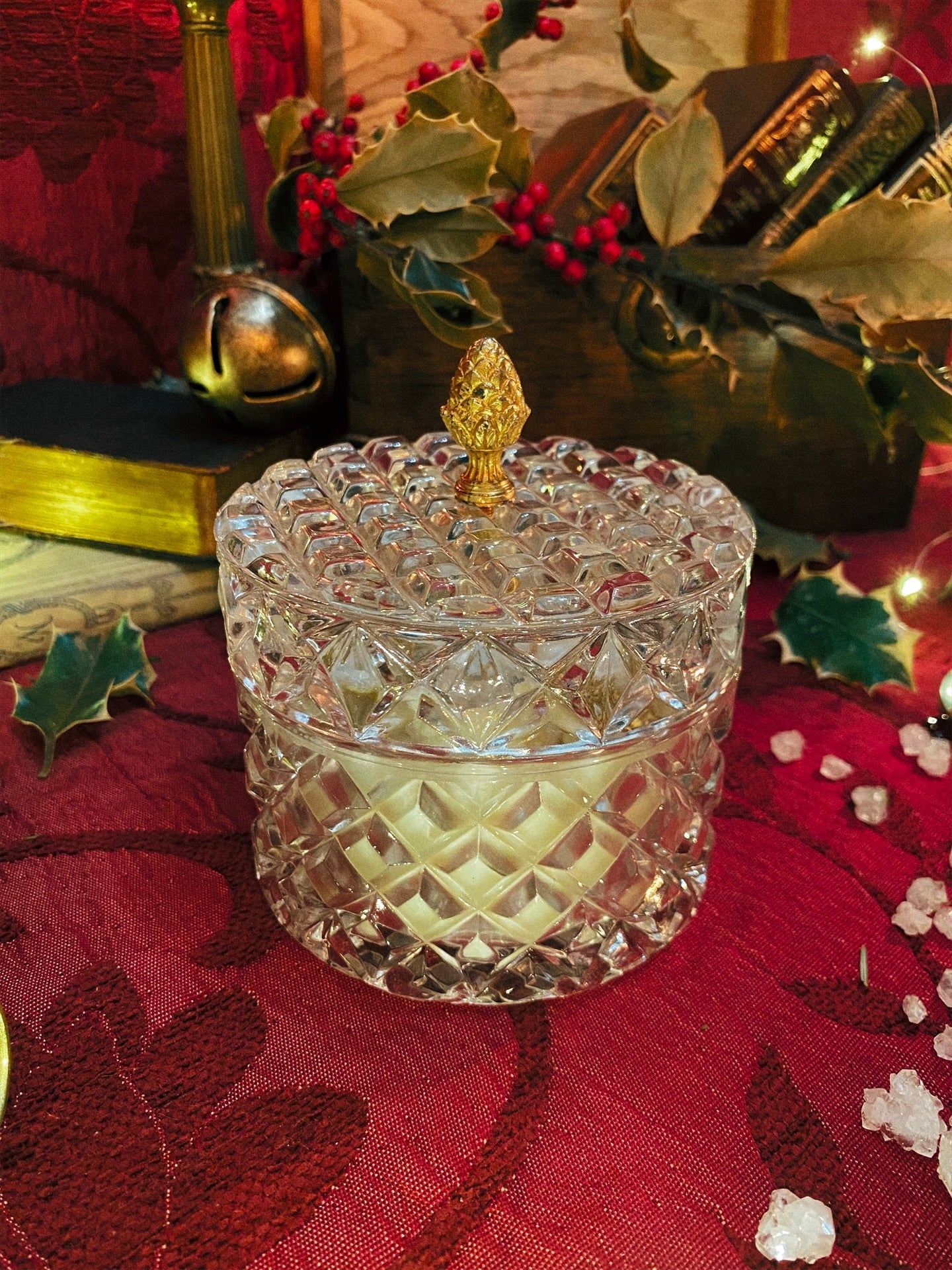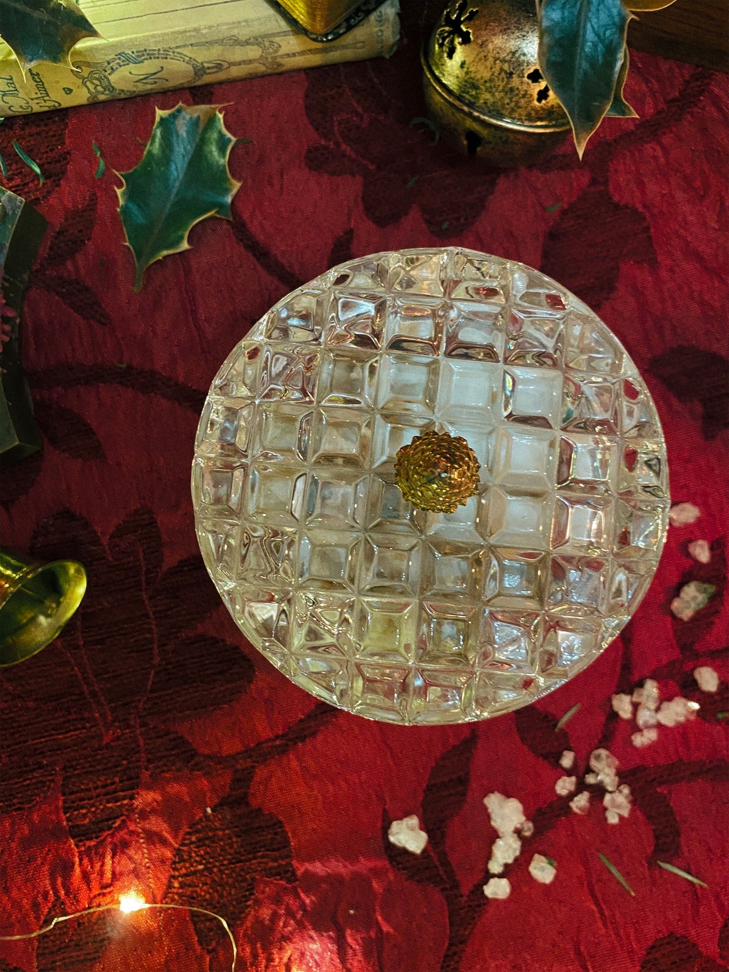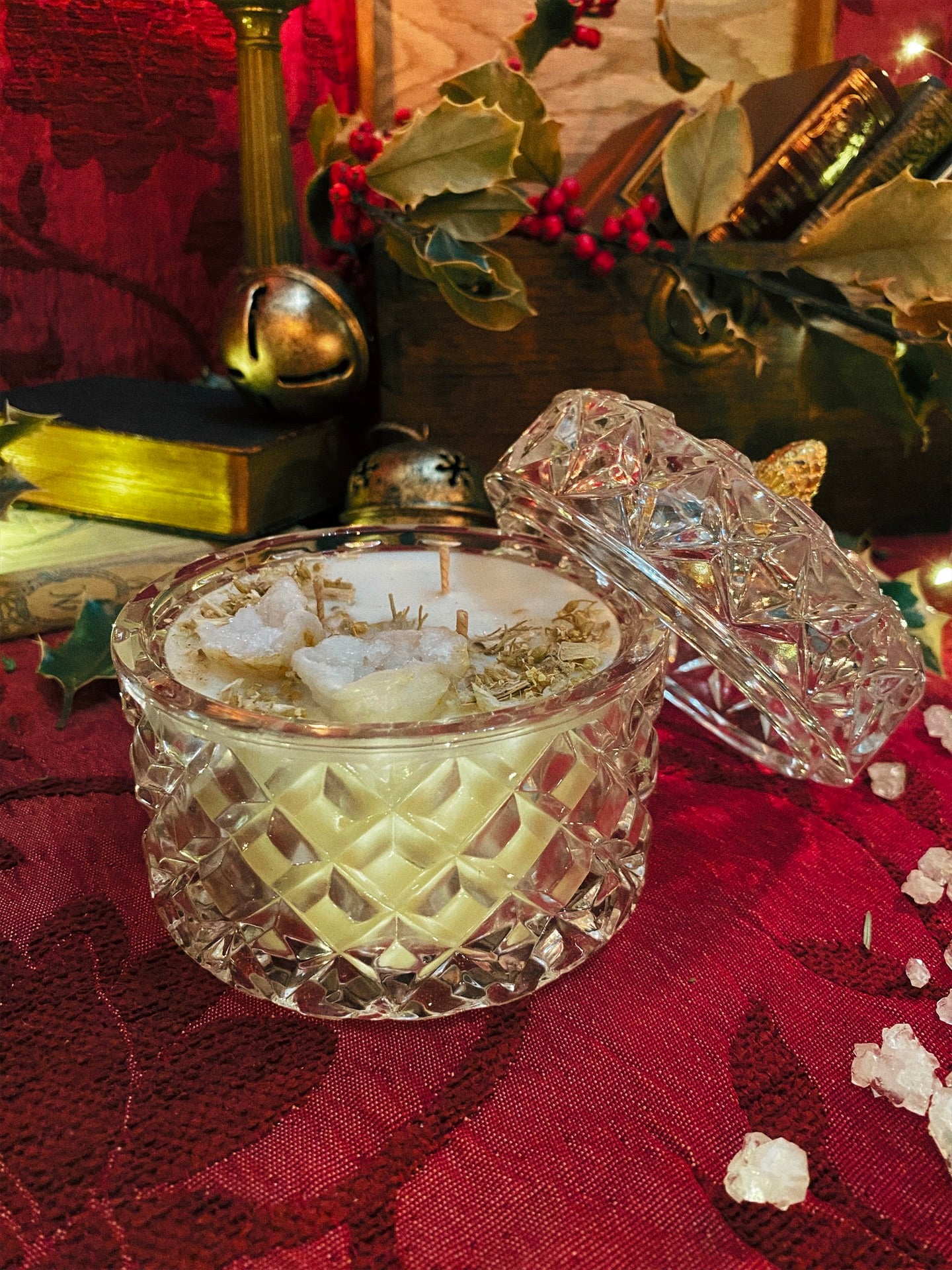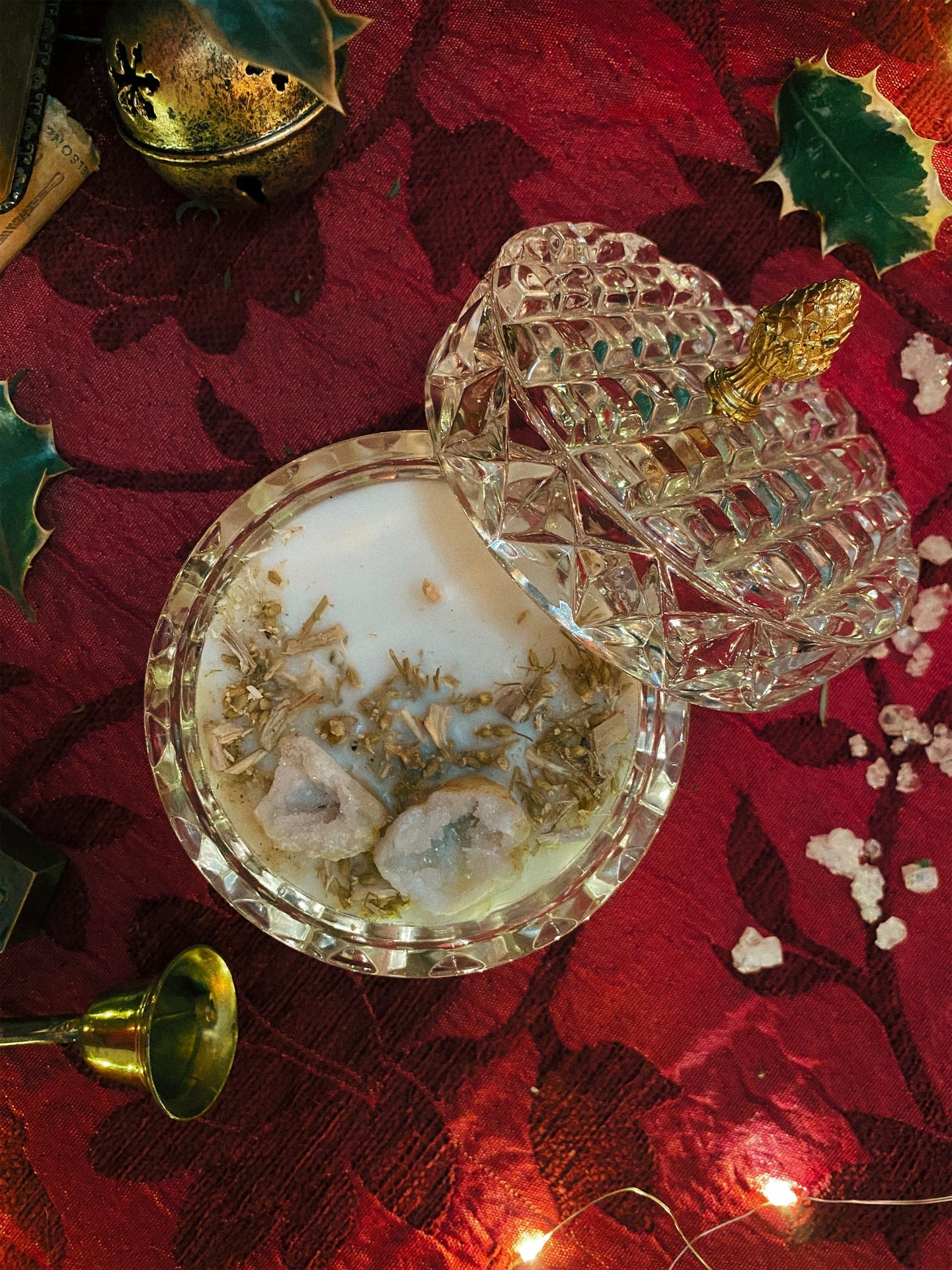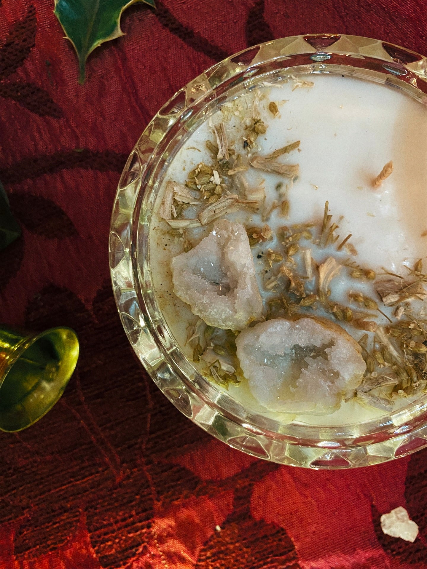 Cette flamme est ornée d’une géode de plantes consacrées aux vertus spirituelles puissantes. Pierres issues de mines éthiques, plantes cueillies avec soin ou bio. 255gr de cire de coco 100 % naturelle, végane, sans OGM. Mèche en coton bio ou bois d’érable. 50h de combustion. ⌀11,5cm/9cm.