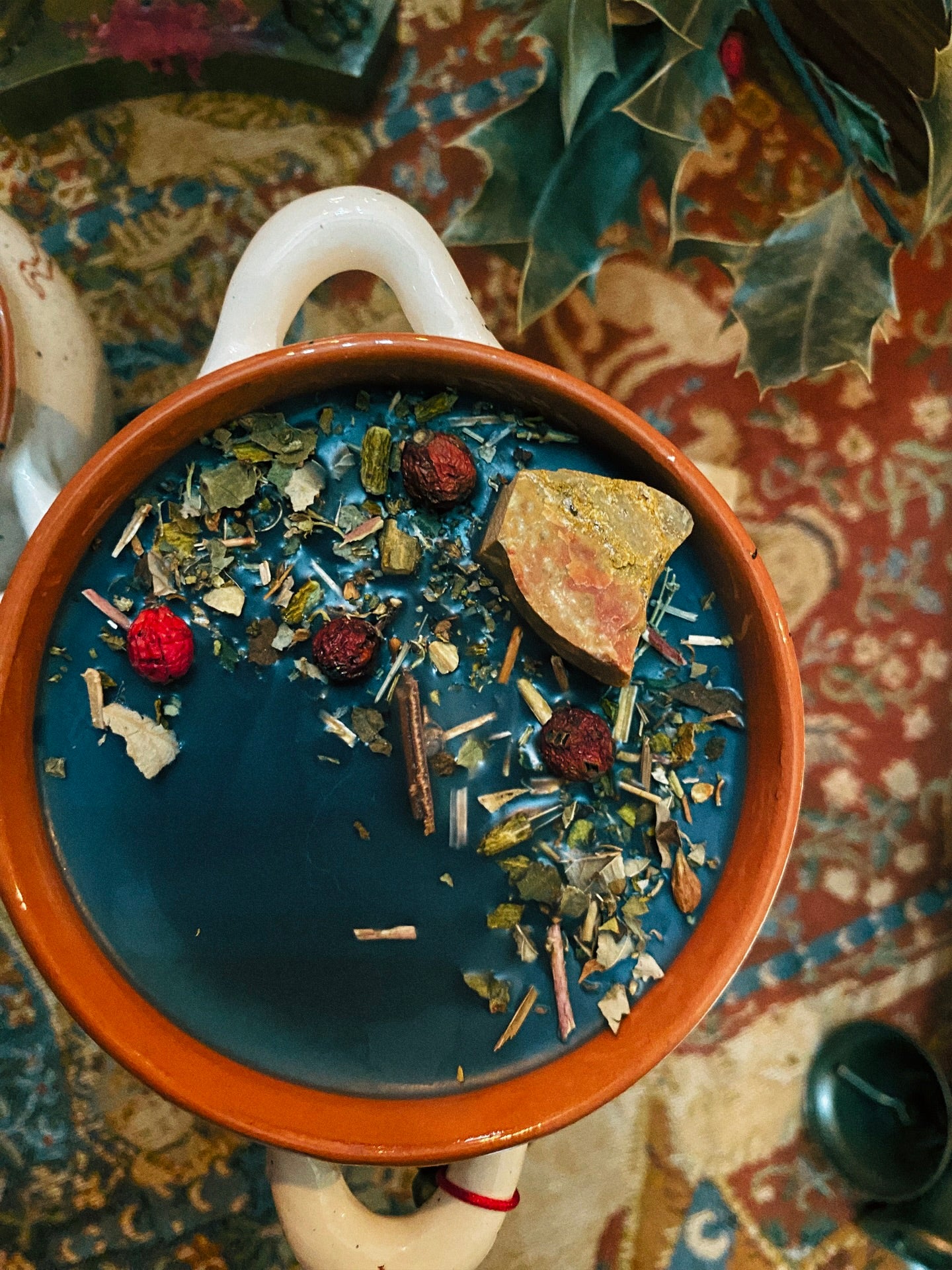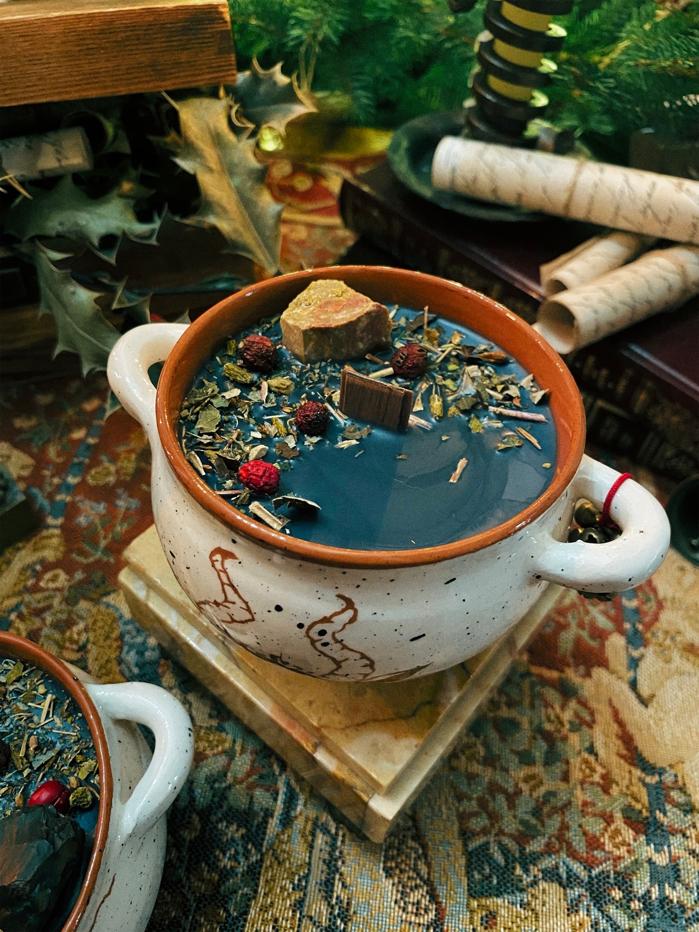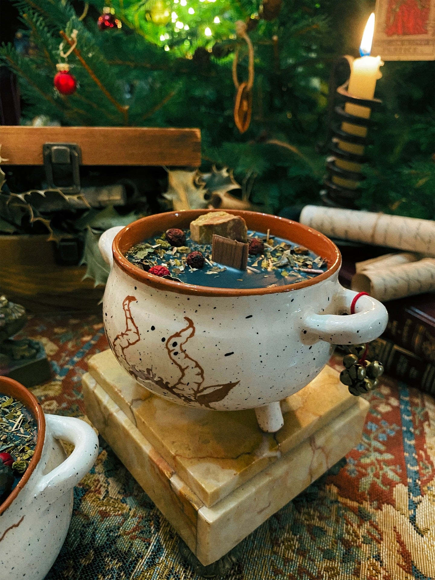 Cette flamme est ornée d’une jaspe, de grelots et de plantes consacrées aux vertus spirituelles puissantes. Pierres issues de mines éthiques, plantes cueillies avec soin ou bio. 258gr de cire de coco 100 % naturelle, végane, sans OGM. Mèche en coton bio ou bois d’érable. 32h de combustion. ⌀9cm/6cm.