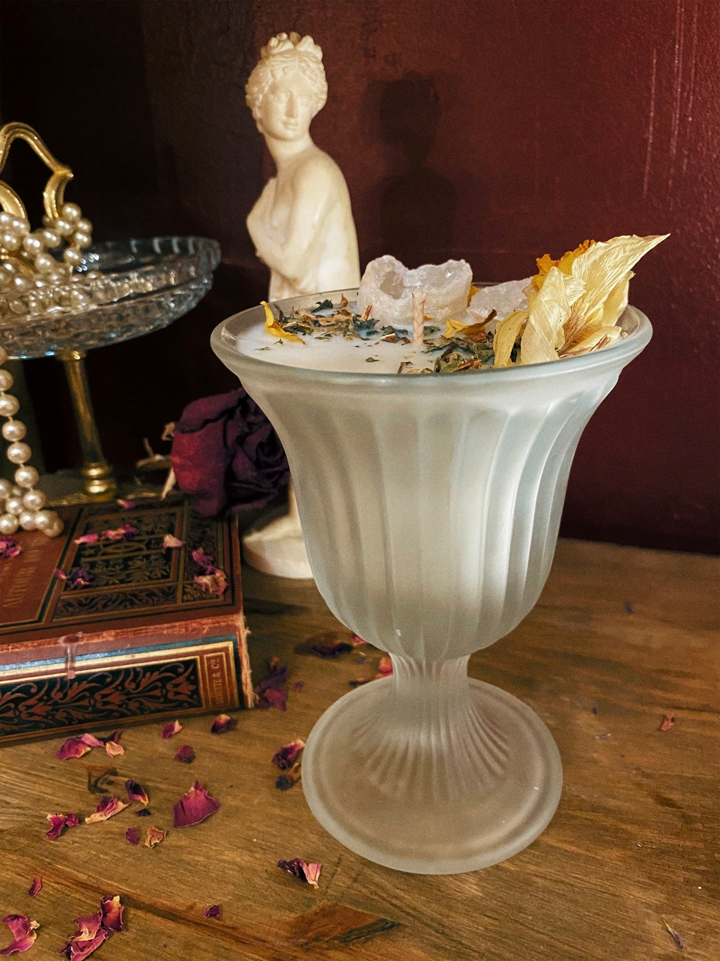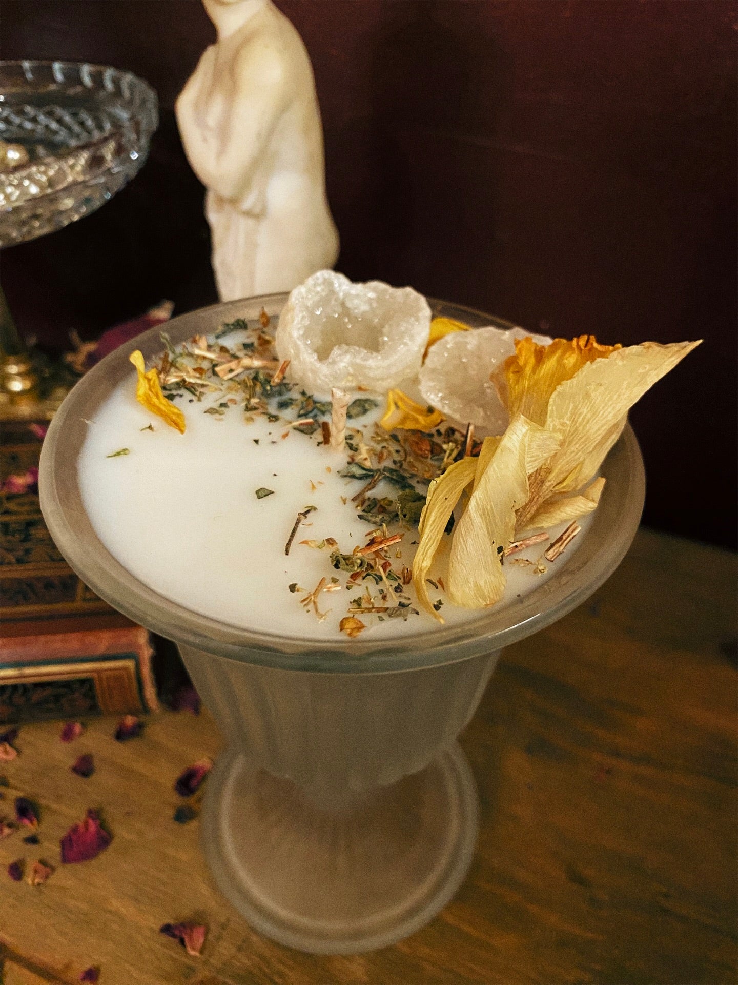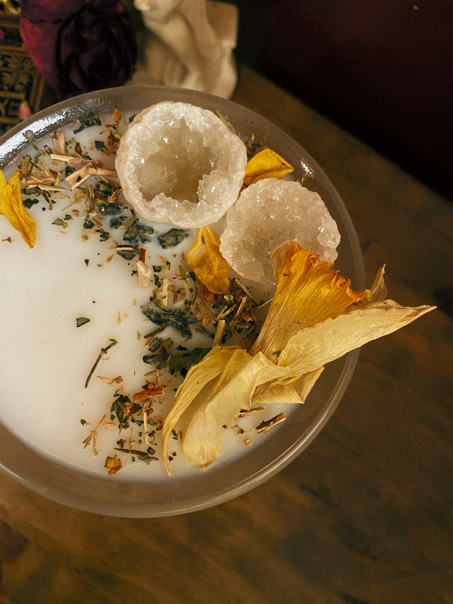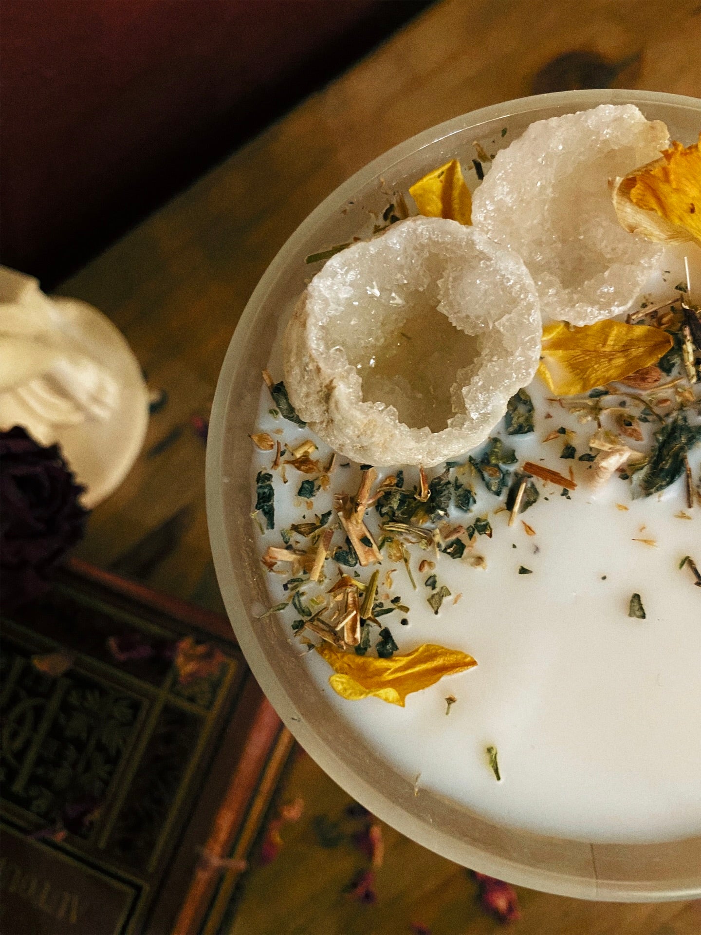 Cette flamme est ornée d’une géode de cristal de roche et de plantes consacrées aux vertus spirituelles puissantes. Pierres issues de mines éthiques, plantes cueillies avec soin ou bio. 175gr de cire de coco 100 % naturelle, végane, sans OGM. Mèche en coton bio ou bois d’érable. 30h de combustion. ⌀10cm/15cm.