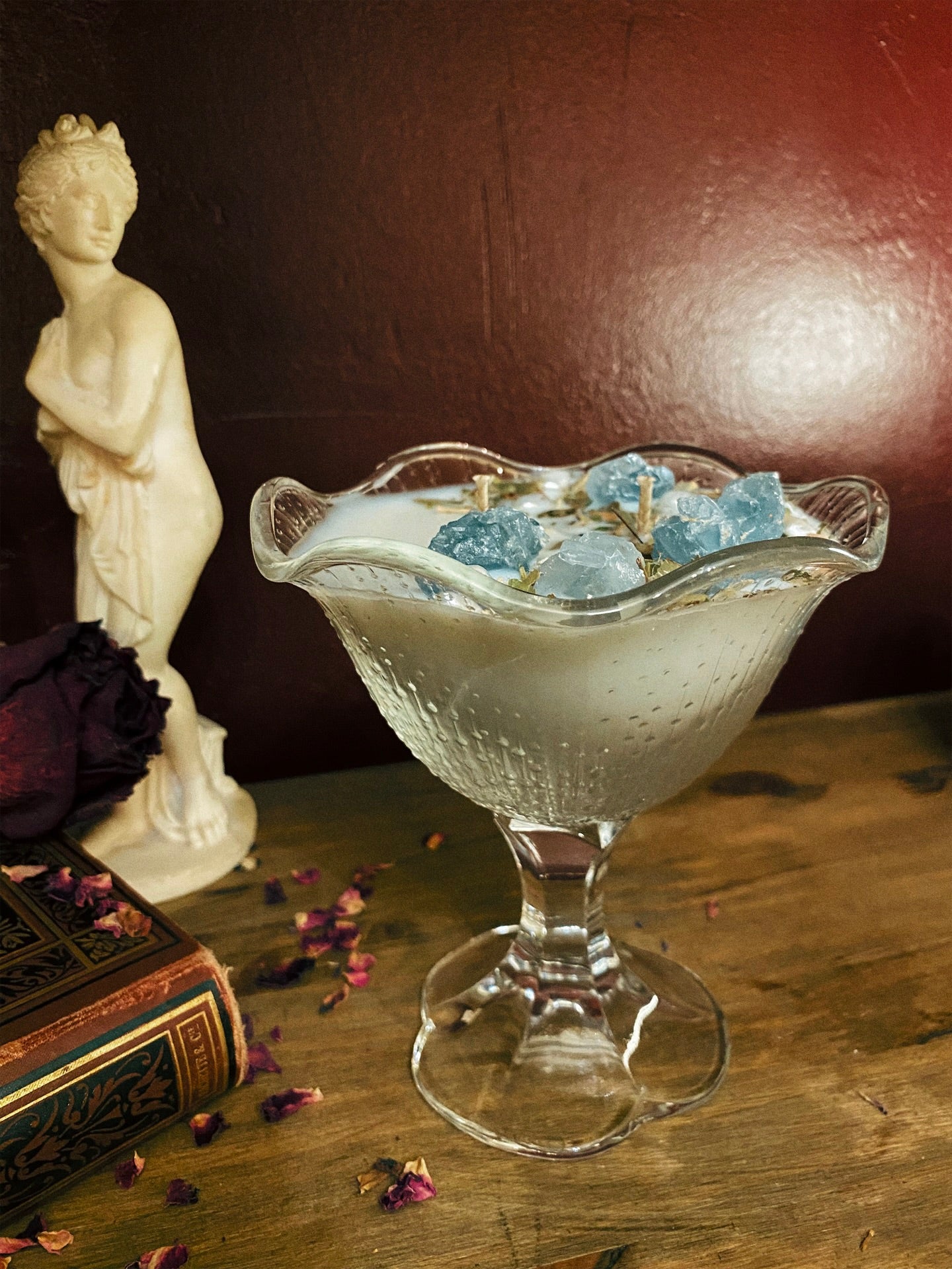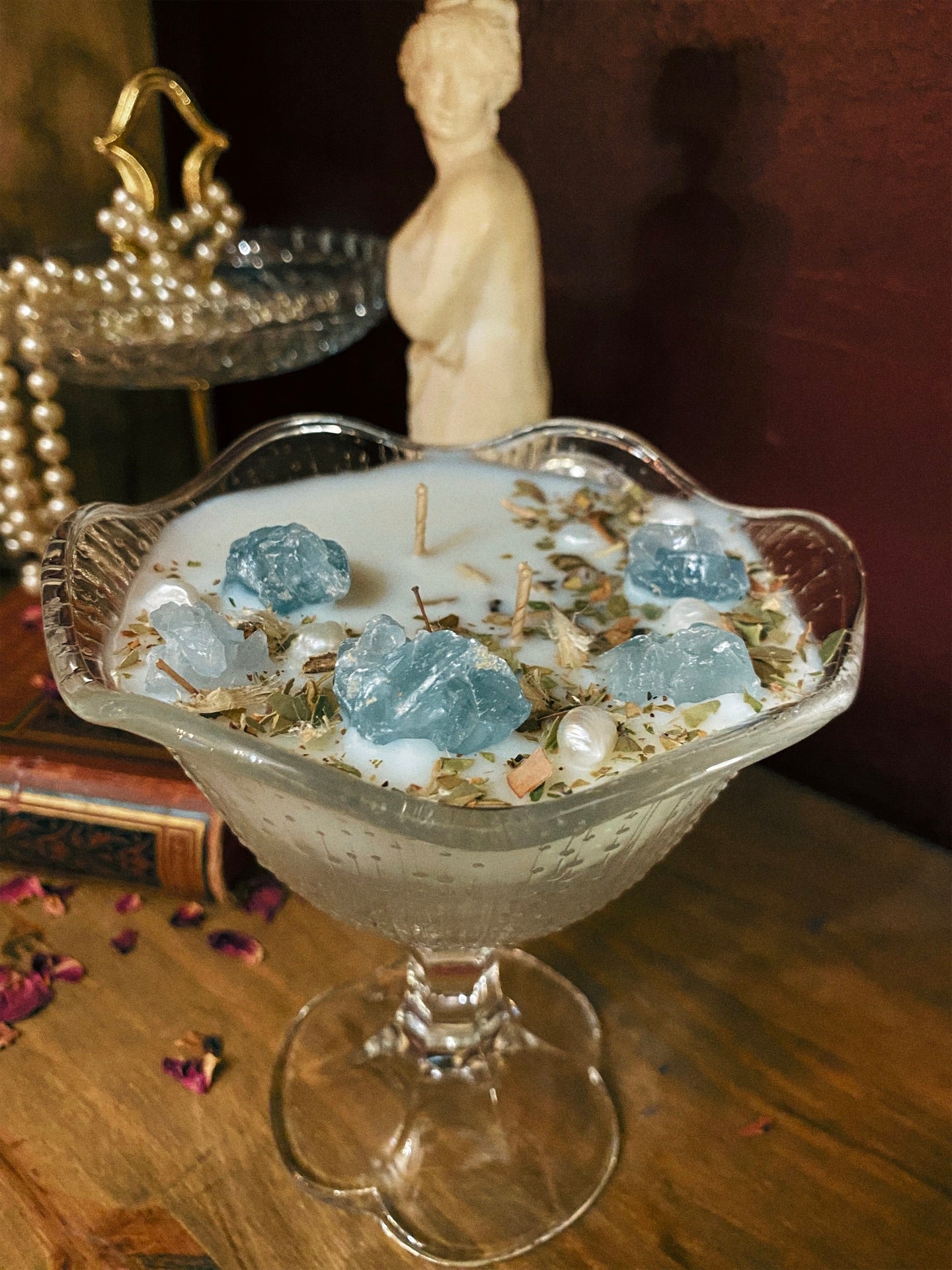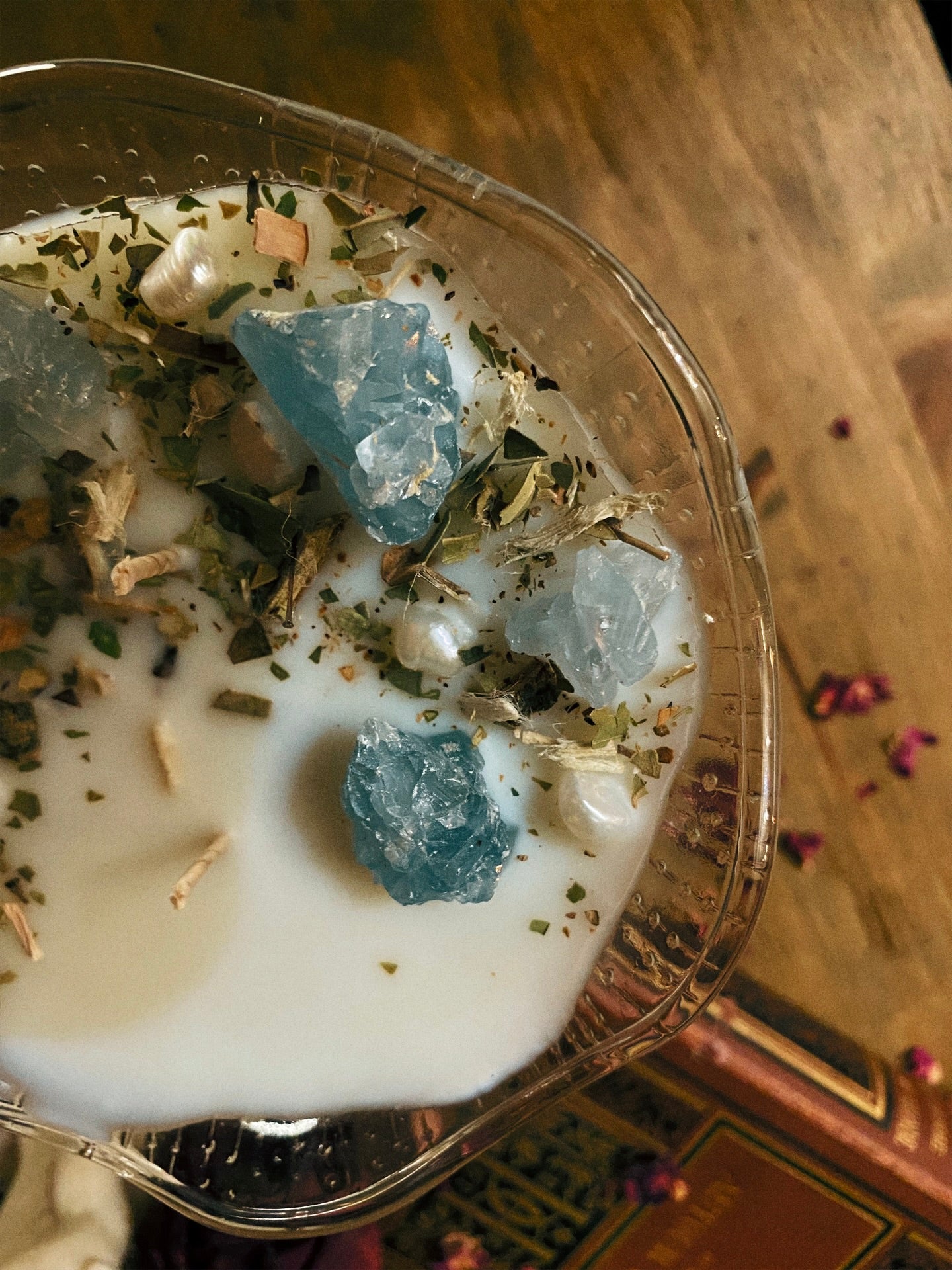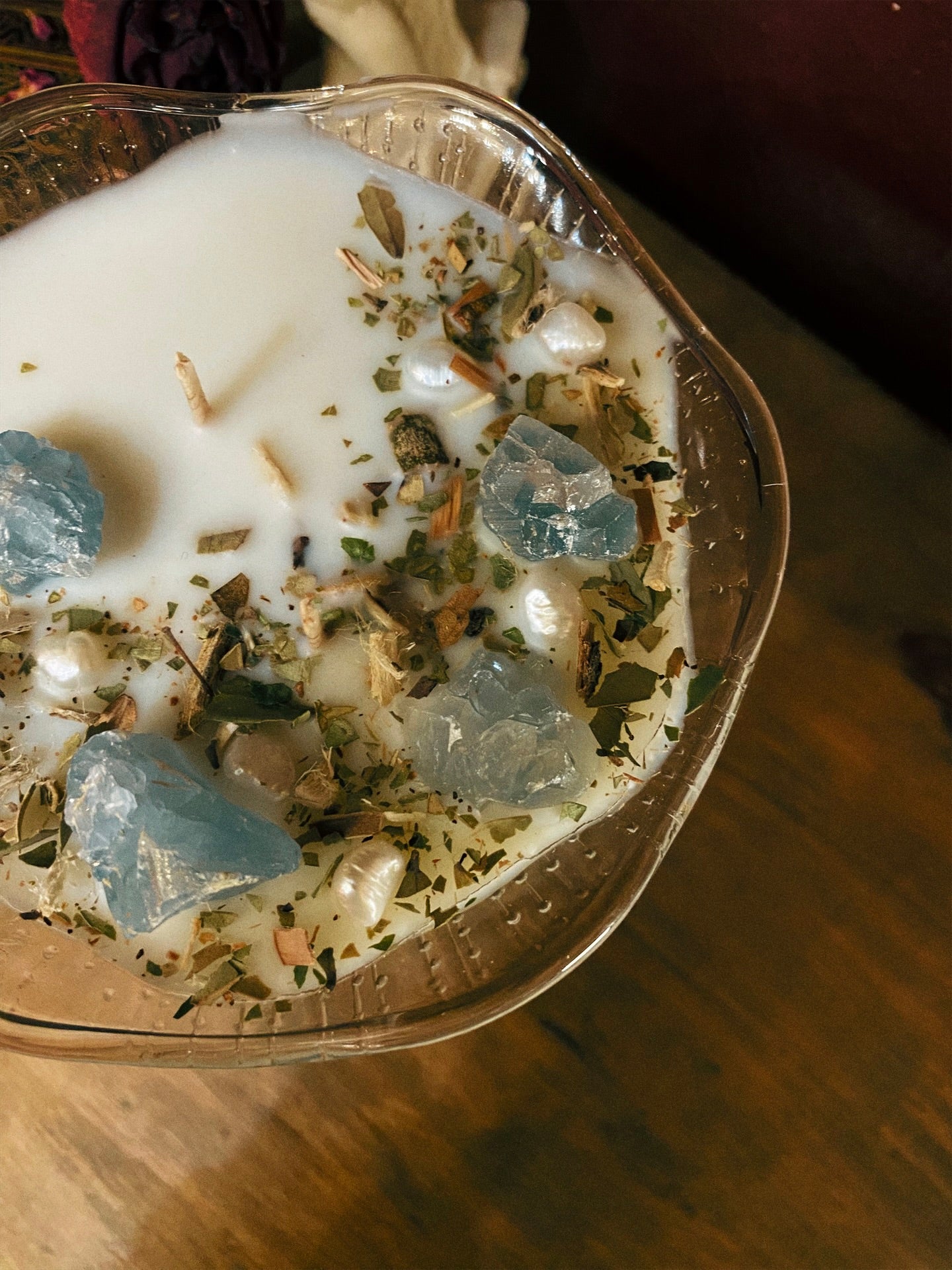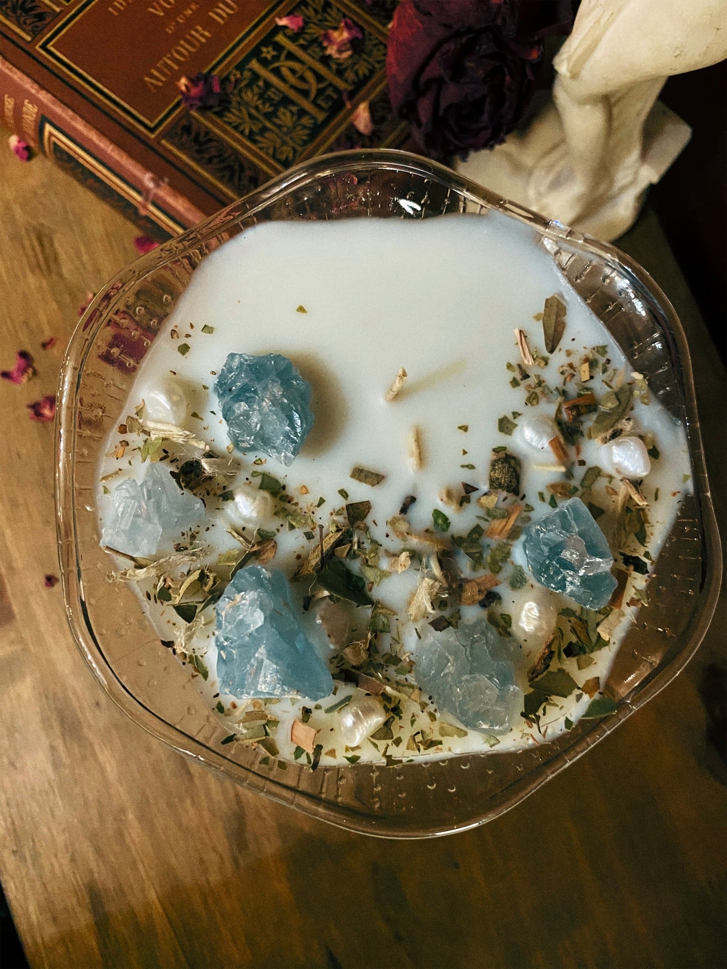 Cette flamme est ornée de véritables perles d’eau douce, de célestines et de plantes consacrées aux vertus spirituelles puissantes. Pierres issues de mines éthiques, plantes cueillies avec soin ou bio. 227gr de cire de coco 100 % naturelle, végane, sans OGM. Mèche en coton bio ou bois d’érable. 30h de combustion. ⌀13cm/14cm.
