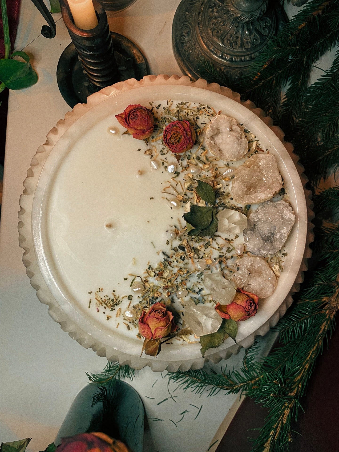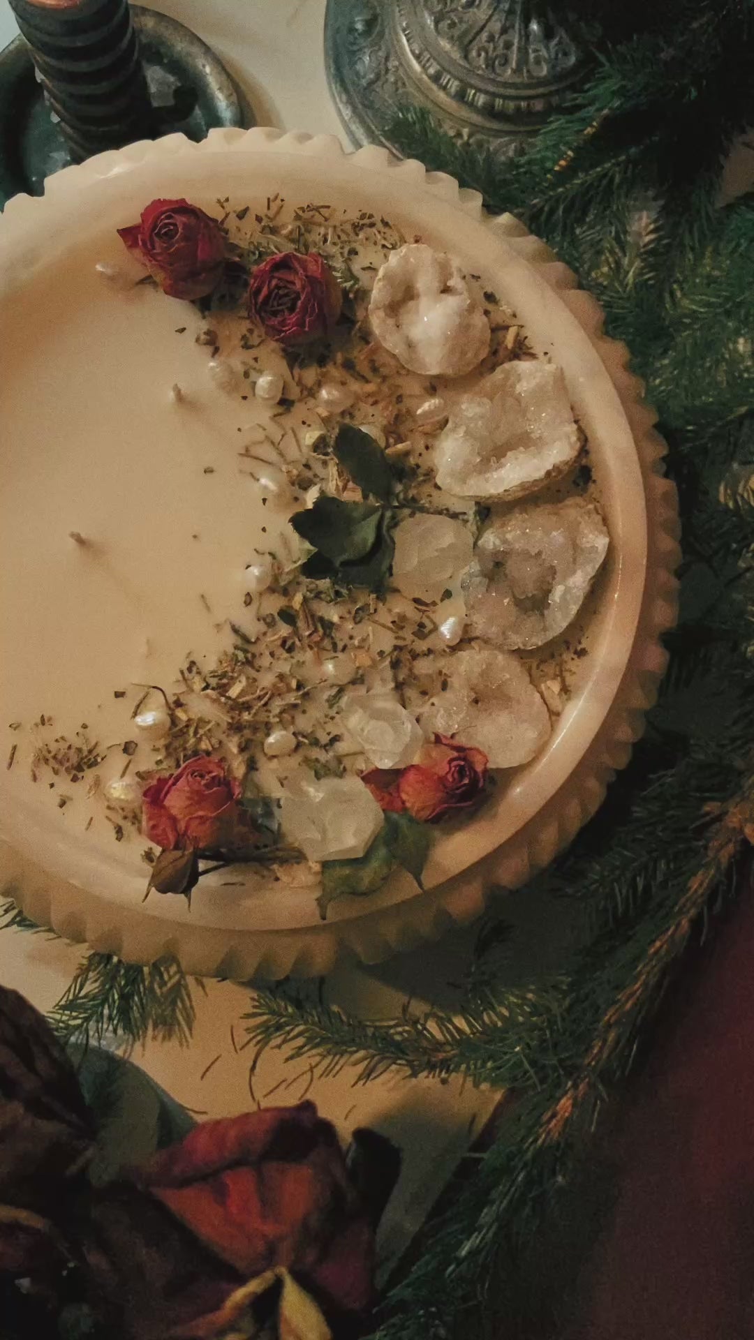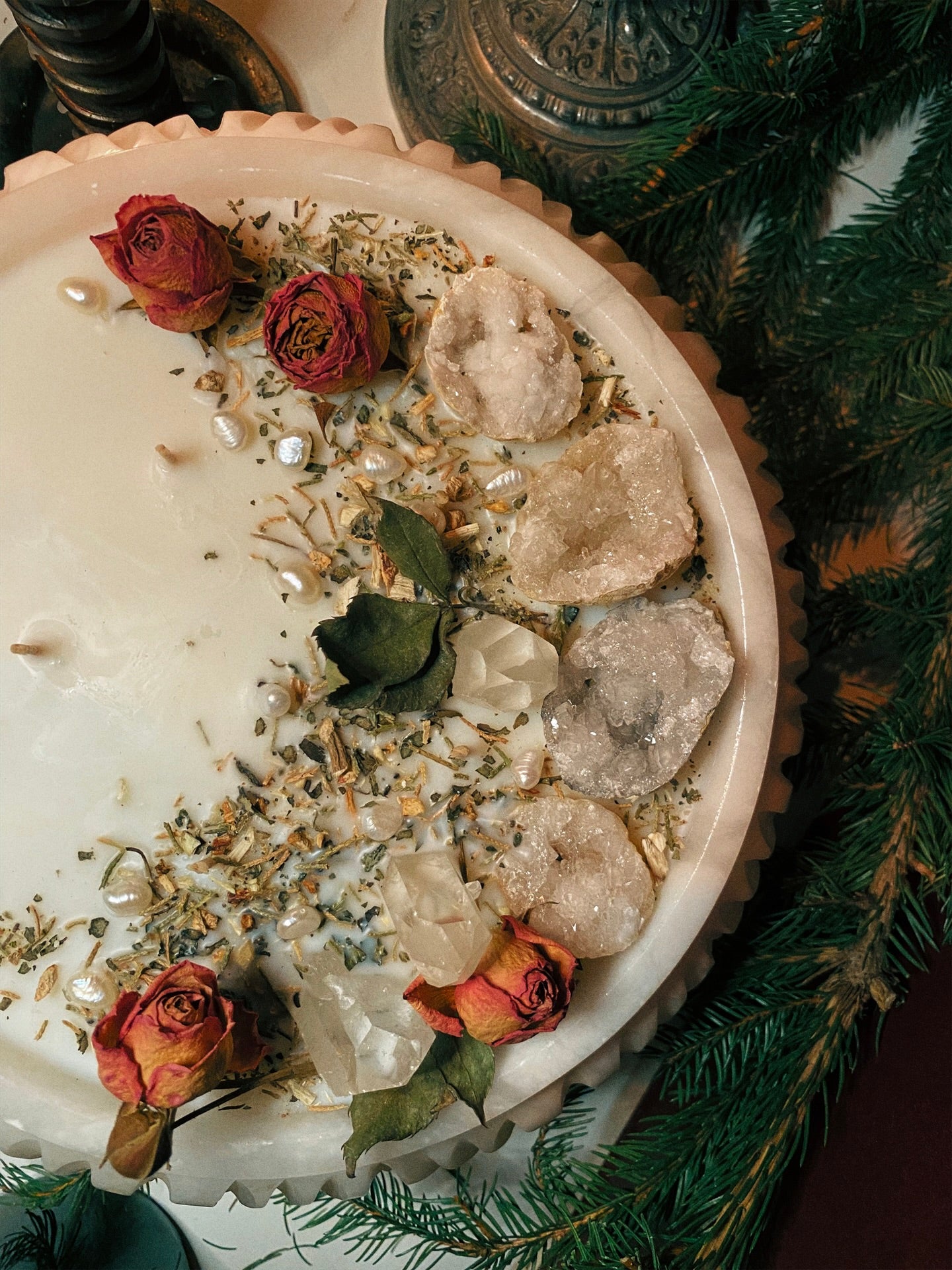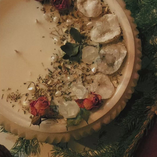 Cette flamme est ornée géodes, de pointes de quartz et de plantes consacrées aux vertus spirituelles puissantes. Pierres issues de mines éthiques, plantes cueillies avec soin ou bio. 912gr de cire de coco 100 % naturelle, végane, sans OGM. Mèche en coton bio ou bois d’érable. 120h de combustion. ⌀25cm/15cm.