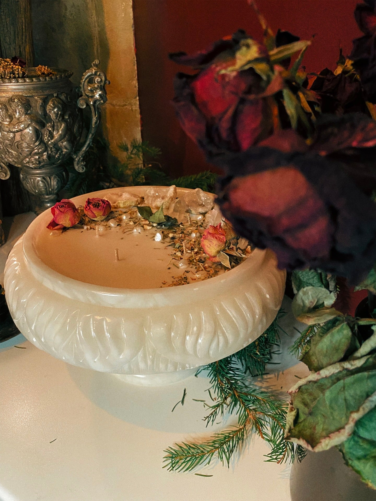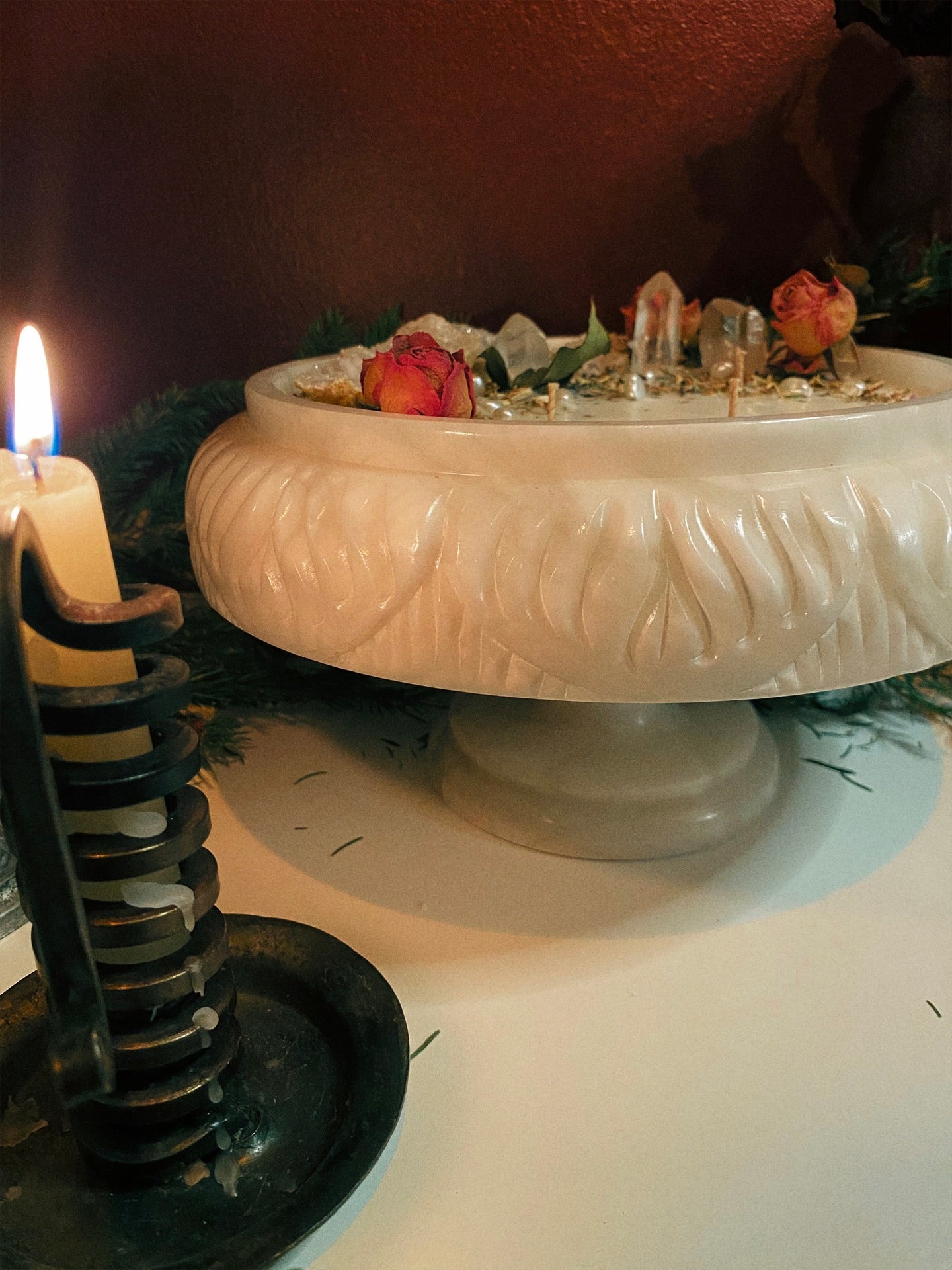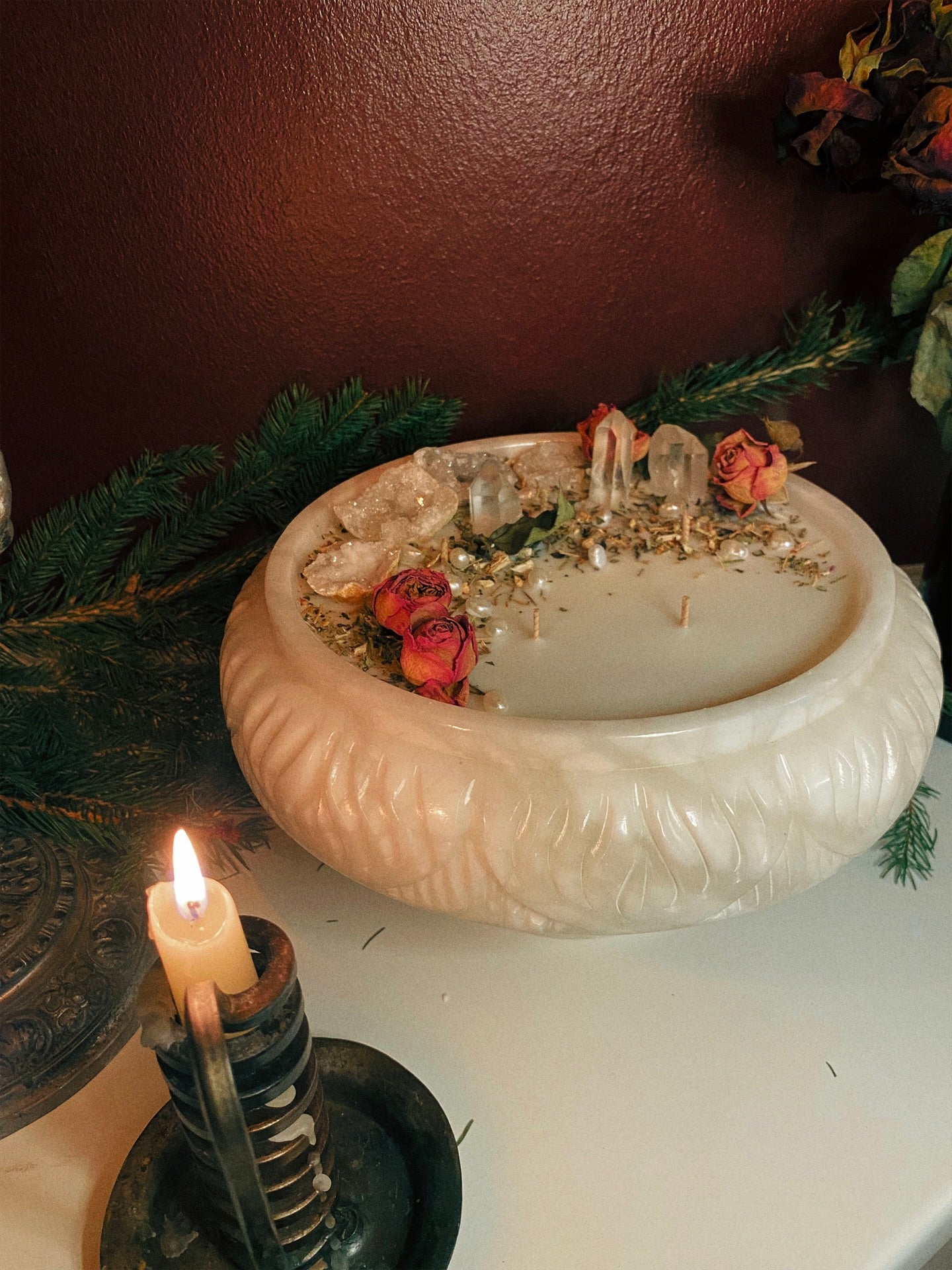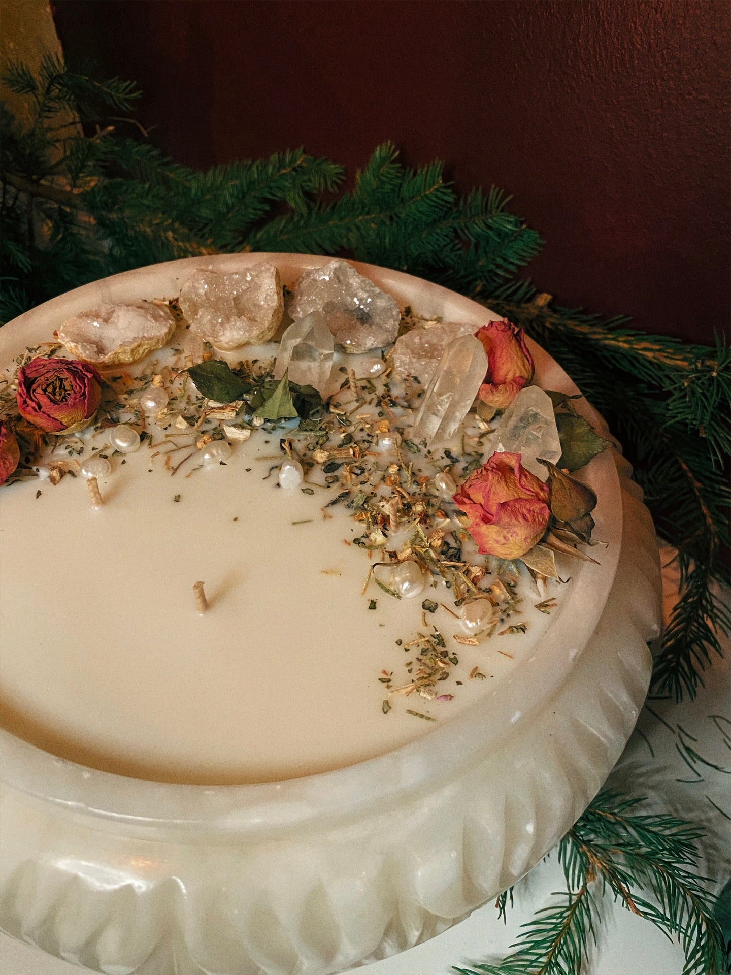 Cette flamme est ornée géodes, de pointes de quartz et de plantes consacrées aux vertus spirituelles puissantes. Pierres issues de mines éthiques, plantes cueillies avec soin ou bio. 912gr de cire de coco 100 % naturelle, végane, sans OGM. Mèche en coton bio ou bois d’érable. 120h de combustion. ⌀25cm/15cm.
