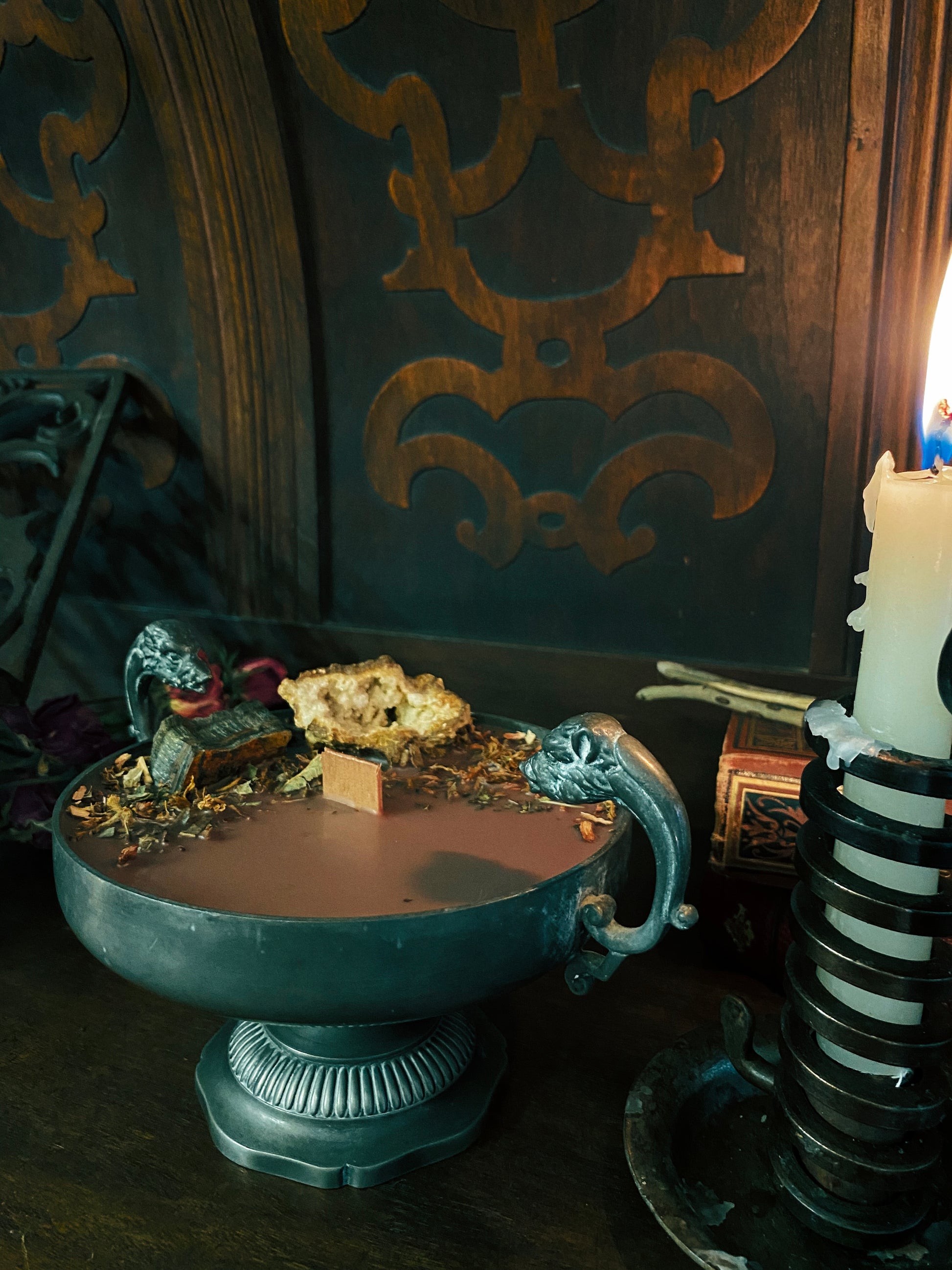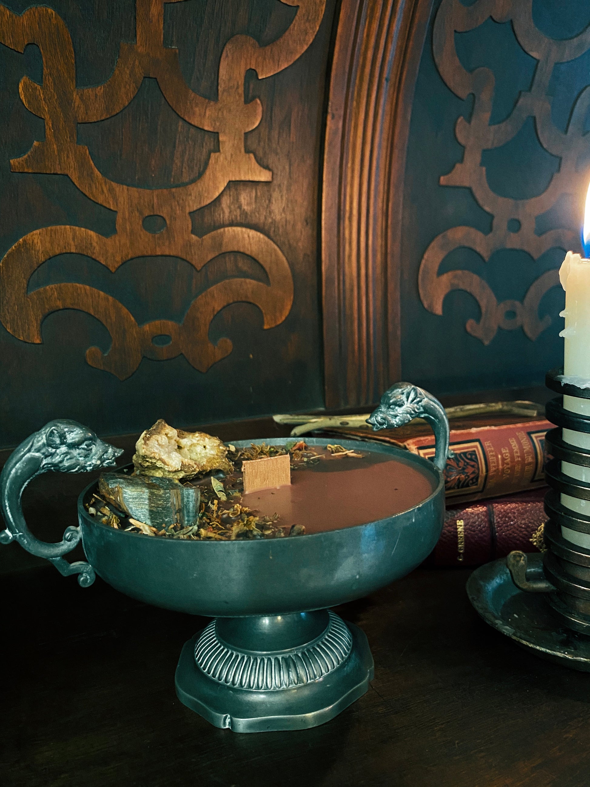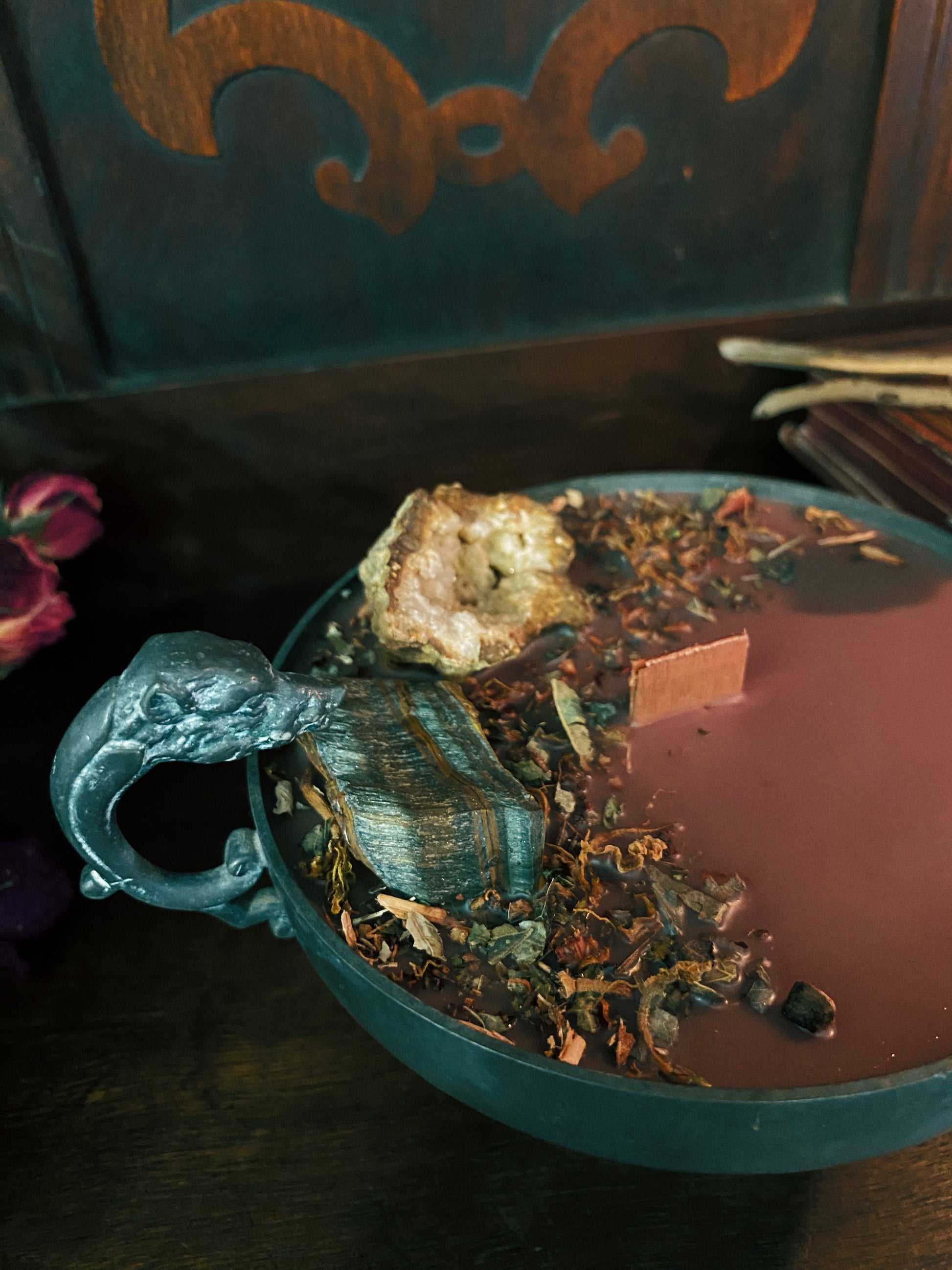 Ornée d’un œil de tigre, d’un morceau de géode et de plantes consacrées aux vertus spirituelles, cette flamme est accompagnée d’un livret détaillant son histoire, ses symboles et ses secrets. Pierres issues de mines éthiques, plantes cueillies avec soin ou bio. 302g de cire de coco 100 % naturelle, végane, sans OGM. Mèche en coton bio ou bois d’érable. 50h de combustion. ⌀18cm/12cm.