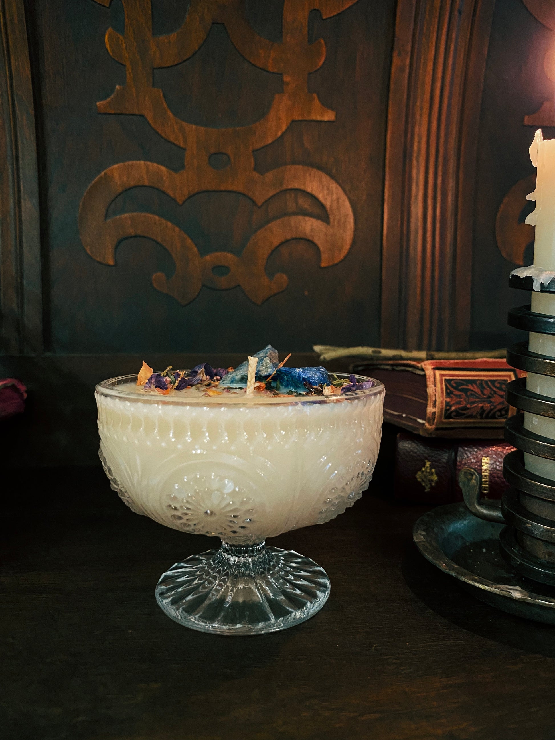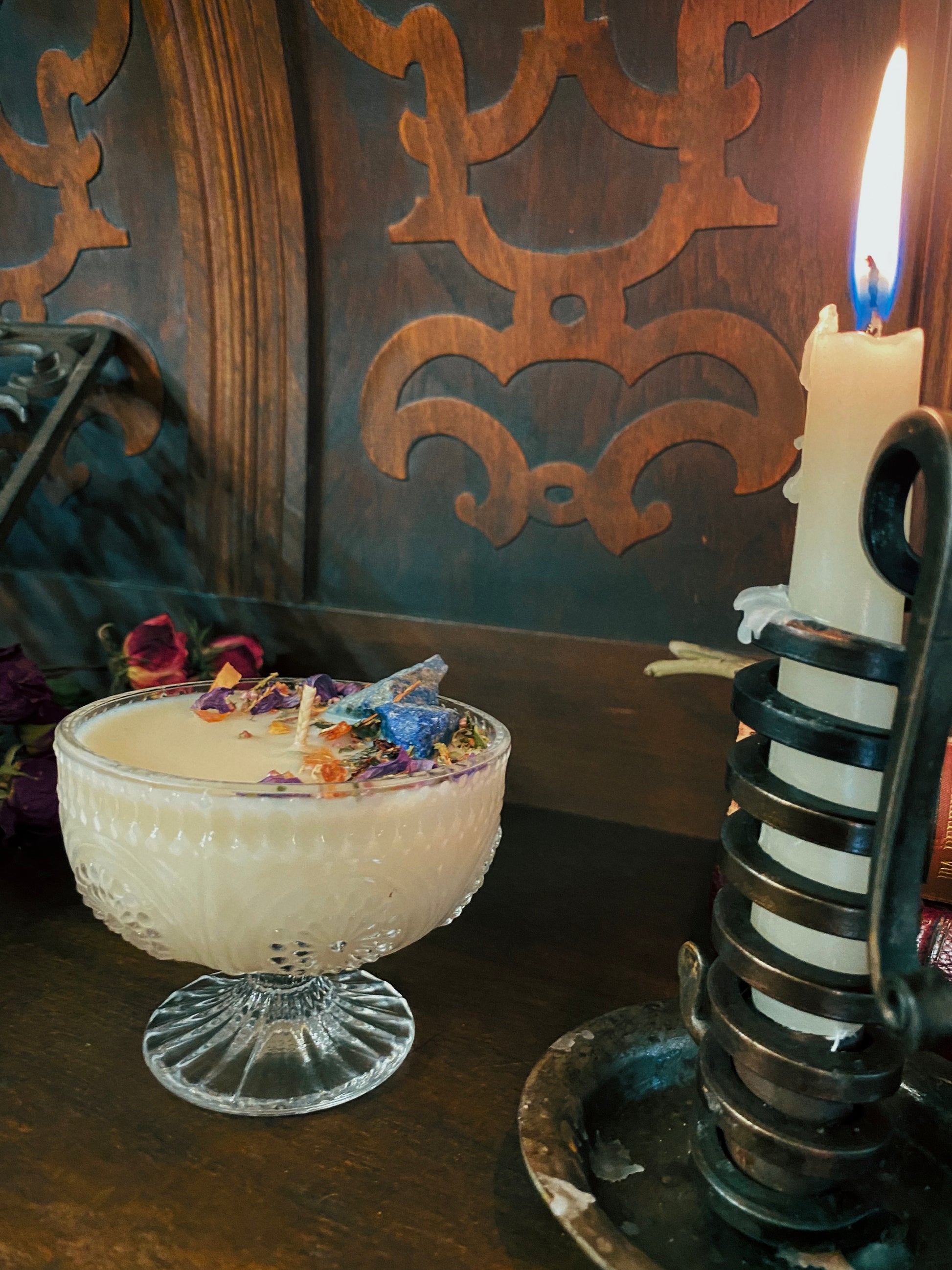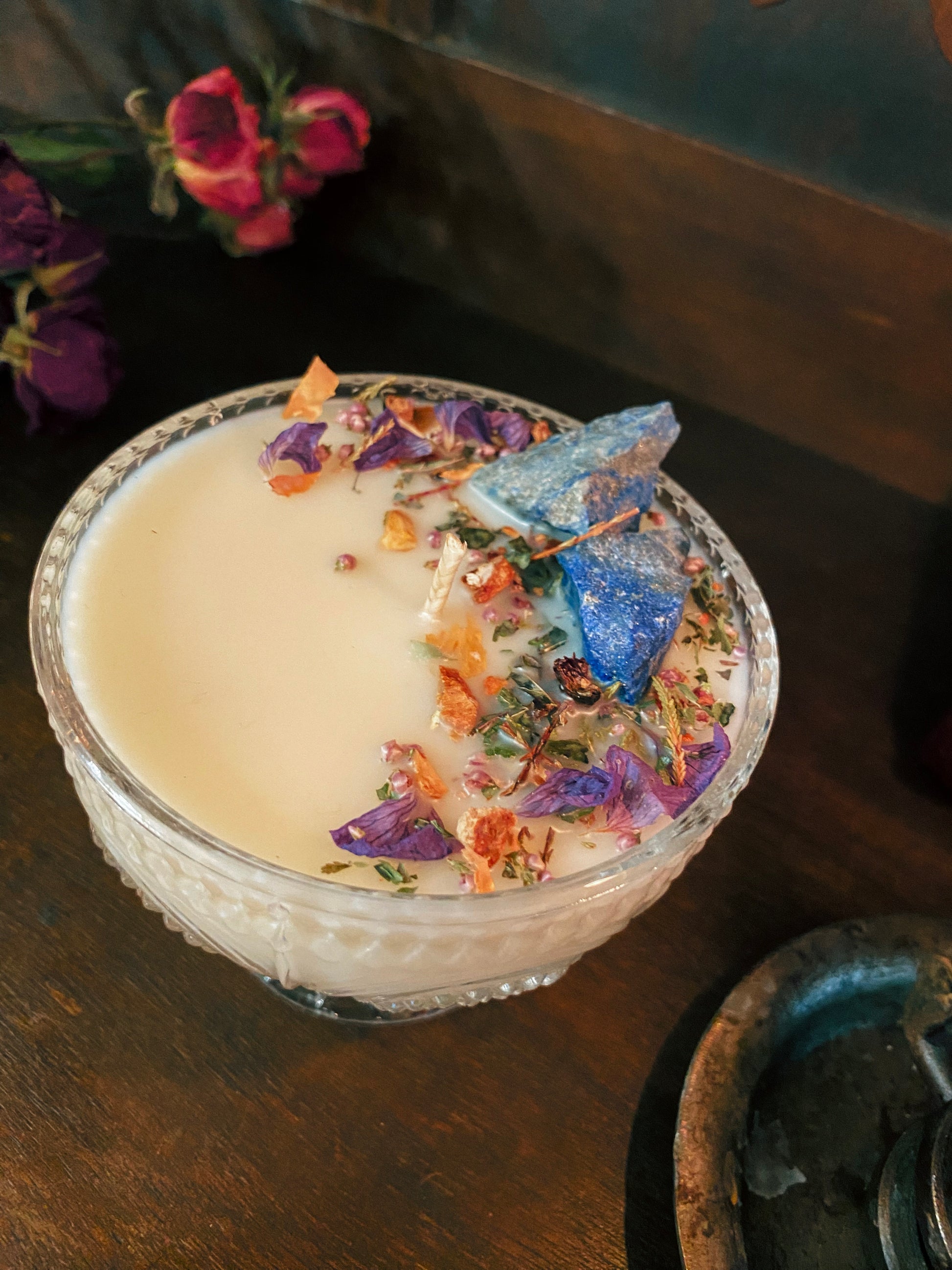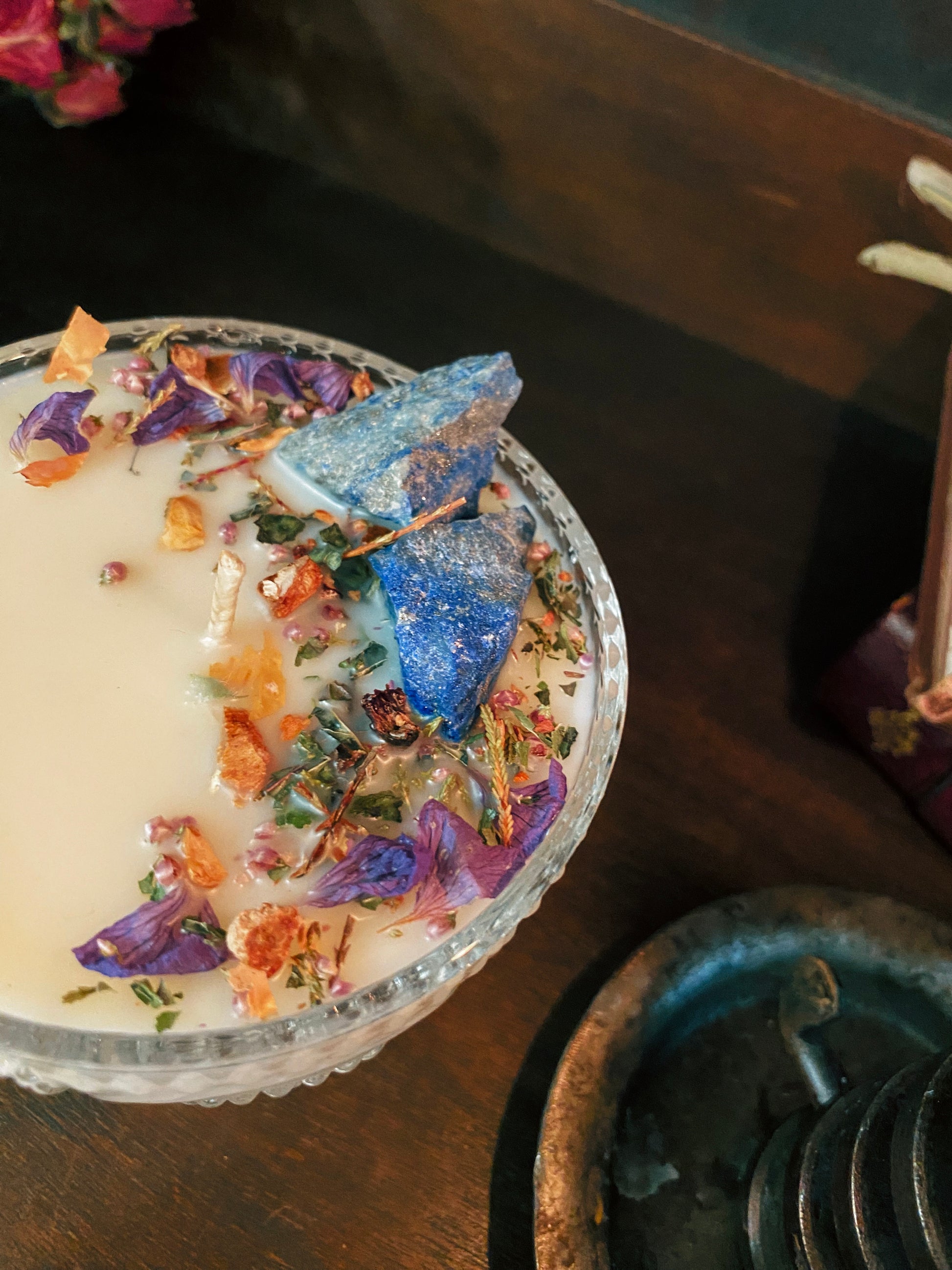 Ornée de lapis lazuli et de plantes consacrées aux vertus spirituelles, cette flamme est accompagnée d’un livret détaillant son histoire, ses symboles et ses secrets. Pierres issues de mines éthiques, plantes cueillies avec soin ou bio. 160g de cire de coco 100 % naturelle, végane, sans OGM. Mèche en coton bio ou bois d’érable. 25h de combustion. ⌀10cm/8cm.