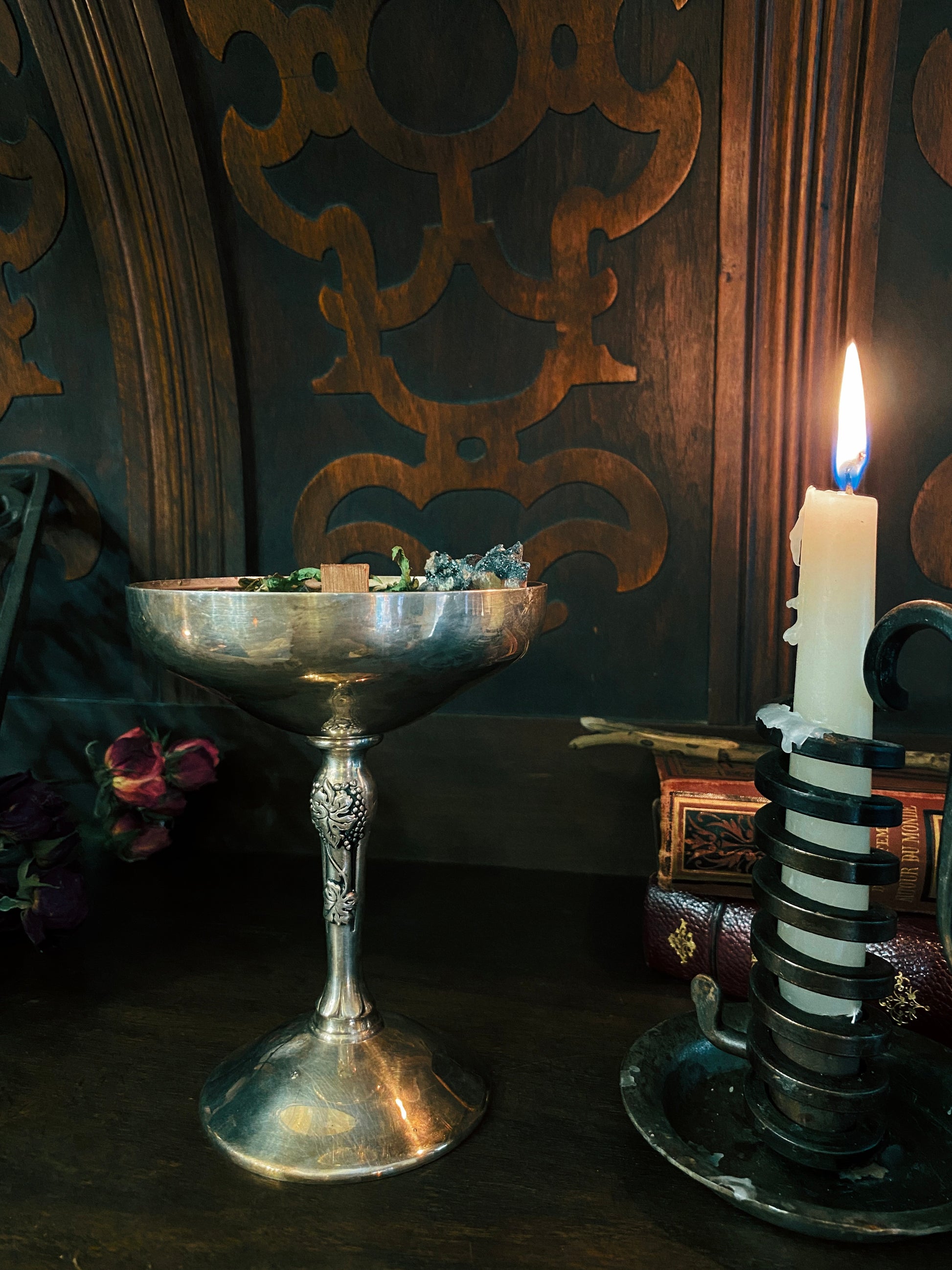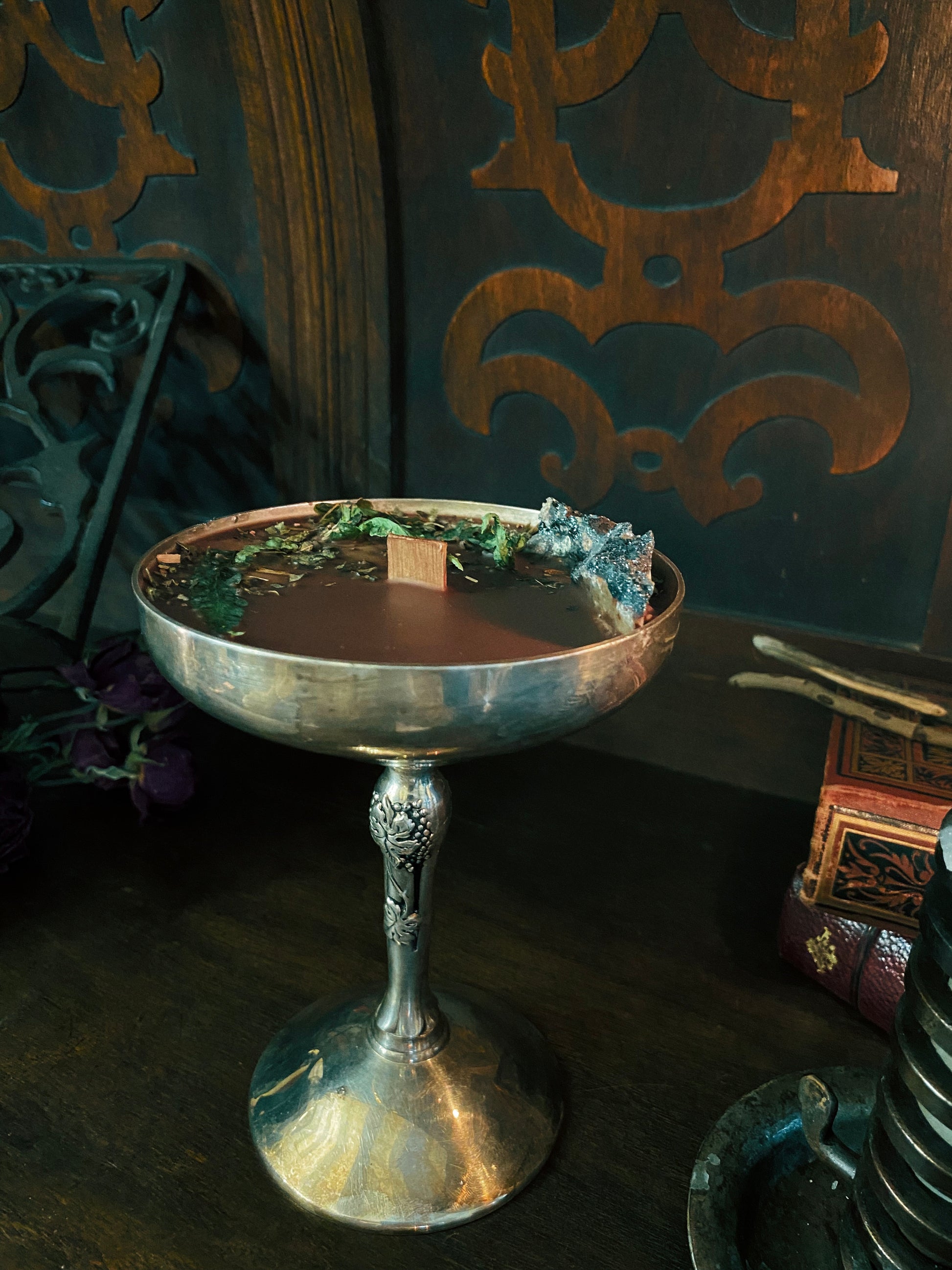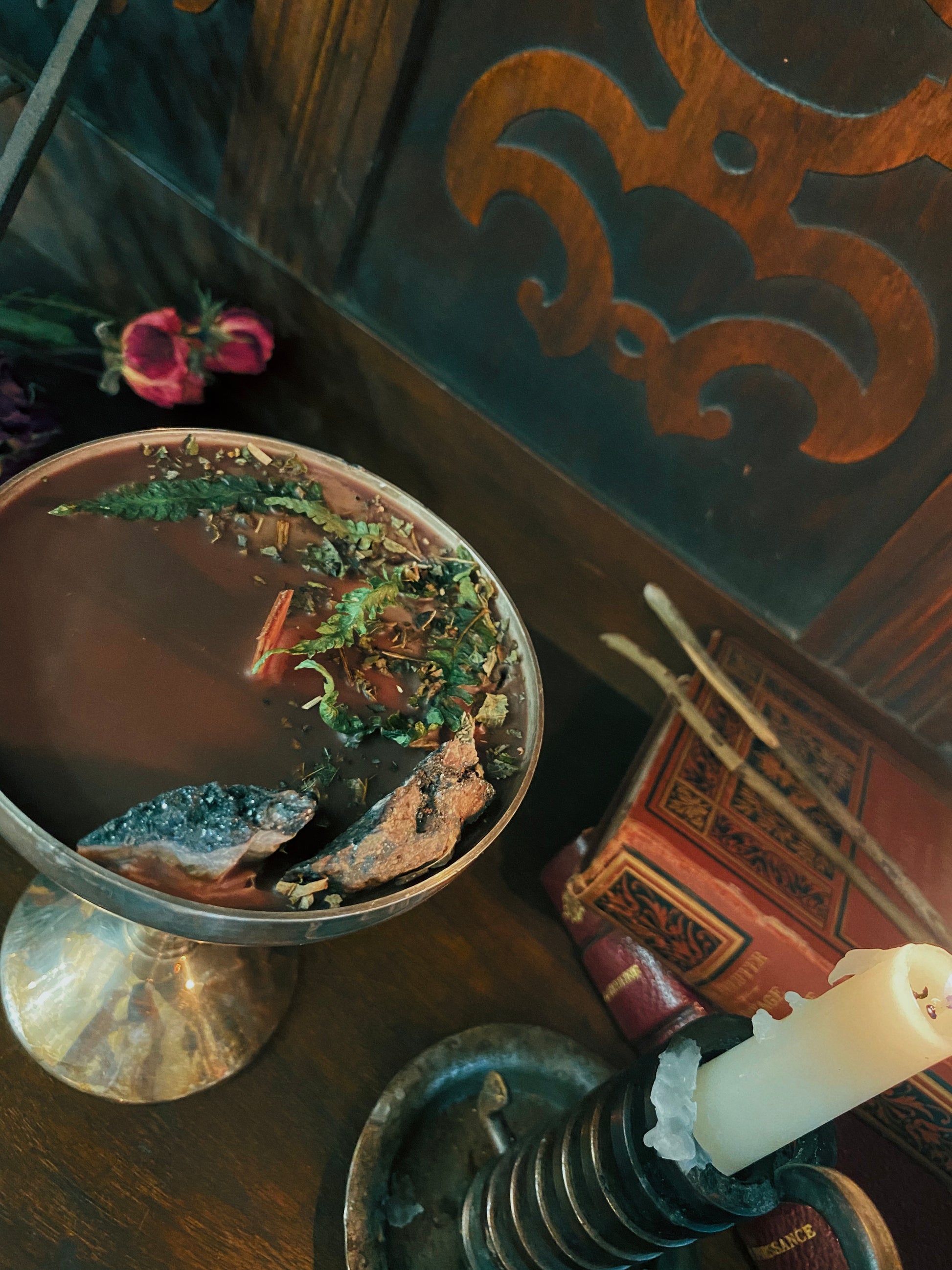 Ornée d‘hématites et de plantes consacrées aux vertus spirituelles, cette flamme est accompagnée d’un livret détaillant son histoire, ses symboles et ses secrets. Pierres issues de mines éthiques, plantes cueillies avec soin ou bio. 149g de cire de coco 100 % naturelle, végane, sans OGM. Mèche en coton bio ou bois d’érable. 29h de combustion. ⌀11cm/15cm.