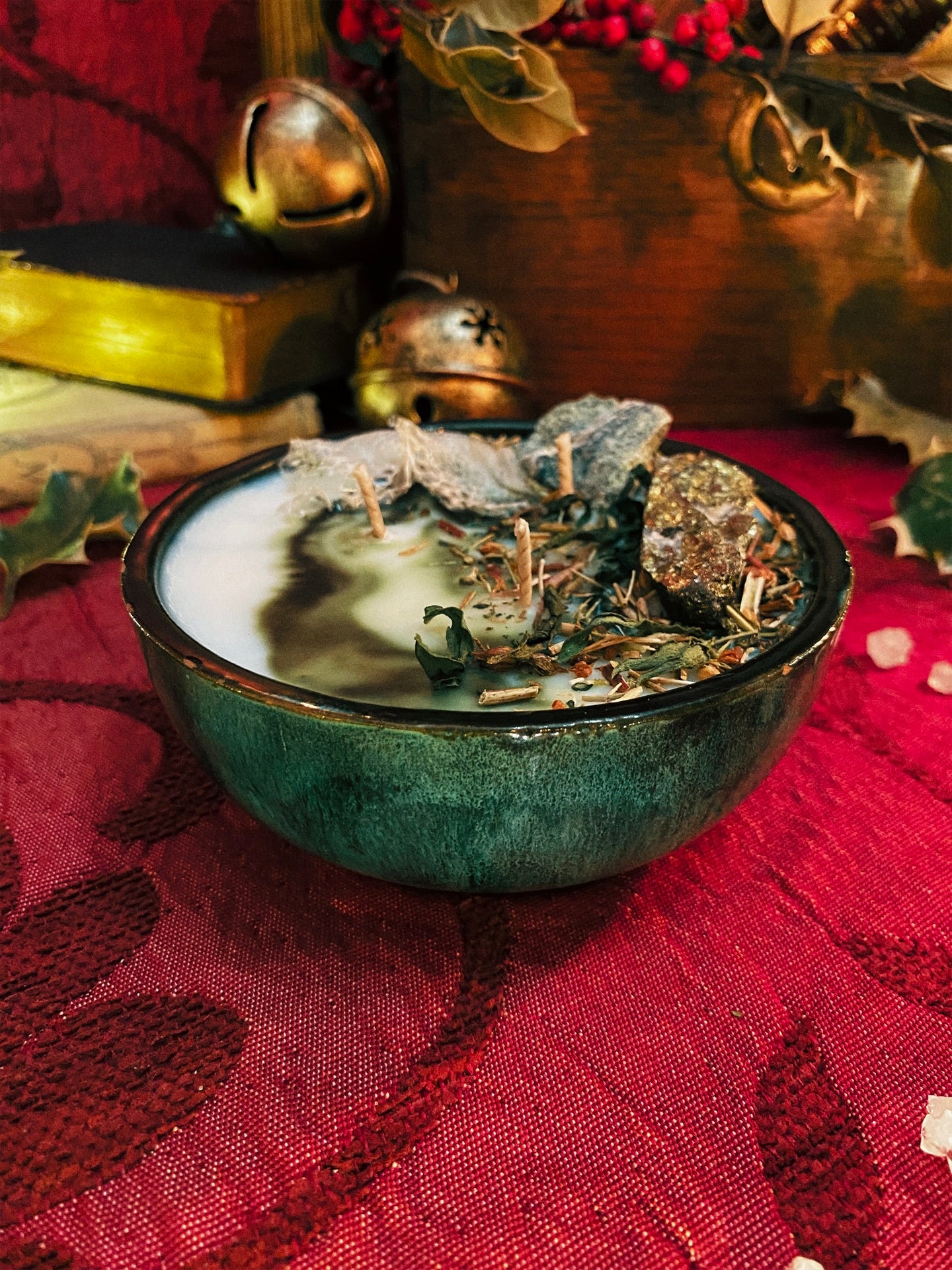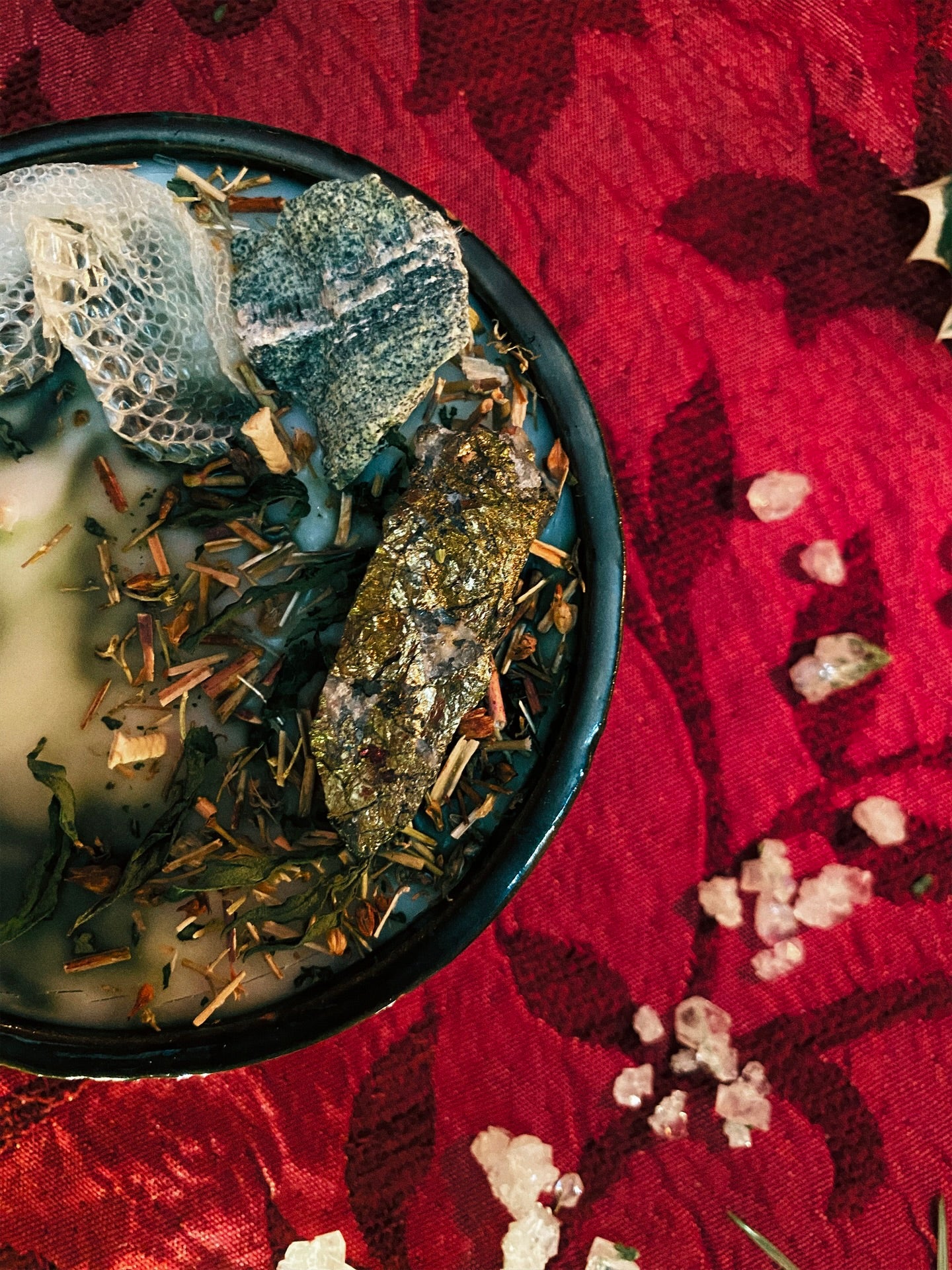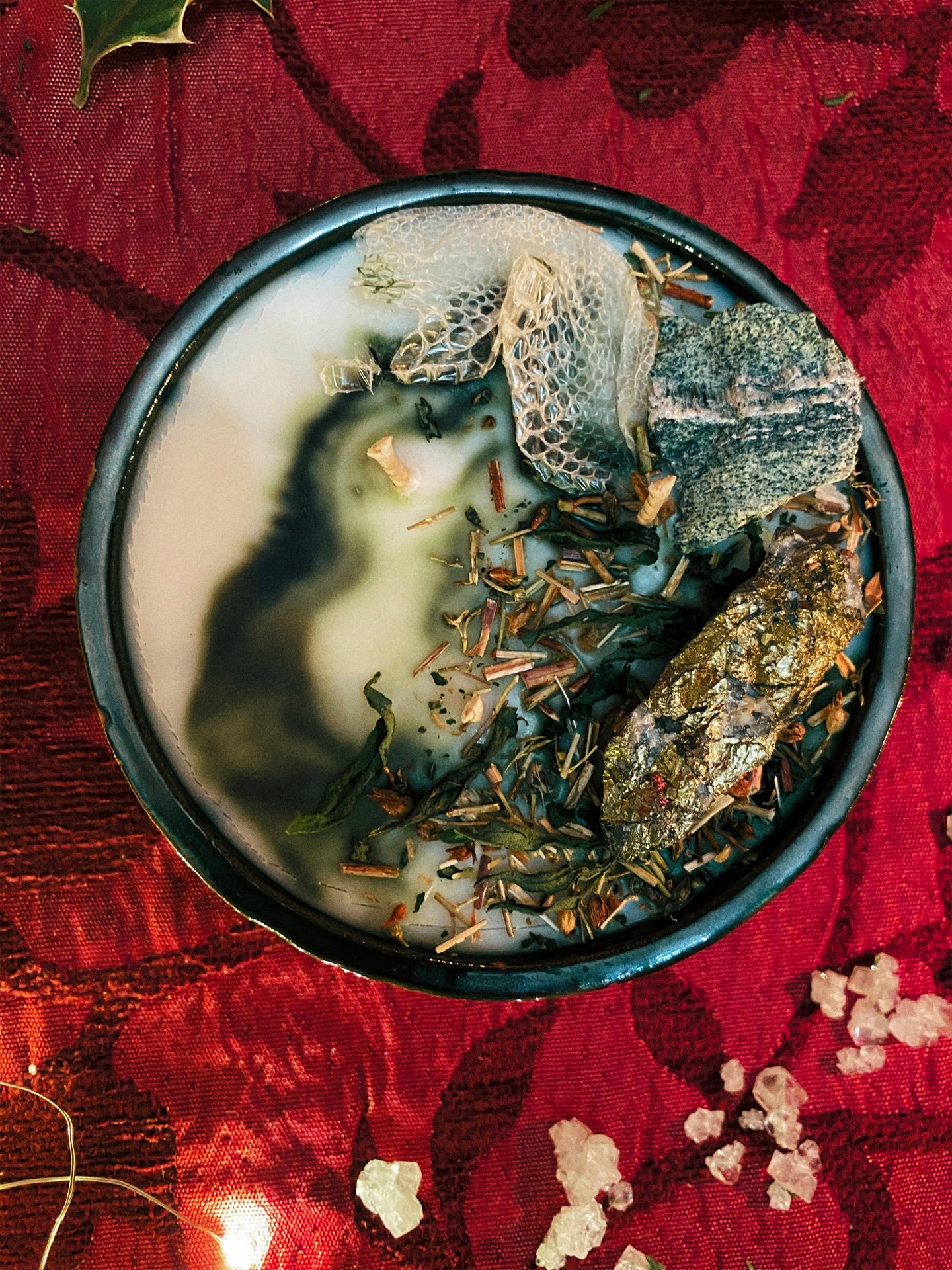 Cette flamme est ornée d’une serpentine, d’une chalcopyrite et de plantes consacrées aux vertus spirituelles puissantes. Pierres issues de mines éthiques, plantes cueillies avec soin ou bio. 200gr de cire de coco 100 % naturelle, végane, sans OGM. Mèche en coton bio ou bois d’érable. 45h de combustion. ⌀11,5cm/5cm.