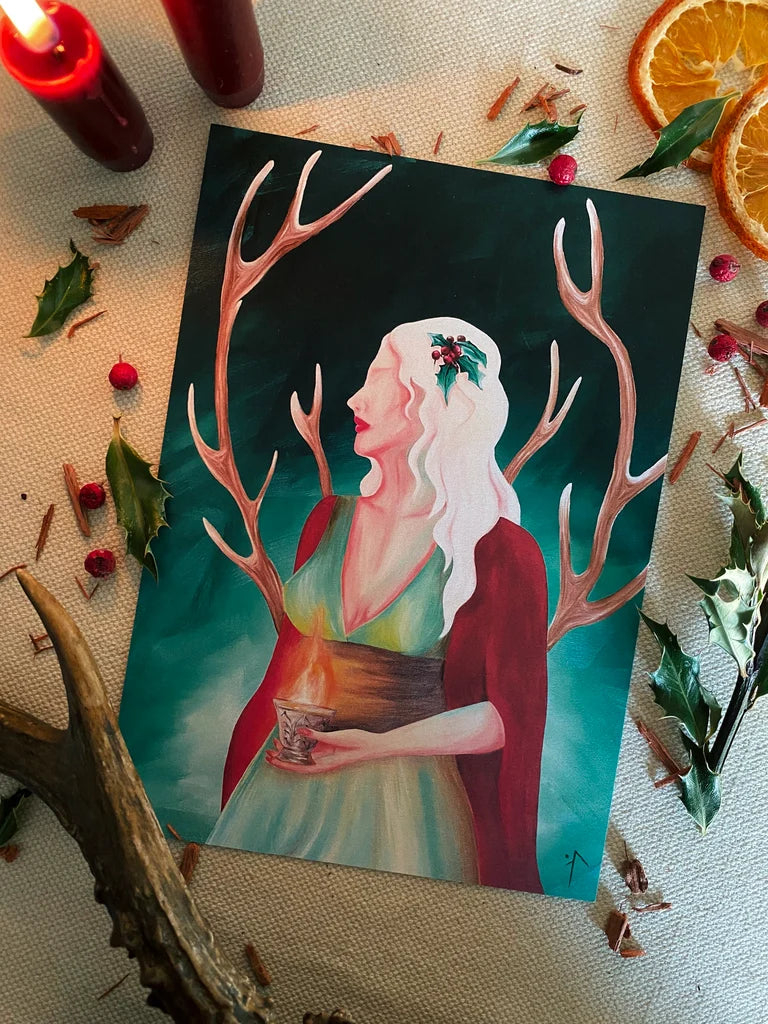 Dans les terres oubliées où le temps se fige, régnait une souveraine mystérieuse, mi-femme, mi-esprit de la forêt. Ses longs cheveux, parés de houx, symbole de courage et de résistance. Son esprit, couronné de majestueux bois de cerf, symbole de son lien indéfectible avec les anciennes forces de la nature. Tenant dans ses mains un calice d’où s’échappait une flamme sacrée, elle veillait sur l’équilibre des saisons et le passage des âmes à travers les âges. Chaque solstice, elle invoquait les énergies du monde caché, nourrissant la terre de son pouvoir ancestral et illuminant la voie des âmes errantes.