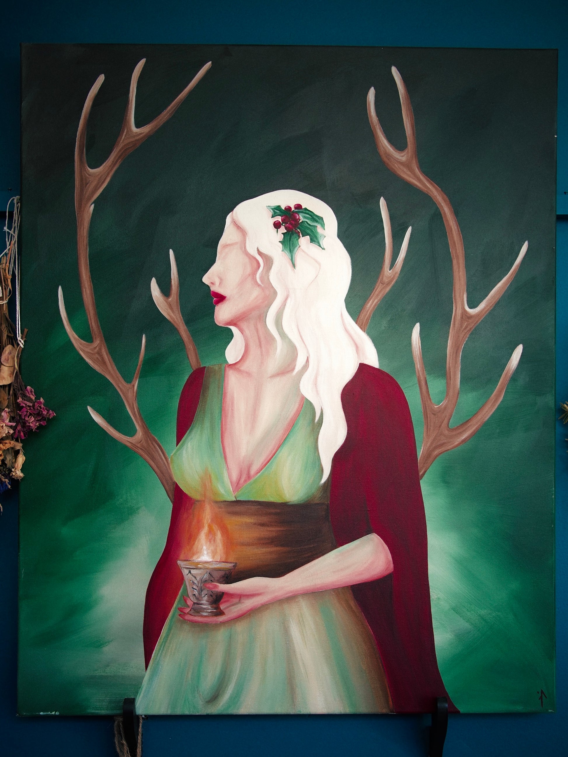 Dans les terres oubliées où le temps se fige, régnait une souveraine mystérieuse, mi-femme, mi-esprit de la forêt. Ses longs cheveux, parés de houx, symbole de courage et de résistance. Son esprit, couronné de majestueux bois de cerf, symbole de son lien indéfectible avec les anciennes forces de la nature. Tenant dans ses mains un calice d’où s’échappait une flamme sacrée, elle veillait sur l’équilibre des saisons et le passage des âmes à travers les âges. Chaque solstice, elle invoquait les énergies du monde caché, nourrissant la terre de son pouvoir ancestral et illuminant la voie des âmes errantes.